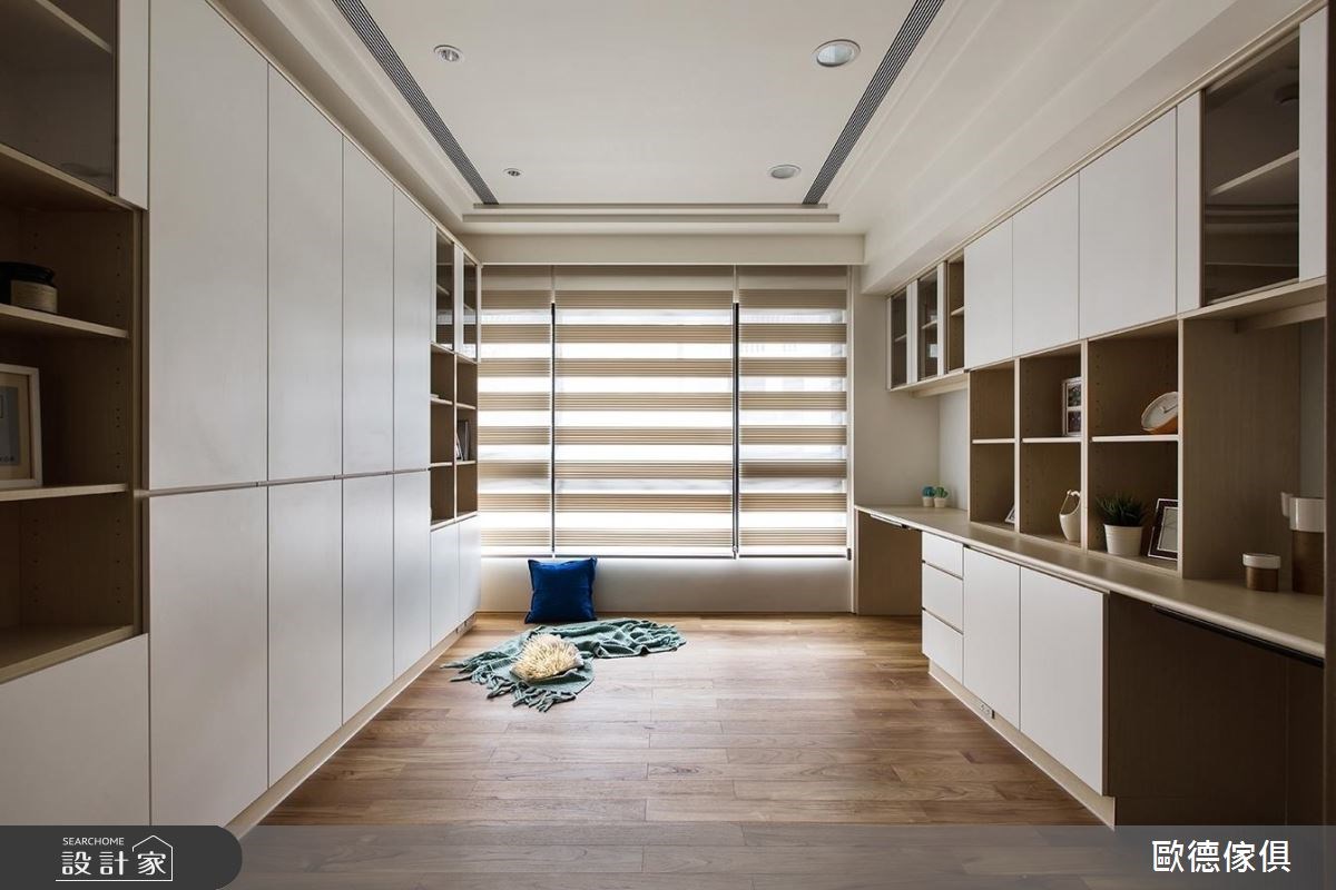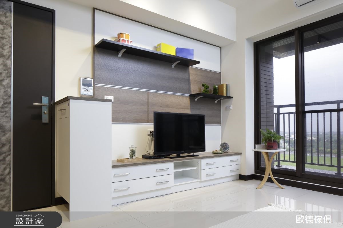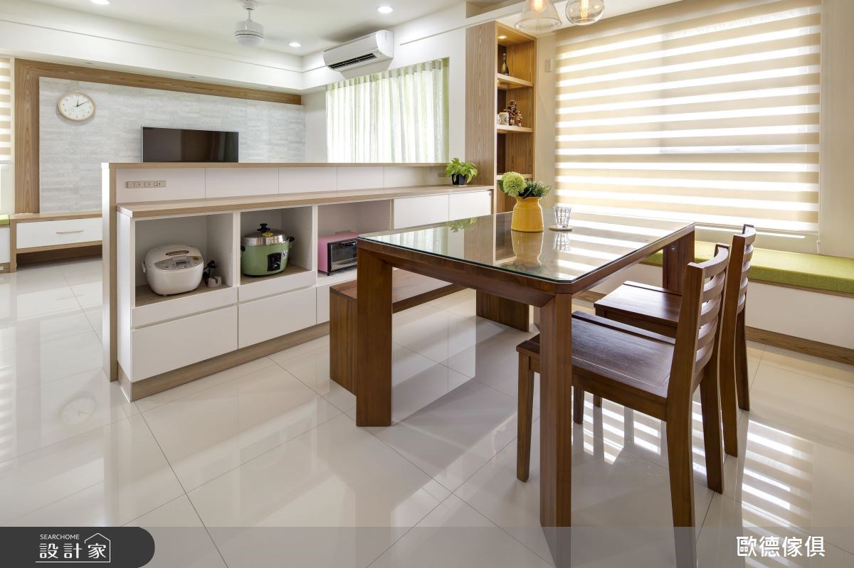 年輕的屋主夫妻面臨小孩剛誕生的喜訊,對於新家的環境特別找上歐德集團予以打造,空間設計上以寬敞明亮為訴求。邵柏凱設計師透過流暢的行進動線做為規劃,結合大面採光的優勢,讓公領域有開闊、放大一倍之感;考量小朋友長大後的日常所需,因此強化收納機能,讓系統櫃在空間裡發揮得淋漓盡致。 仿清水模的矽酸鈣版舖陳壁面,從入口玄關處一路延伸至客廳,穿過幾個收納櫃體,在淺色木紋與白色門扇收納櫃的搭配下,調和出清新、自然的氣息;壁面收納除了一般的鞋櫃,還有懸空的櫃體設計,兼具機能與美感展示的設計手法,令人為之驚豔!淡雅的木紋磚舖敘客廳地坪,空間裡則擺設符合人體工學設計的灰色皮革沙發、木紋茶几,電器櫃與一旁收納櫃造型相互呼應,替室內增添豐富的層次與表情,且調和出人文優雅的美學風範;電視牆以簡約的矽酸鈣版作為基底,無刻意的裝修、保留質材原始風貌,展現樸實、大器之姿。 小編的最愛:第一次走進空間裡,還以為沒有餐桌區,原來貼心的歐德集團將餐桌設計為可收納式,平時可收放在靠牆處的櫥櫃內,讓空間更顯開闊,需要使用時再拿出來即可,完美提升居家生活的坪效使用。