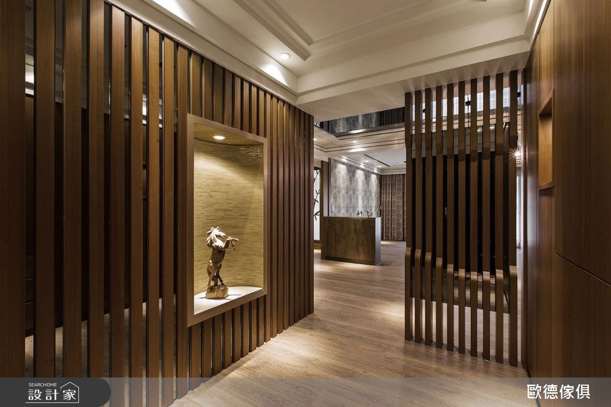 低調奢美的質感輕灑室內,以黑色調勾勒出時尚質感,木紋質材鋪陳地板,以及系統板材打造的家具家飾,大地色系的視覺呈現,形塑沉穩氣度。 入室後的玄關以陶瓷烤漆門板打造鞋櫃造型,中央以S型溝槽描繪出開關櫃體的把手著力點,將實用功能以美形包裝;灰玻造型坪隔則成了內外領域的分野,結合串珠簾子的視覺層次,營造出優雅質感。以開放式格局規劃客、餐廳,讓空間更顯自在流動,低矮的電視牆界定出客廳與休閒區域,坐在沙發上,可一眼欣賞休閒領域壁面上的交叉紅酒格架,感受低調奢華的美學質感。電視牆後方的領域作為屋主平日休閒之用,無論是獨自小酌、閱讀或是招待三五好友共度愜意時光,電視牆的背面施以木作,搭配軌道裝置,創造移動式的桌面,讓屋主可依需求彈性運用;壁面上利用灰色調的壁紙,搭以W造型層架,一次滿足收藏佳釀與放置書籍的需求。 小編的最愛 餐廳裡打造一面兼具質感與溫度的餐酒櫃,結合系統板材設計出交叉紅酒格架,在鋁框玻璃櫃內還嵌入上下照明,背面以灰鏡襯底的手法,更展現低調奢美視感。