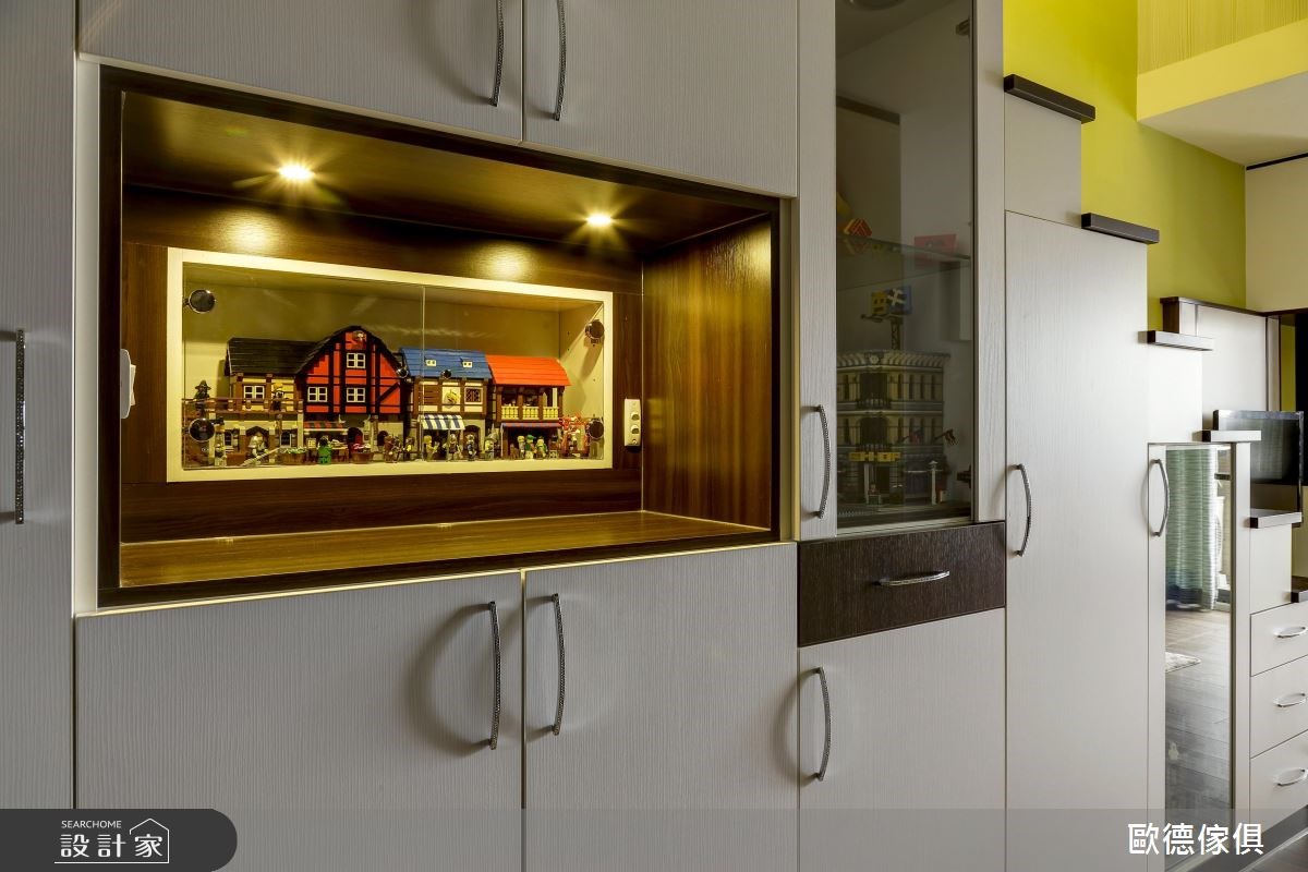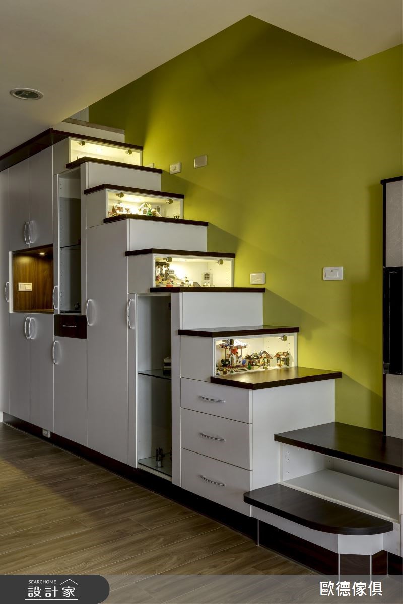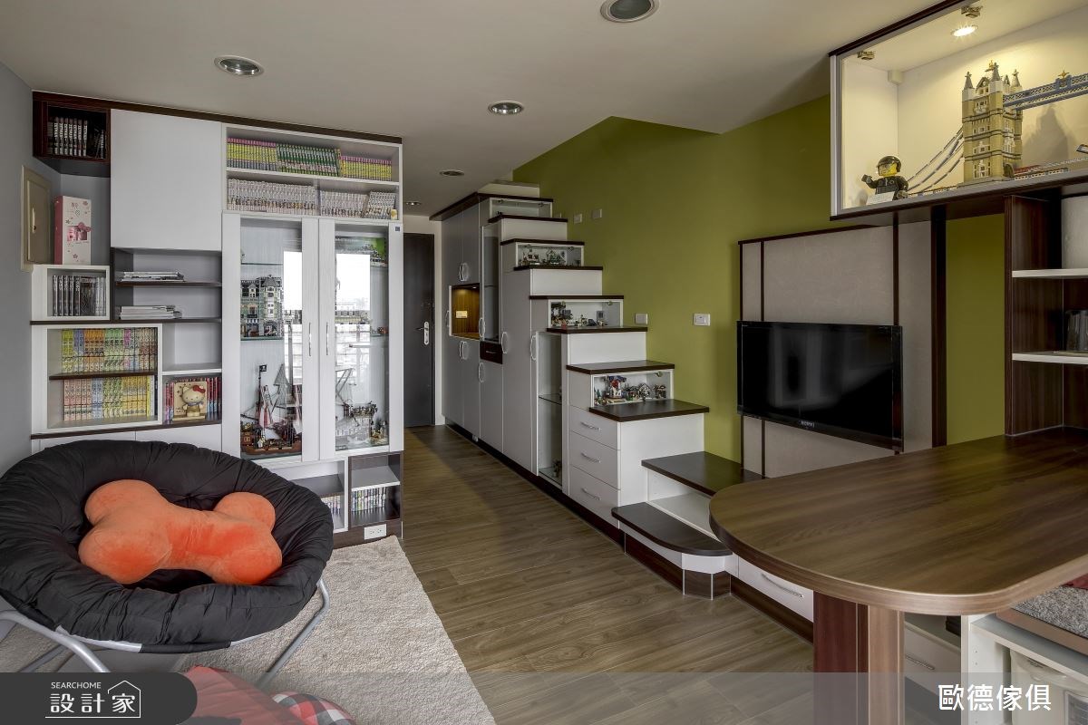 在這個16坪的小宅裡,不到百萬元的預算,僅利用系統櫃便能打造超強的收納機能,將屋主收藏的樂高與漫畫完美保留,且透過展示收納,妝點出獨特且別緻的風尚宅。 敞開大門,左側一整排的收納開始向內延伸,從鞋櫃、衣櫃到雜物收納櫃,串連起梯下整體空間,強大的收納機能收整繁雜物件,化繁為簡,讓室內更顯乾淨、清爽,而利用封閉與開放式廚櫃的結合,伴隨透亮玻璃與照明安排,創造出視覺層次之美;藉由白、綠色系為公領域的基底,且以愜意、休閒感的懶骨頭和休閒椅取代制式沙發,讓小空間顯得開闊、自在,營造出清爽宜人的空間氣息;客廳領域裡,具有小孩王國美名的樂高玩具,陳列在一個個玻璃櫃裡,無論是電視牆上方、結合嵌燈的大型展示櫃,還是納入梯間的微型空間裡,創造出一處樂高展示藝廊,讓家洋溢著童趣與夢想;客廳另一側的櫥櫃,是保留原有櫃體,重新組合排列的落地櫃,擺放屋主收藏的漫畫與大型樂高玩具,隨著大小不一的層板配置,靈活且活潑的收納手法,營造出滿滿的生活樂趣。 小編的最愛: 綠色的主體牆同時兼具電視牆、樓梯、收納與餐廳空間,乾淨、清爽的配色讓視覺不顯凌亂,玻璃櫃內展示的樂高玩具,注入趣味、活潑的空間氛圍。