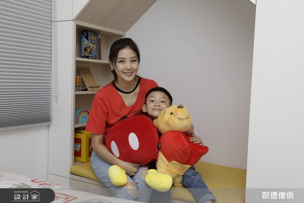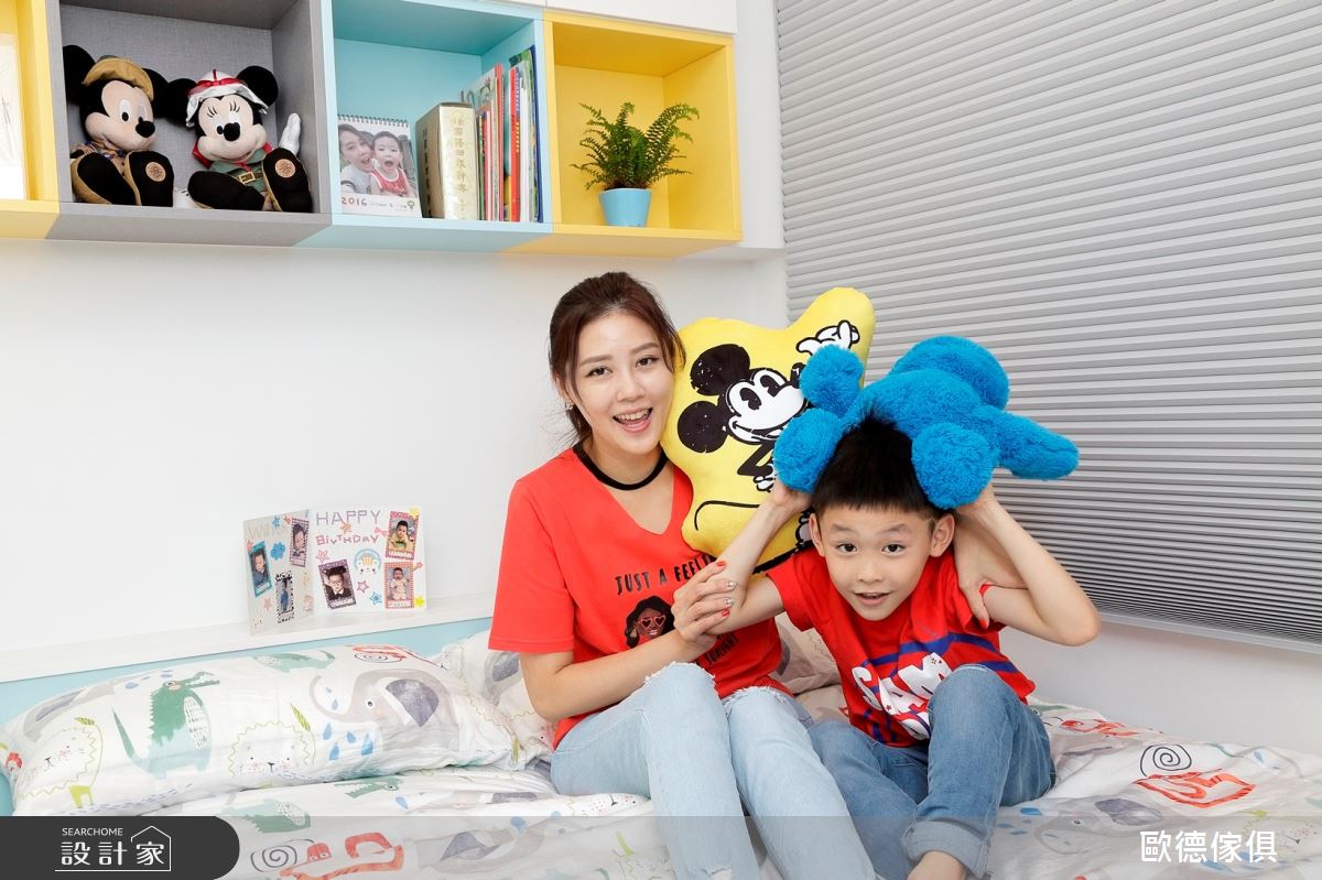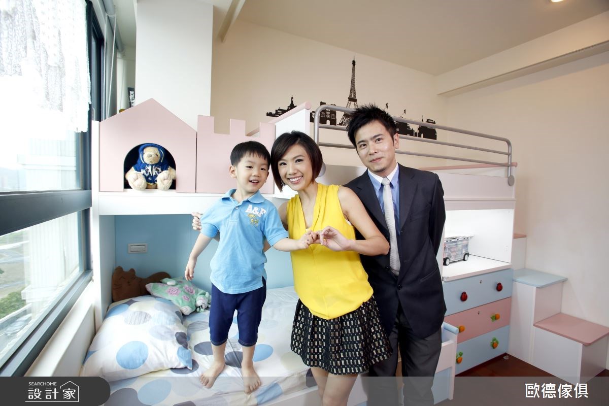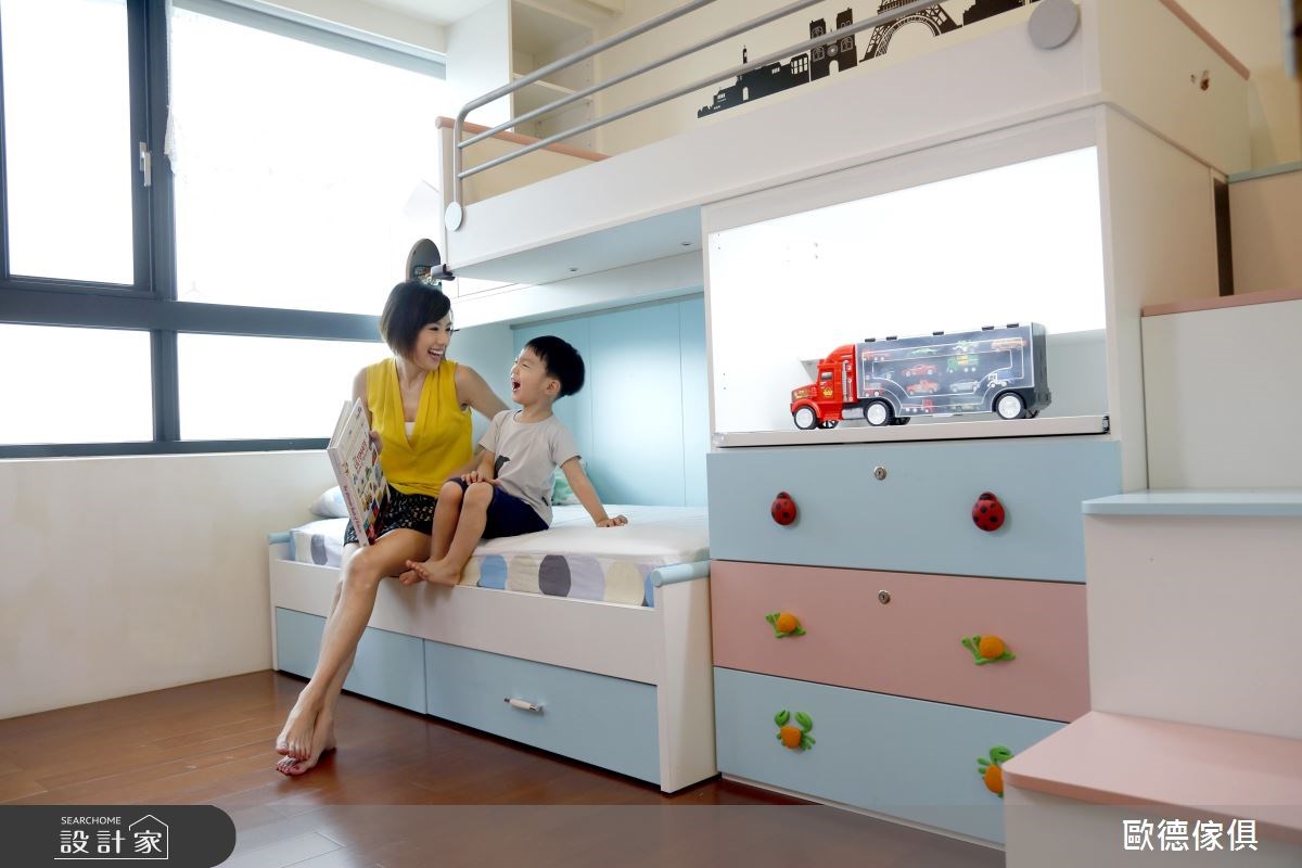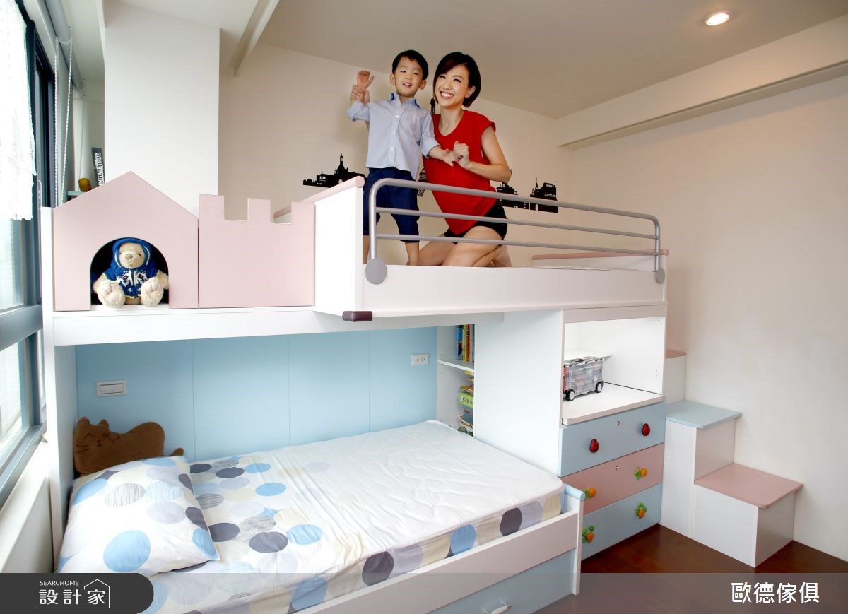 廖盈婷主播家中的 3 坪小房間,不僅是兒子的兒童房,也是兩夫妻的工作書房,必要時,更可當作親友的休憩客房使用,整體給予現代風定調,且加入高度彈性、環保無毒的系統家具,打造出讓主播一家均滿意的空間視野,快跟著小編一起來看看吧! 空間選以天空藍色做為主調,搭配著清爽粉紅的調和,展現童趣質感,並因應孩子大量的書籍、玩具收納需求,讓房內的每個角落都巧妙地置入收納功能,像是子母床的上下階梯、床下的抽屜等處,接暗藏了實用的櫃體機能,並搭配城堡造型收納箱,兼具童趣與置物功能,另外考量孩童安全,在階梯處加入圓形導角,並配置安全把手及緩衝滑軌,避免孩童於空間中碰撞受傷;同時,於書桌前方牆面規劃具磁性的塗鴉牆,採以天藍色為底,可作為孩子的塗鴉板與大人的留言記事板,讓成長中的孩子可盡情發揮美感,在此留下天馬行空的創意圖繪! 小編的最愛 透過歐德的專業服務,嚴選低甲醛綠建材,並給予快速的系統家具施工,成功讓 3 坪小房間變身高 CP 值多功能間,完成安全、環保、健康的夢想生活!