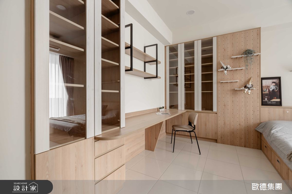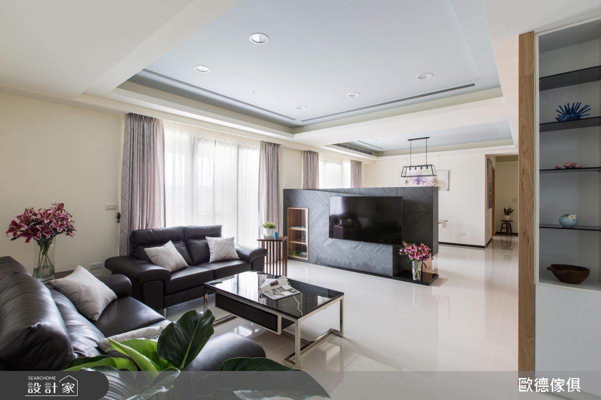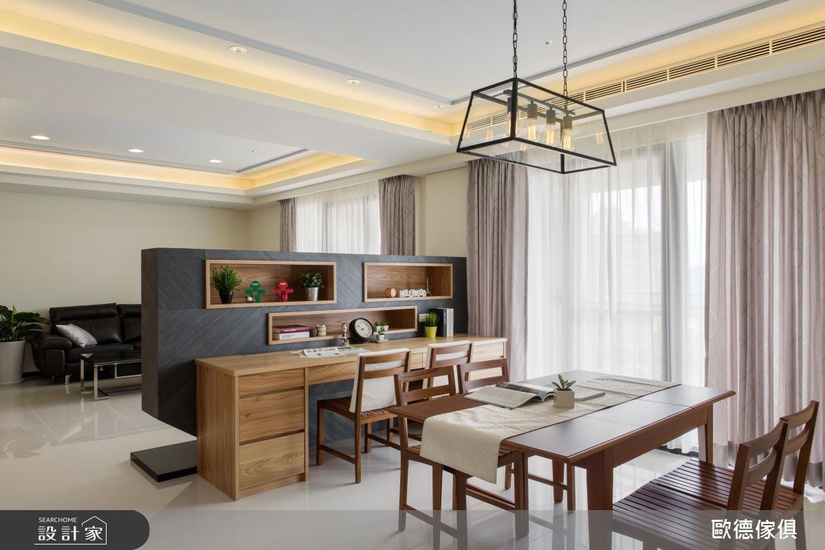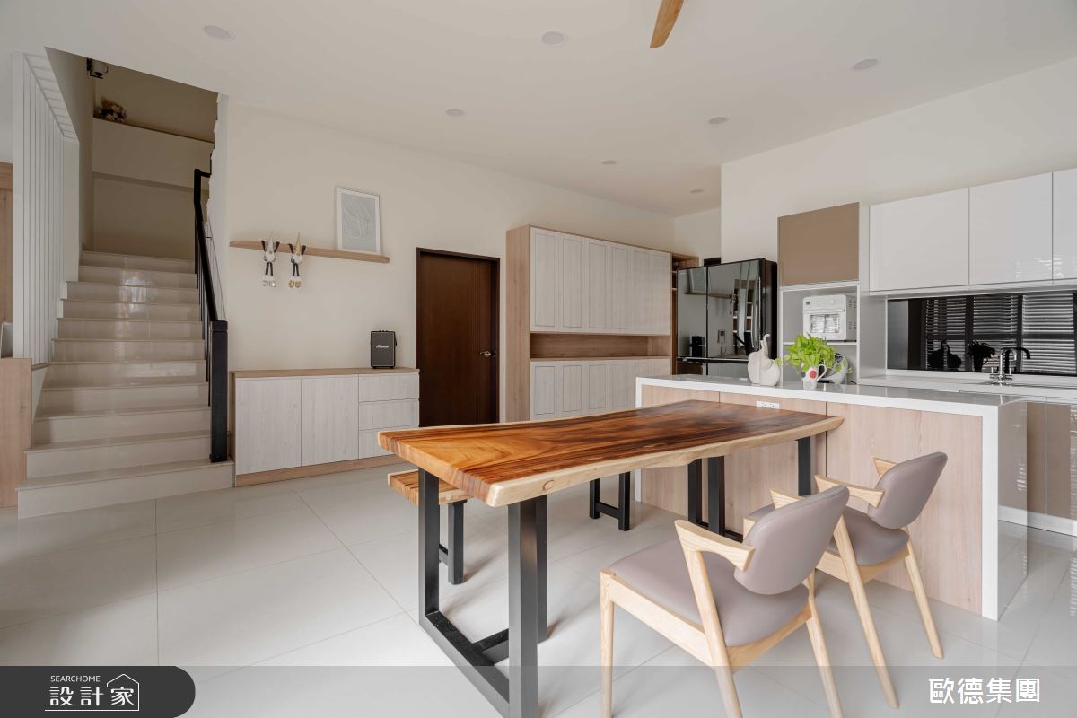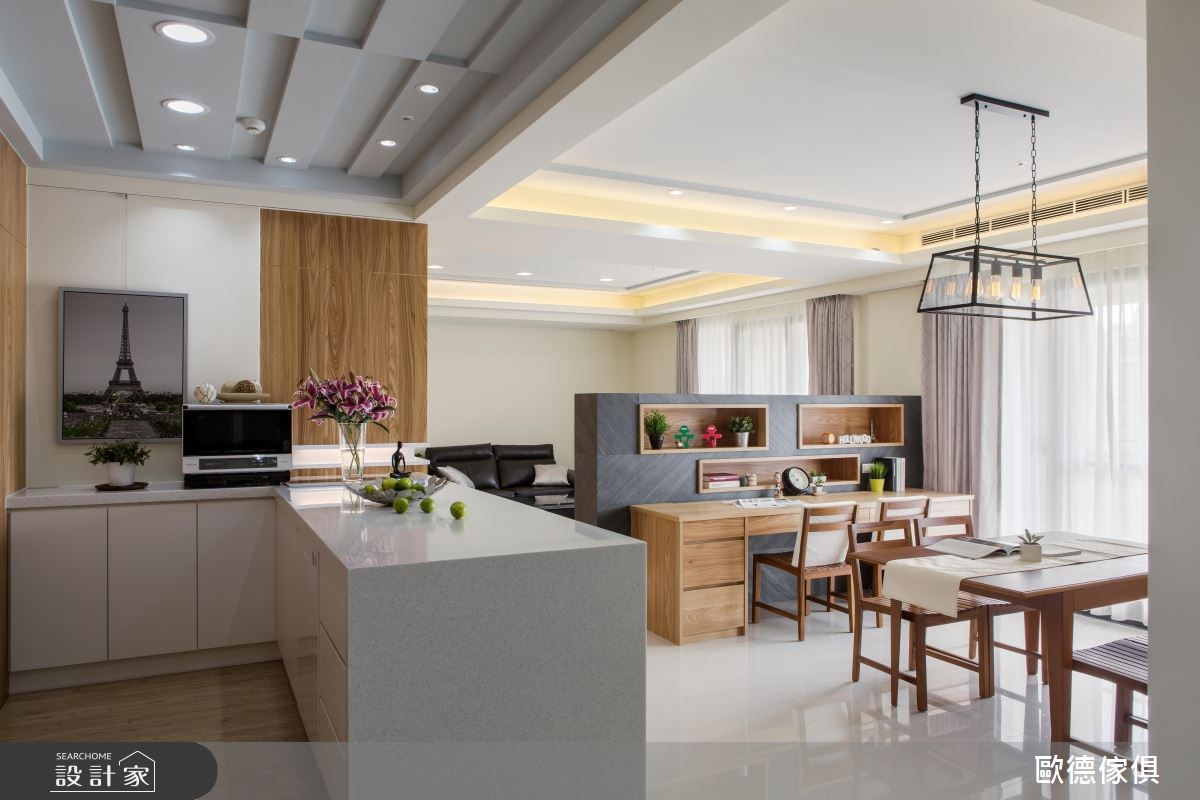 屋主夫妻首次添購大宅,將兩間四房格局的房子打通後,整體規劃成一家人所需的居家型態,進一步考量孩子未來成家立業的需求,只要微調格局,即可創造獨立且機能完整的雙世代宅,可說是兼具現代與未來的風格居所。 善用木紋與簡潔雅致的配色,調和出溫馨且寬敞的居家氛圍,讓長期在外工作的屋主,一回到家便能卸下繁瑣俗世,療癒身心;雙面電視牆成為室內焦點,轉化為客、餐廳領域的分水嶺,而不置頂的牆體設計,營造出開放、流動的室內氛圍;電視櫃除了具備一般影音設備,背面轉為屋主家用的辦公領域,牆面嵌入木作開放櫃體,隨著風格物件的多元展示,加上後方原木餐桌椅的配置,調和出溫潤、自然的人文氣息,創造一家人最愜意的日常情景;廚房以浪漫的鄉村風為走向,展示與收納兼具的酒櫃門板飾以歐德集團的嶄新綠色系,點亮視覺丰采,一旁搭配現代風的質感中島,以及簡約風情的畫作,挹注清新、自然的生活況味,讓人愛上烹調與享用佳餚、午茶的時光。 小編的最愛:在餐廚區裡增設吧台區,可成為三五好友料理或談心的絕佳領域;也成為未來與孫子們共享天倫之樂的領域,一起實踐種種日常的活動或娛樂。