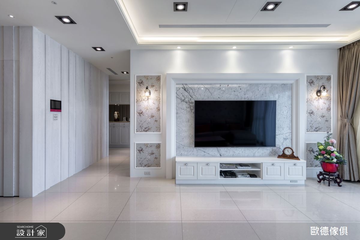 買下同層兩戶的屋主,希望與兒子、媳婦就近同住,享有三代同堂的幸福,因此找上曾合作過的歐德設計團隊操刀設計。透過優雅白色調的鄉村風創造屋主夫妻倆的宅邸;兒子家則以大地色系描繪出溫暖現代質感,讓我們一同走進來瞧瞧。 屋主家透過大量的白色線板結合木紋系統家具,譜出明亮、素雅的玄關風尚;左側以刷白的鋼刷木皮做為門扇,隱藏大量的收納機能,強化生活實用度。客廳電視牆襯以淡雅紋理的石材,結合立體感線板框出視覺焦點,兩側以壁紙、古典玻璃壁燈點綴,調和現代與鄉村風氣息;餐廚領域合併,餐桌兩側以白色系統櫃串連展示與收納機能,穿透感的玻璃材質更營造輕盈視感,有效放大空間。兒子家的入口玄關,則透過自然木紋的妝點,挹注溫潤質感;寬敞的公領域裡,電視牆以帝諾大理石打造,引入俐落、非凡器度;沙發背牆以鋼刷柚木皮板結合不規則間距的鍍鈦壓條,且延伸至餐廳領域,轉化為小孩與傭人房的門片,營造出視覺層次與變化;餐廳空間裡,讓淺色木紋的櫃體創造出收納兼具展示的大型櫃體,黑色線條則描繪出深度與美感層次,令人驚豔。 小編的最愛 歐德設計團隊擅長營造各種風格,透過系統家具多變與時尚的特性,不僅滿足空間的實用收納,更可依照屋主對美感的各種需求,量身訂製專屬風尚。