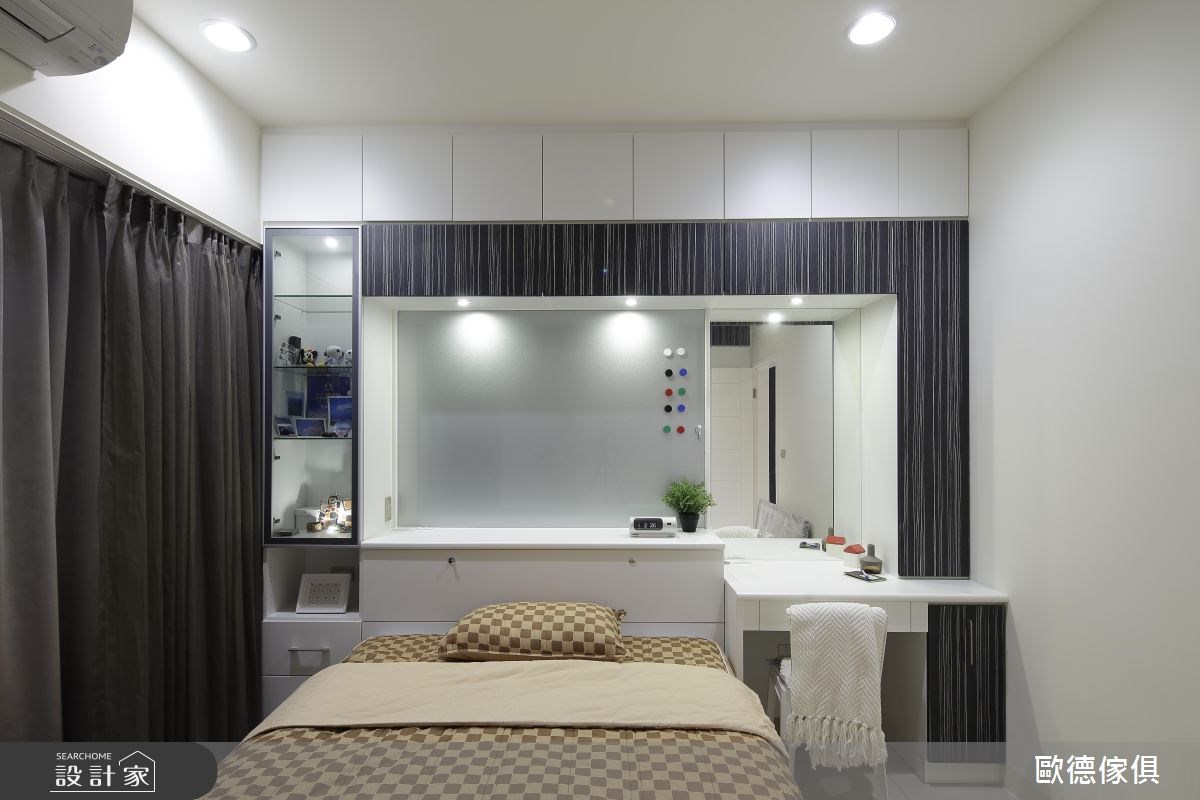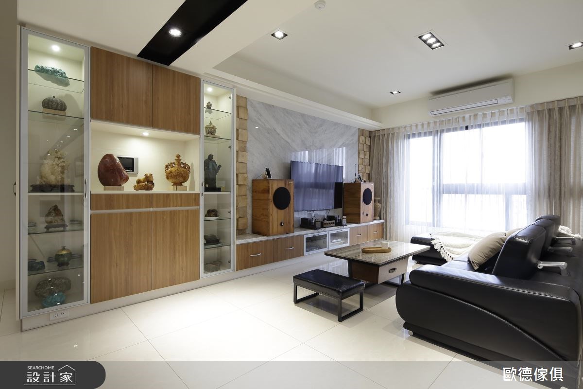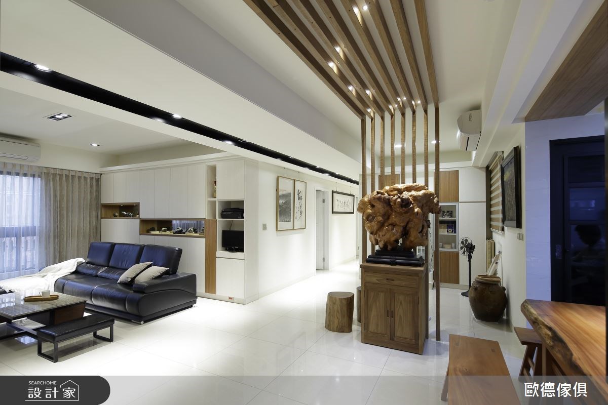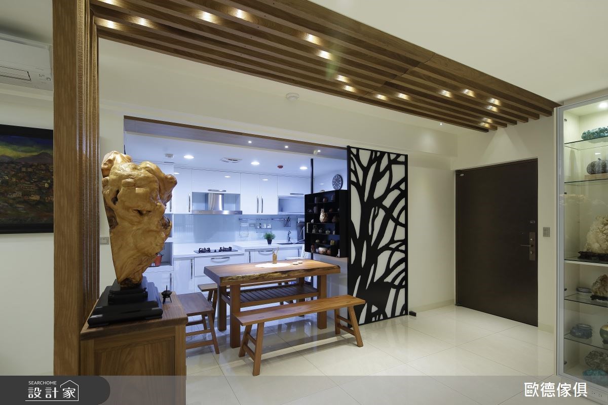 居家空間裡揉合檜木與石材兩種迥異材質,交織冷暖特性的元素,在保有自然溫潤的同時,又展現深刻的立面表情,堆疊出雅致的東方風情;室內同時佈滿系統傢俱的傑作,一次滿足收納、展示、試聽,以及閱讀等機能,將系統家具的運用發揮的淋漓盡致;加上屋主鍾情於木雕與茶藝文化,擁有多年收藏的美學逸品,屋主陳列於空間裡,融入居家風格之中,創造出豐富的美學靈感。開放的公領域裡,廊道的天花板存在結構大樑,巨型量體的表面勾勒一條深邃溝縫,直抵走廊盡頭,串連起公私領域。電視牆以木紋板材、淡灰色大理石材以及檜木切塊,堆疊出自然且壯闊的造型;沙發後方擺設整排收納櫃,虛實相兼的系統櫃體,結合展示平台的設計,創造出生動的空間表情;從大門口開始,架起一道門拱造型的格柵,來自苗栗三義的柚木質材,不僅散發非凡質感,更彰顯東方氣勢,且成為客廳與餐廚的過渡地帶;餐、廚領域以開放格局呈現,廚具與餐桌藉由平行式的擺設,形塑無礙的視覺互動,讓客、餐廳與廚房三者領域得以相互交流,增進家人間的情感溝通。小編的最愛:臥室空間裡,透過不同風格與色系的妝點,創造高度收納機能,結合五金、細緻的門板等細節,滿足一家五口對於睡眠環境的需求。