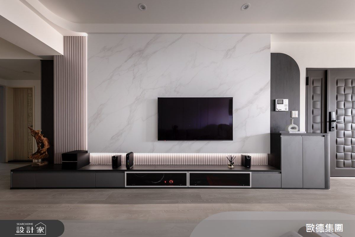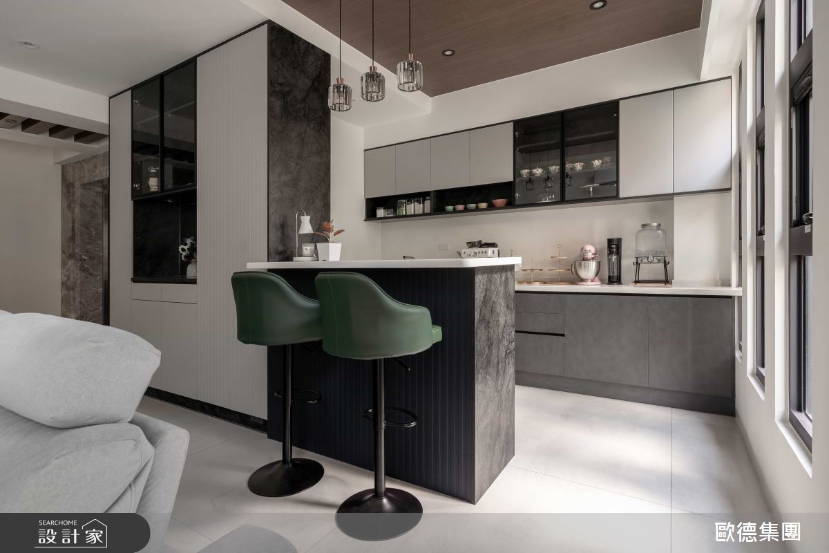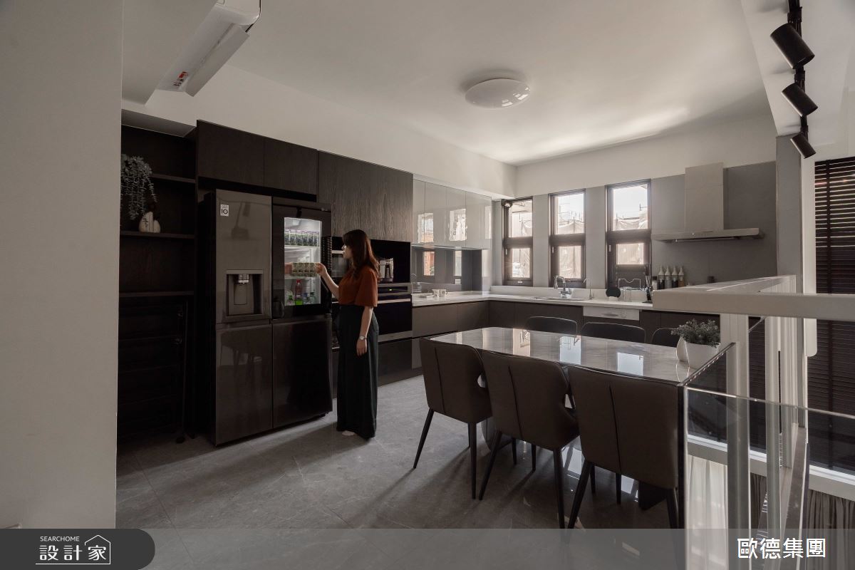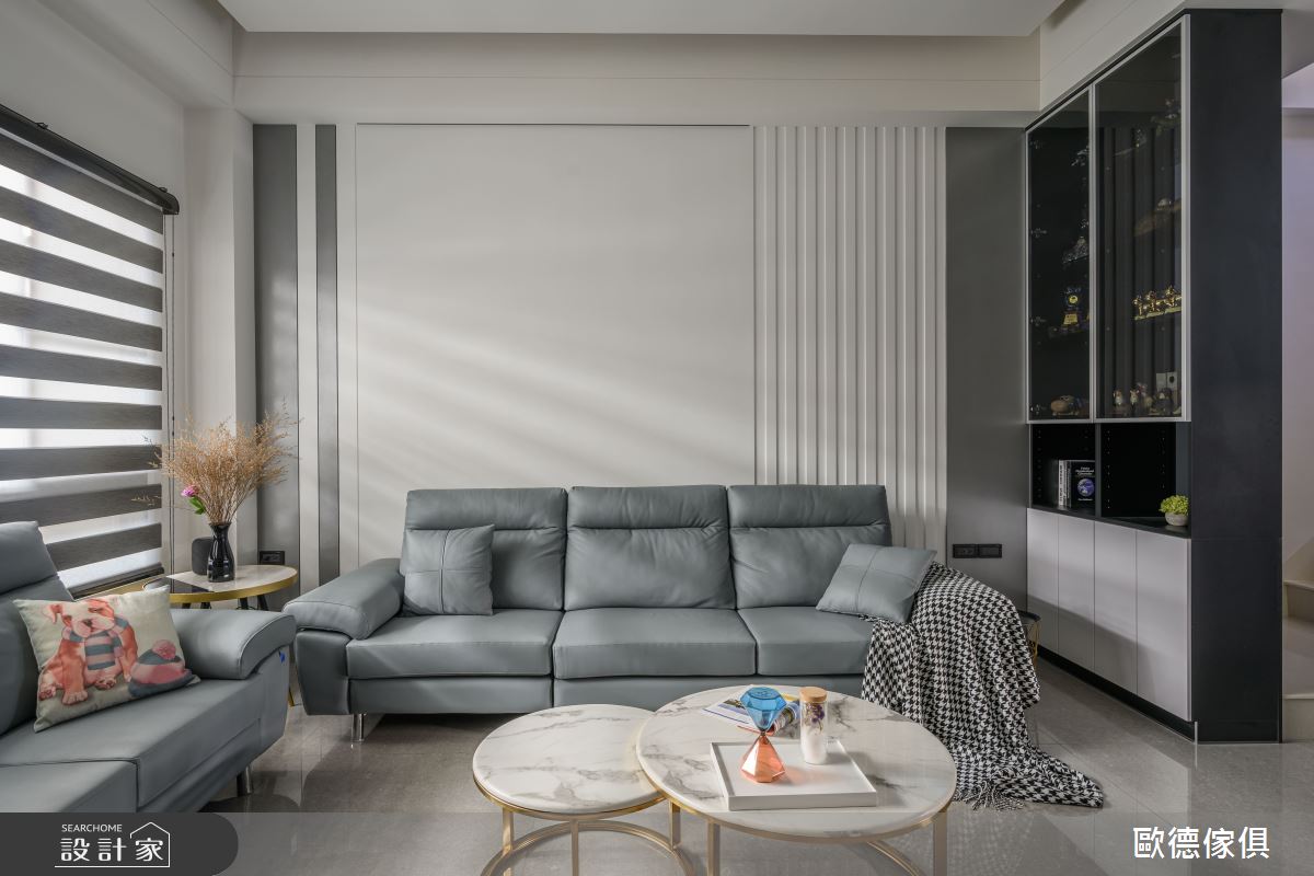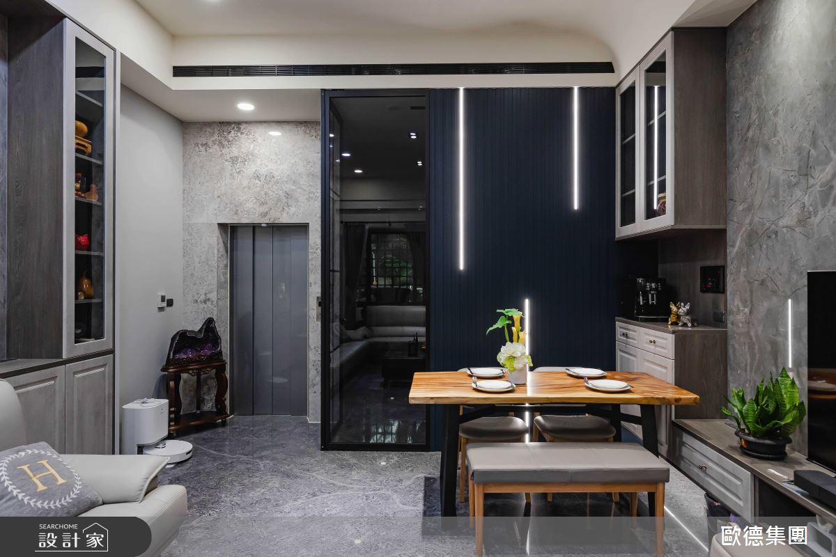 來自歐德傢俱設計團隊的70坪現代風住宅案,屋主一家人共有2位大人、1位小孩,是一間樓中樓新成屋(5年以下)的四房格局,設計師藉由建材以歐德系統傢俱、軌道燈、格柵、鋁框、磁磚、人造石的搭配應用,實現一家人的理想生活。