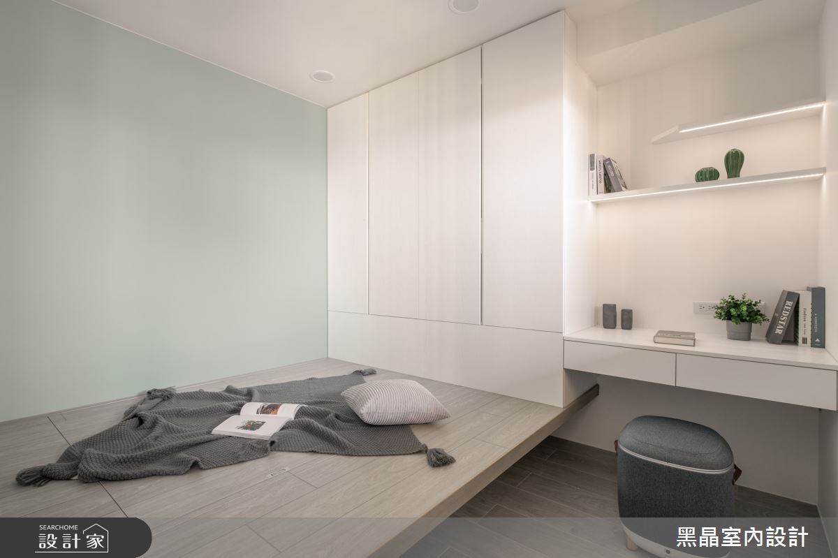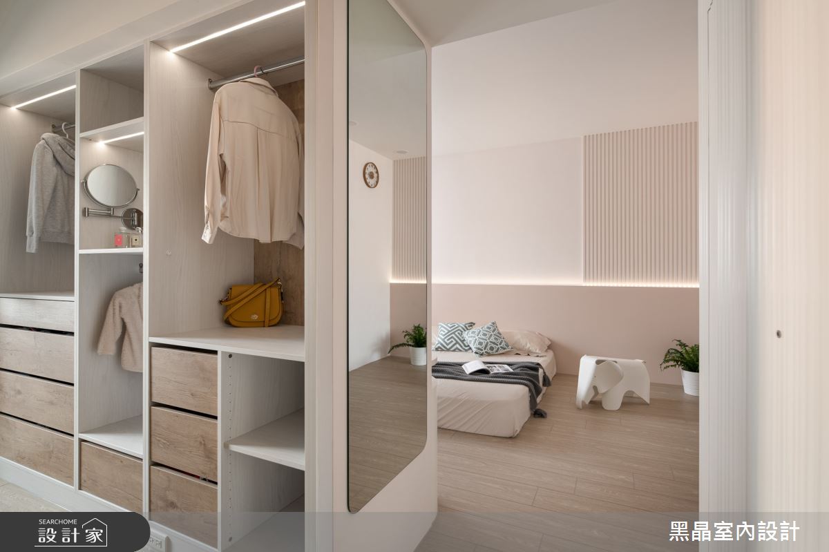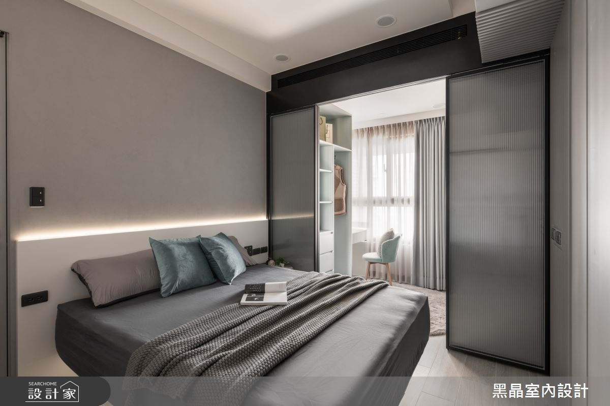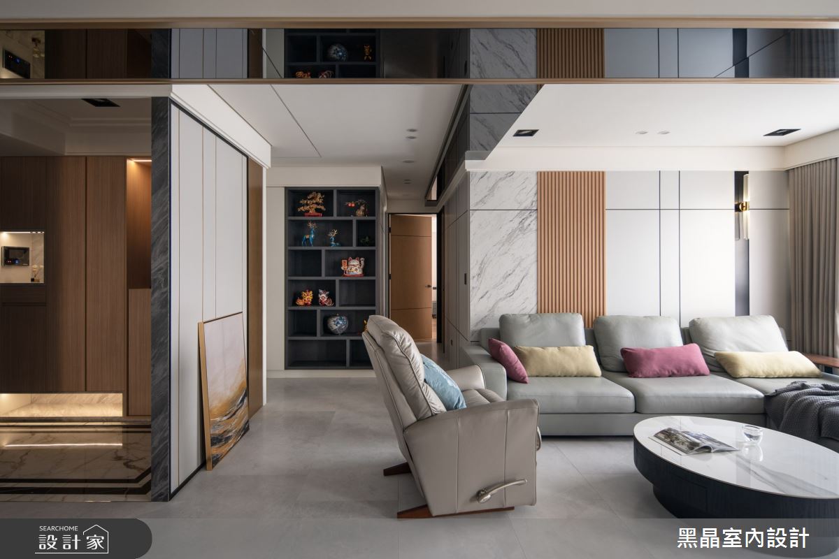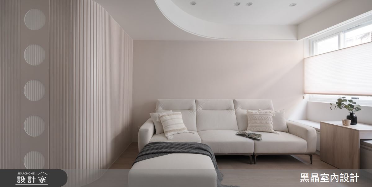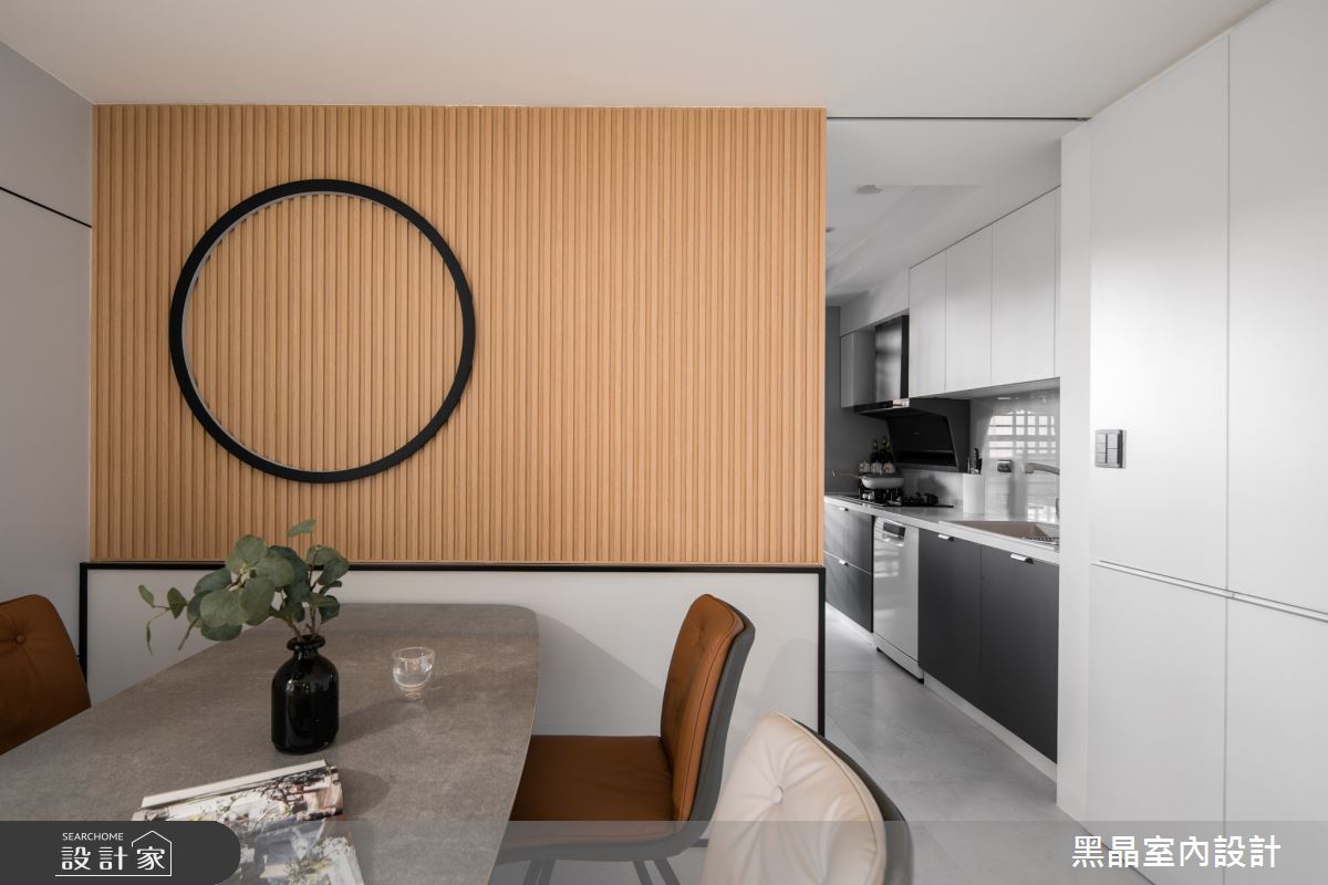 黑晶室內設計以乳膠漆、木紋磚、鐵件、烤漆、進口磁磚、美耐板、系統櫃、黑鏡、明鏡、長紅玻璃、烤漆玻璃、馬來漆、SPC石塑地板的搭配應用,呈現現代風居家氛圍,將此間14.5坪、兩房、單層、新成屋(5年以下)打造成舒適愜意的家庭空間,完成2位大人全家人的夢想之居。
