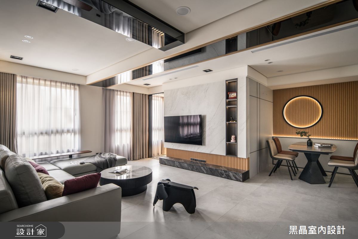 黑晶室內設計以大板磚、進口磚、系統櫃、鐵件、灰鏡、茶鏡、長紅玻璃、乳膠漆、馬來漆、烤漆的搭配應用,呈現現代簡約風居家氛圍,將此間43坪、三房、單層、毛胚屋打造成舒適愜意的家庭空間,完成4位大人、1位小孩全家人的夢想之居。