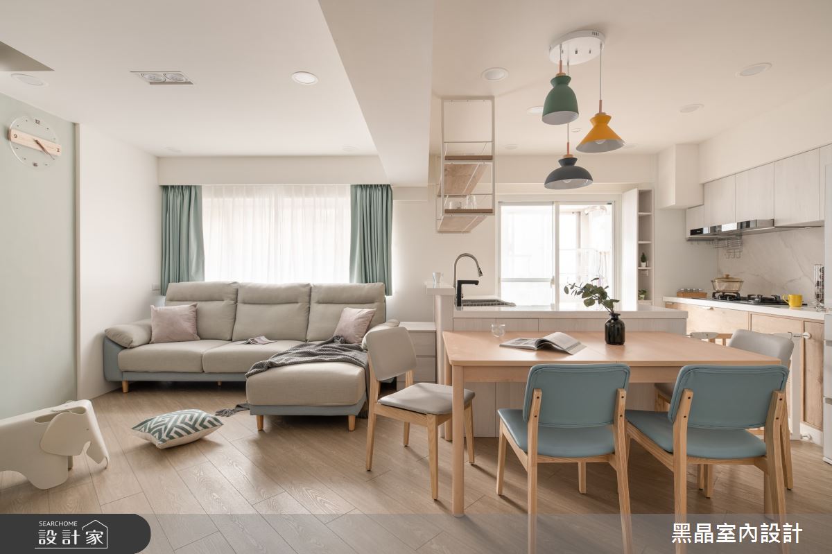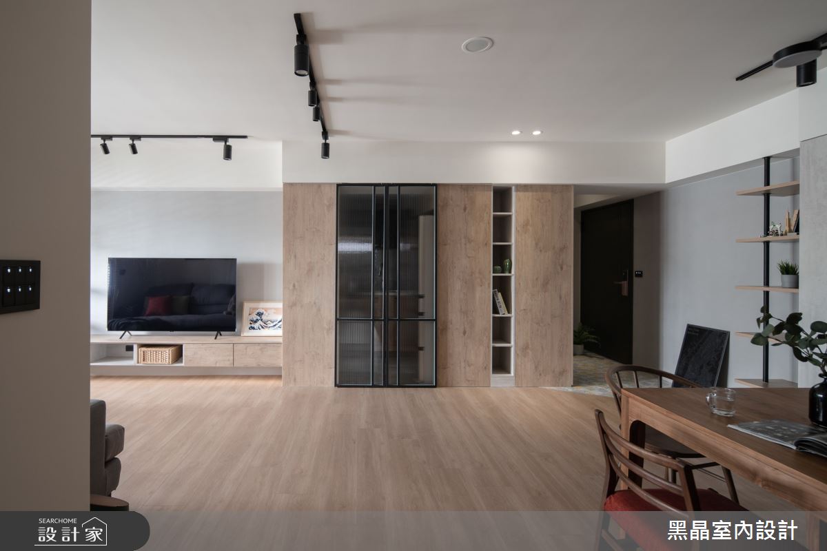 黑晶室內設計以大板磚、進口磁磚、系統櫃、鐵件、烤漆玻璃、長紅玻璃、水波紋玻璃、乳膠漆、馬來漆、烤漆的搭配應用,呈現北歐風居家氛圍,將此間30坪、三房、單層、老屋(16~30年)打造成舒適愜意的家庭空間,完成2位大人、2位小孩全家人的夢想之居。