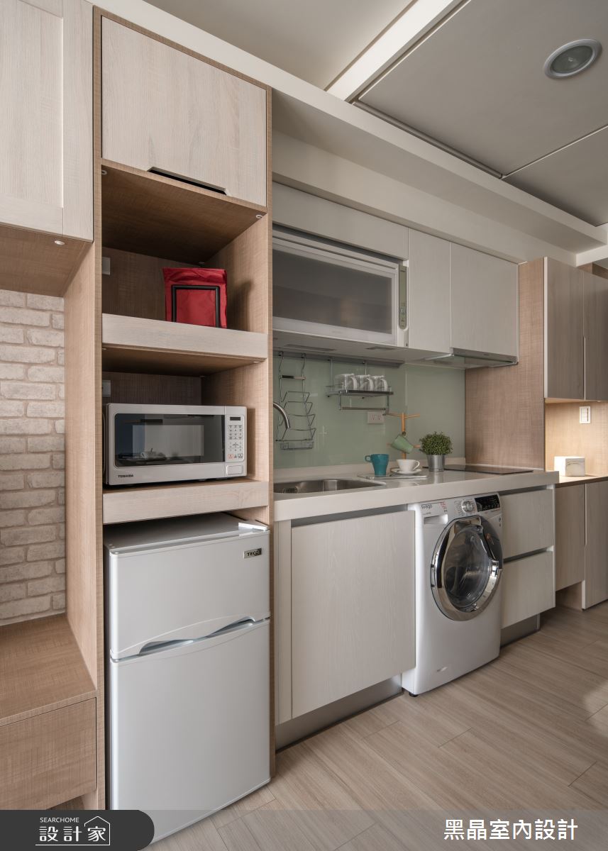 公領域以舒服的米色調鋪陳,在設計上面臨空間有限的考驗,於是向上延伸尋求更多空間與機能,並增設量身訂做的系統櫃體,達到兼顧機能與美感之效。 在微型空間裡,藉由透視感的玻璃質材,營造出視線延伸之感,像是客廳的電視牆結合鏡面,通透的質材呈現,帶來視覺的延伸,而壁面再結合簡約美感的仿磚紋壁貼,替空間帶來寬敞之意;客、餐廳僅透過吧檯些微界定領域,開放式的格局規劃,讓視線無阻隔,而吧檯區結合摺疊餐桌的方式,兼具用餐、備餐台,以及收納之用,創造機能與美感兼備的設計。臥室裡更善用垂直空間的運用,在床鋪下方結合書桌功能,同時也納入收納機能,激發小坪數宅居使用上的無限潛能。 小編的最愛 善用垂直空間來增拓機能設計,不但消弭橫向的視覺阻隔,且創造出垂直的動線,破除小宅思維,空間達到放大之效。