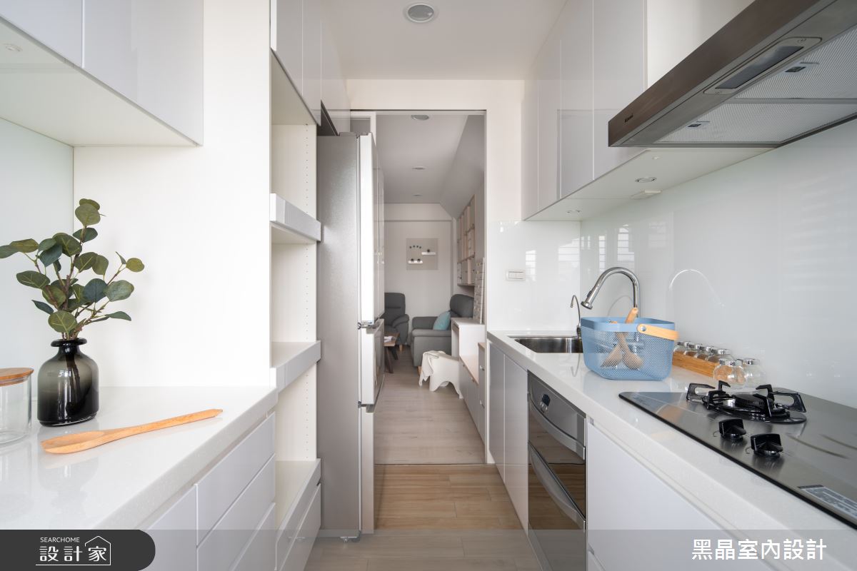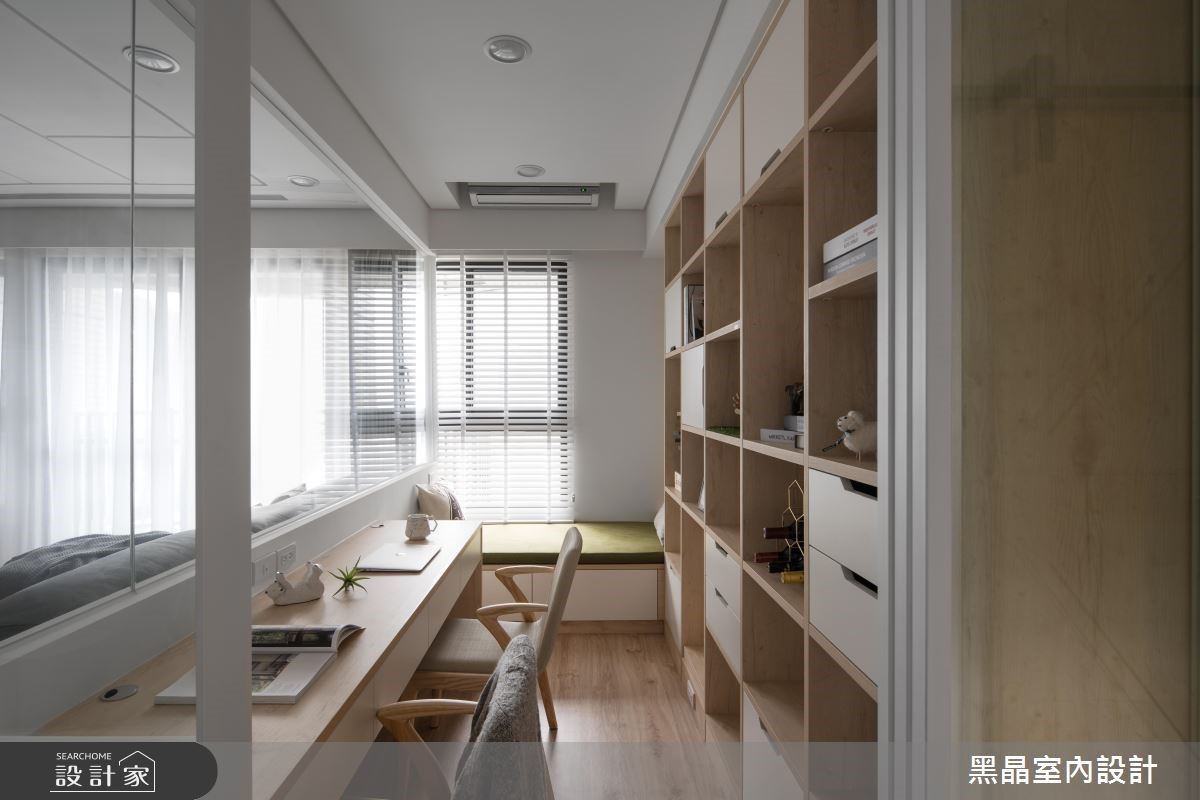 純淨的白佈滿整體空間,木紋肌理鋪敘地坪,傳遞愜意、溫暖的人文氣息;簡約感的軌道燈遊走在天花板,注入些許工業風質感,柔和的光源灑落在空間裡,層板上展示著公仔與牆壁上飾以動漫畫作,替簡單的居家環境增添創新靈感。 敞開大面落地窗後,將陽台處的新鮮空氣、陽光與綠意接引入室,讓家佈滿自然的味道;白色調的文化石成為電視牆造型,一旁藉由鐵件搭建起整面木作層架,上方擺滿屋主收藏的公仔,豐富的色彩與神情,傳遞獨特的個人品味;客、餐廳採開放格局,原木餐桌椅的擺設,挹注寫意自然的感受,並以拉門界定出廚房領域,可避免烹調美食時,油煙四溢到公領域的窘況,霧玻質材的門扇設計,讓客廳的光線能夠延伸到廚房裡,持續展現明亮光感;而依著天花板的大樑結構,沙發後方圍塑出開放式書房,壁面打造整面開放式櫃體,書本與風格物件擺放其中,一旁的臨窗臥榻區則佈滿玩偶,讓人一回到家,隨即感受到愜意放鬆的幸福感。 小編的最愛 臥室空間裡,藉由噴砂玻璃拉門,取代傳統的衣櫃門片,微亮光感透出內部的木質系統櫃,朦朧的視覺之美,傳遞日系的和風情境。