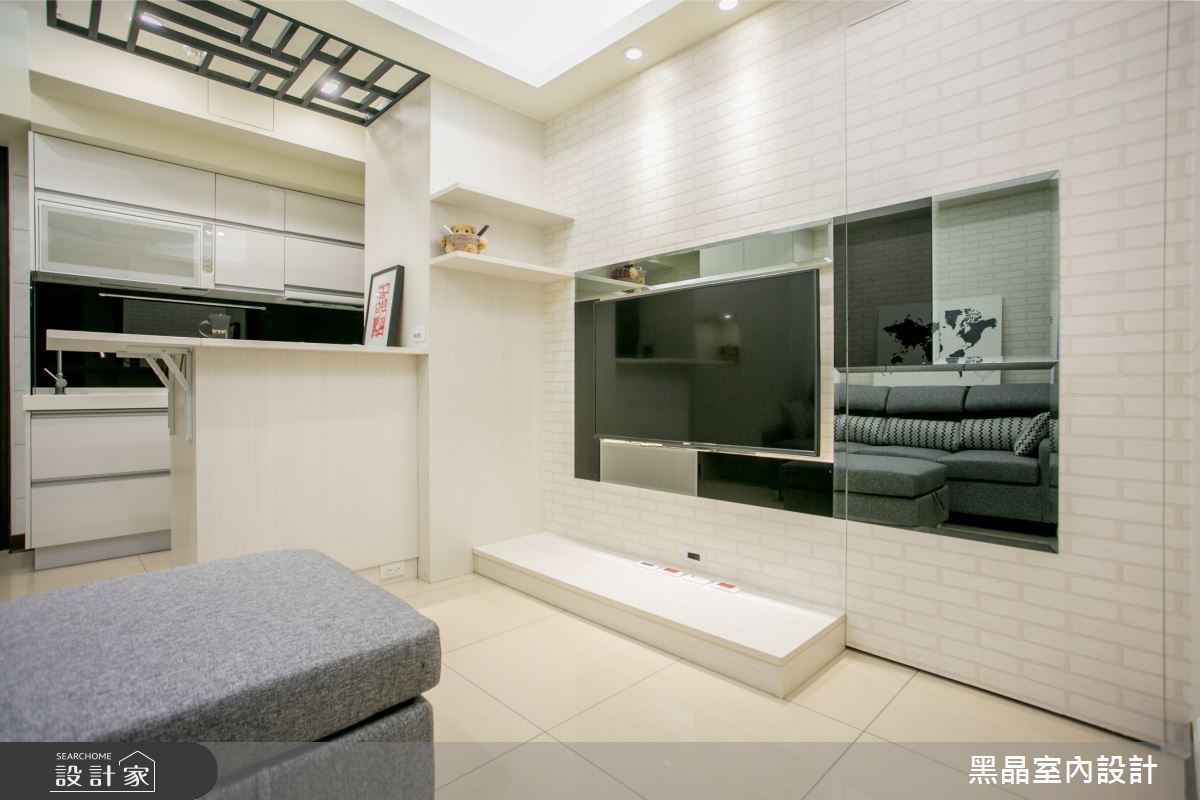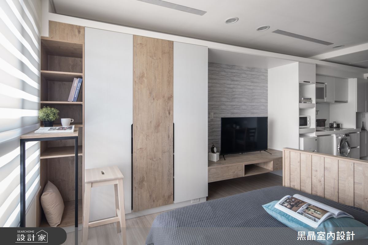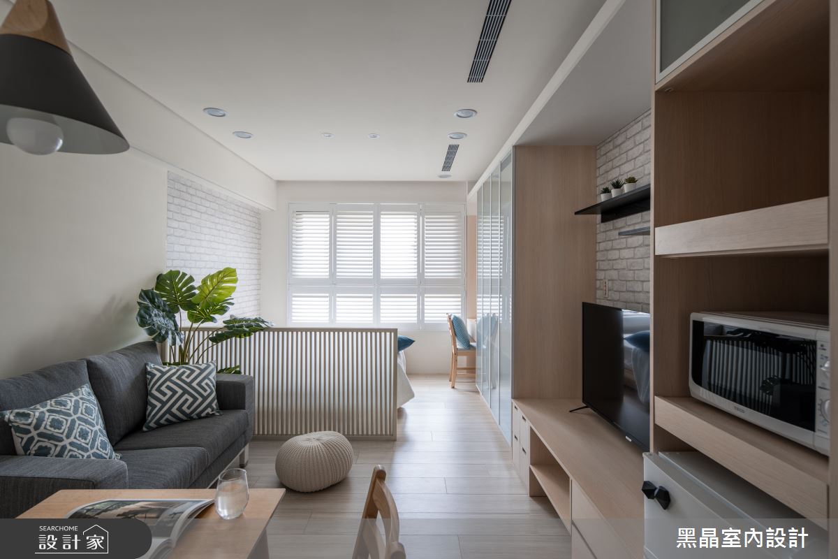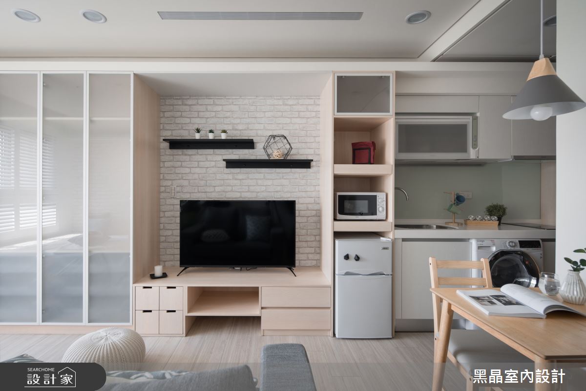 公領域以舒服的米色調鋪陳,在設計上面臨空間有限的考驗,於是向上延伸尋求更多空間與機能,並增設量身訂做的系統櫃體,達到兼顧機能與美感之效。 在微型空間裡,藉由透視感的玻璃質材,營造出視線延伸之感,像是客廳的電視牆結合鏡面,通透的質材呈現,帶來視覺的延伸,而壁面再結合簡約美感的仿磚紋壁貼,替空間帶來寬敞之意;客、餐廳僅透過吧檯些微界定領域,開放式的格局規劃,讓視線無阻隔,而吧檯區結合摺疊餐桌的方式,兼具用餐、備餐台,以及收納之用,創造機能與美感兼備的設計。臥室裡更善用垂直空間的運用,在床鋪下方結合書桌功能,同時也納入收納機能,激發小坪數宅居使用上的無限潛能。 小編的最愛 善用垂直空間來增拓機能設計,不但消弭橫向的視覺阻隔,且創造出垂直的動線,破除小宅思維,空間達到放大之效。
