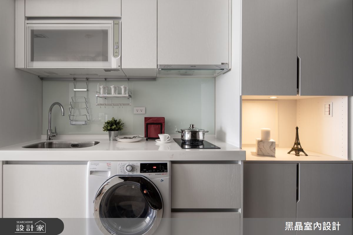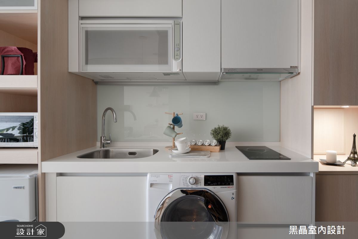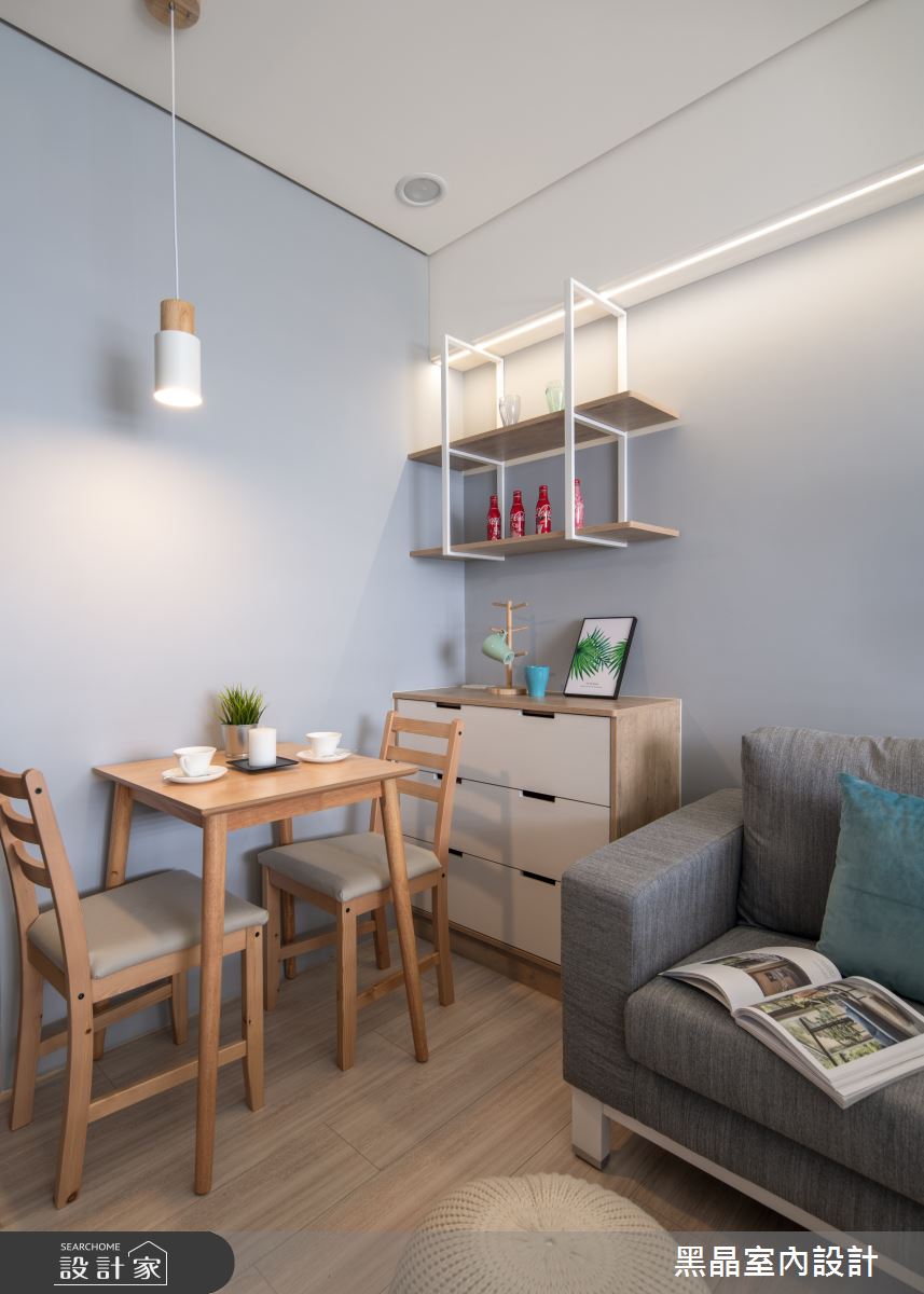 公領域以舒服的米色調鋪陳,在設計上面臨空間有限的考驗,於是向上延伸尋求更多空間與機能,並增設量身訂做的系統櫃體,達到兼顧機能與美感之效。 在微型空間裡,藉由透視感的玻璃質材,營造出視線延伸之感,像是客廳的電視牆結合鏡面,通透的質材呈現,帶來視覺的延伸,而壁面再結合簡約美感的仿磚紋壁貼,替空間帶來寬敞之意;客、餐廳僅透過吧檯些微界定領域,開放式的格局規劃,讓視線無阻隔,而吧檯區結合摺疊餐桌的方式,兼具用餐、備餐台,以及收納之用,創造機能與美感兼備的設計。臥室裡更善用垂直空間的運用,在床鋪下方結合書桌功能,同時也納入收納機能,激發小坪數宅居使用上的無限潛能。 小編的最愛 善用垂直空間來增拓機能設計,不但消弭橫向的視覺阻隔,且創造出垂直的動線,破除小宅思維,空間達到放大之效。