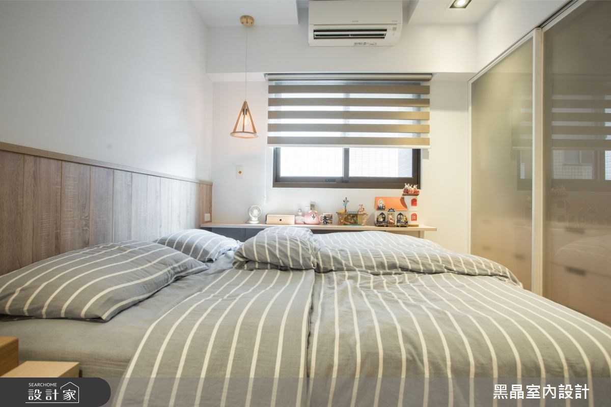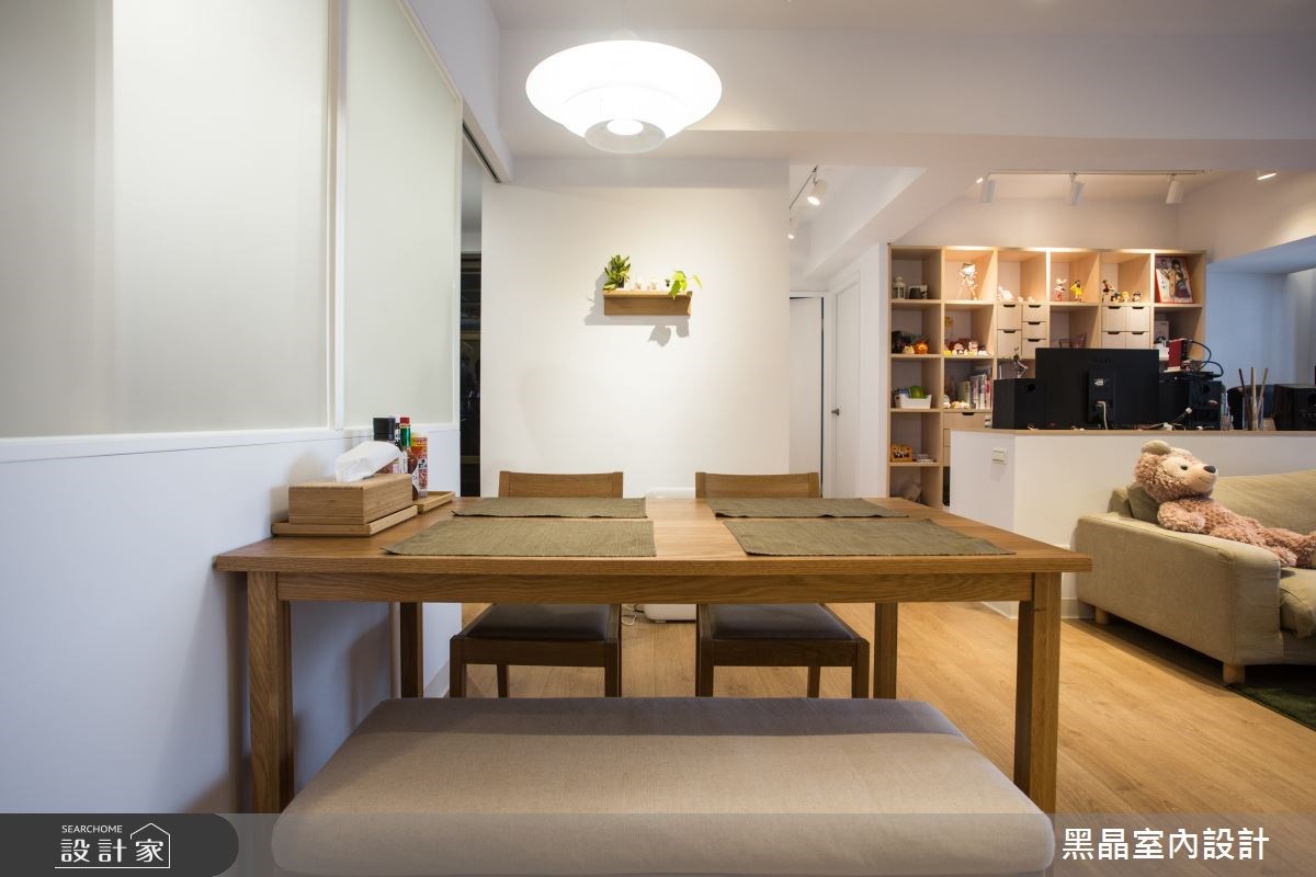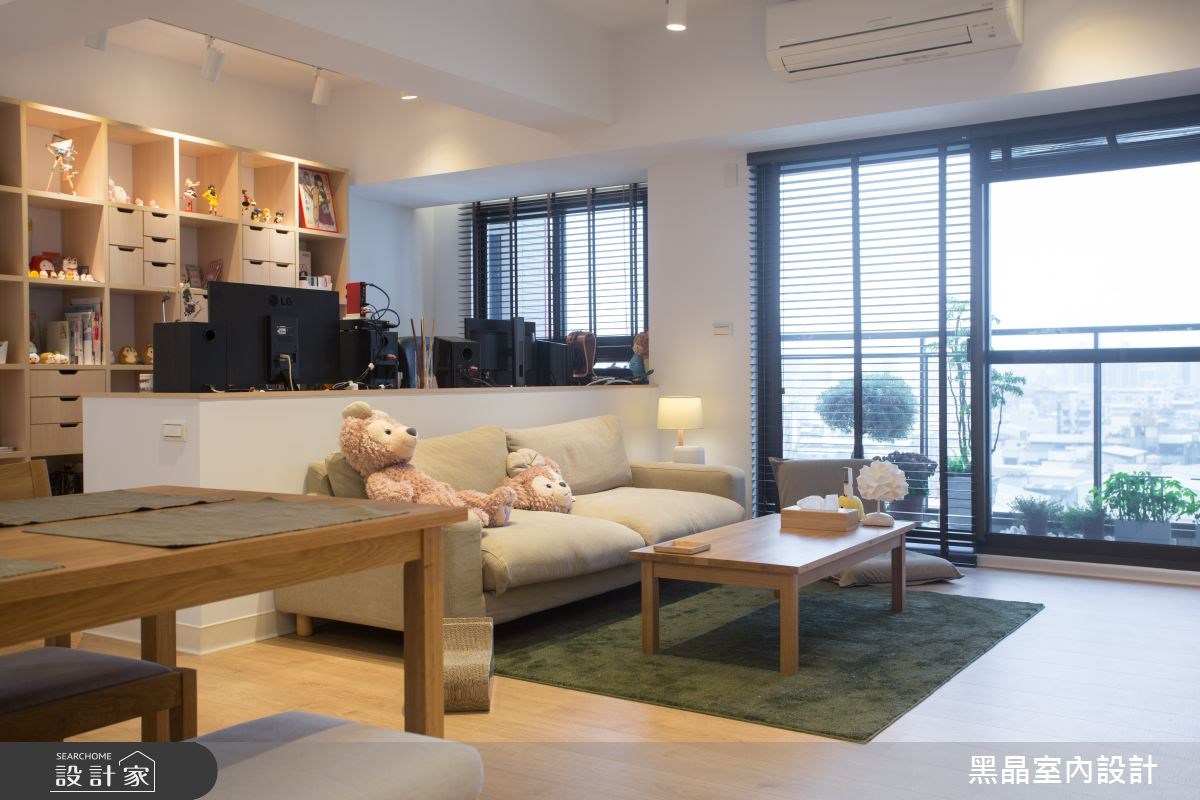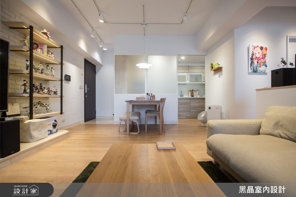 純淨的白佈滿整體空間,木紋肌理鋪敘地坪,傳遞愜意、溫暖的人文氣息;簡約感的軌道燈遊走在天花板,注入些許工業風質感,柔和的光源灑落在空間裡,層板上展示著公仔與牆壁上飾以動漫畫作,替簡單的居家環境增添創新靈感。 敞開大面落地窗後,將陽台處的新鮮空氣、陽光與綠意接引入室,讓家佈滿自然的味道;白色調的文化石成為電視牆造型,一旁藉由鐵件搭建起整面木作層架,上方擺滿屋主收藏的公仔,豐富的色彩與神情,傳遞獨特的個人品味;客、餐廳採開放格局,原木餐桌椅的擺設,挹注寫意自然的感受,並以拉門界定出廚房領域,可避免烹調美食時,油煙四溢到公領域的窘況,霧玻質材的門扇設計,讓客廳的光線能夠延伸到廚房裡,持續展現明亮光感;而依著天花板的大樑結構,沙發後方圍塑出開放式書房,壁面打造整面開放式櫃體,書本與風格物件擺放其中,一旁的臨窗臥榻區則佈滿玩偶,讓人一回到家,隨即感受到愜意放鬆的幸福感。 小編的最愛 臥室空間裡,藉由噴砂玻璃拉門,取代傳統的衣櫃門片,微亮光感透出內部的木質系統櫃,朦朧的視覺之美,傳遞日系的和風情境。