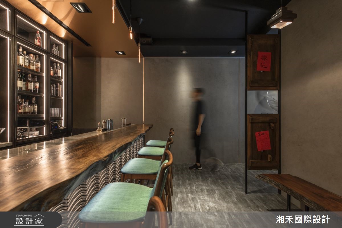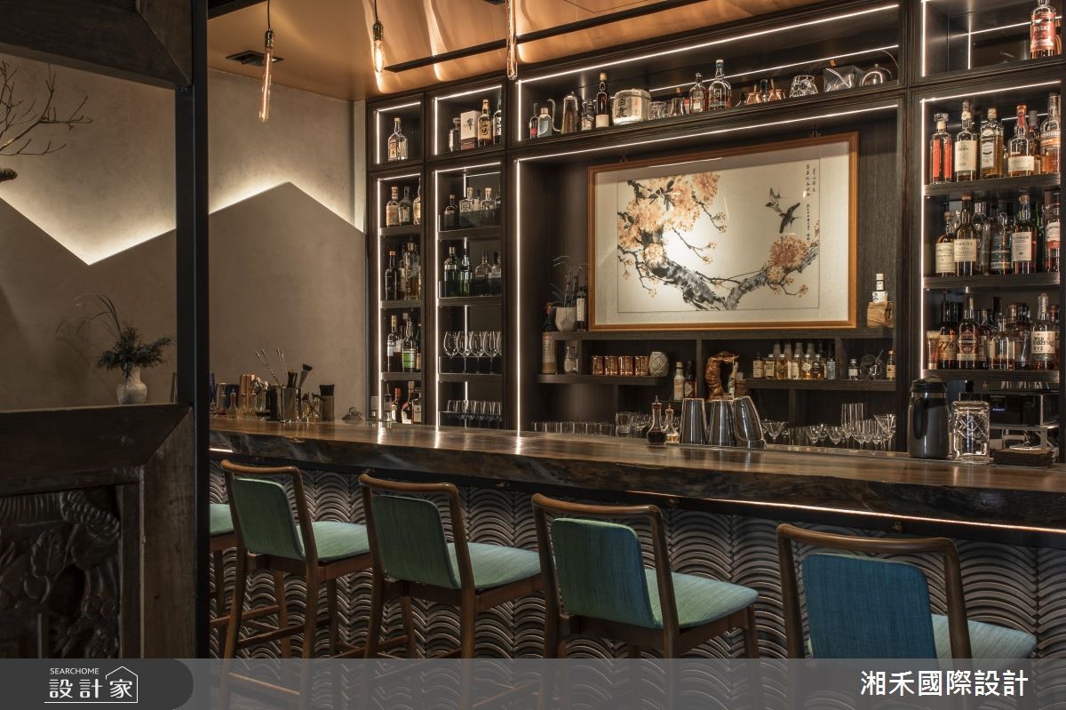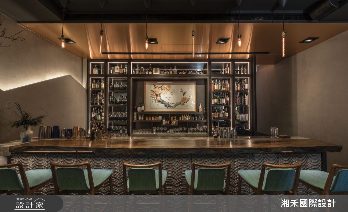 不只是酒館,業主更希望是一處能讓人放鬆、卸下心房的地方,因此設計師藉由東方美學的質感妝點空間,利用照明與色彩調和出溫潤的氛圍。 業主將家中的書畫懸掛於酒櫃中央,替空間增添典雅的中式氣息,也成為主視覺造型。周圍壁面以清水模飾底,藉由山形的間接照明分割視覺,營造出明暗對比、漸層的空間視感,意外的讓坪數不大的領域多了分愜意,不會感受擁擠;吧檯上方的天花板以玫瑰金金屬材質鋪設,並銜接整面深色調木皮酒櫃,搭配原木質感、原始線條的吧檯,挹注自然樸實之美;大面酒櫃是空間的核心重點,櫃子底部暗藏灰鏡,並利用鋁擠型燈條順著櫃體勾勒造型,隨著燈光亮起,讓陳列各式佳釀與酒杯的櫃體有數量加乘、視覺放大之效;自然質感的大型吧檯,檯面的側邊則以瓦片堆疊出層次美感,厚重的量體讓空間更顯沉穩、安定,伴隨幾盞愛迪生吊燈,暈染一室獨有風情。 小編的最愛 二樓以居家氛圍定調,結合原木桌、花藝、藏書等中式元素,壁面打造一個中式方形邊框的書櫃設計,天花板則垂掛水墨壓克力拼接裝飾,調和出具詩意的山水意境之美。
