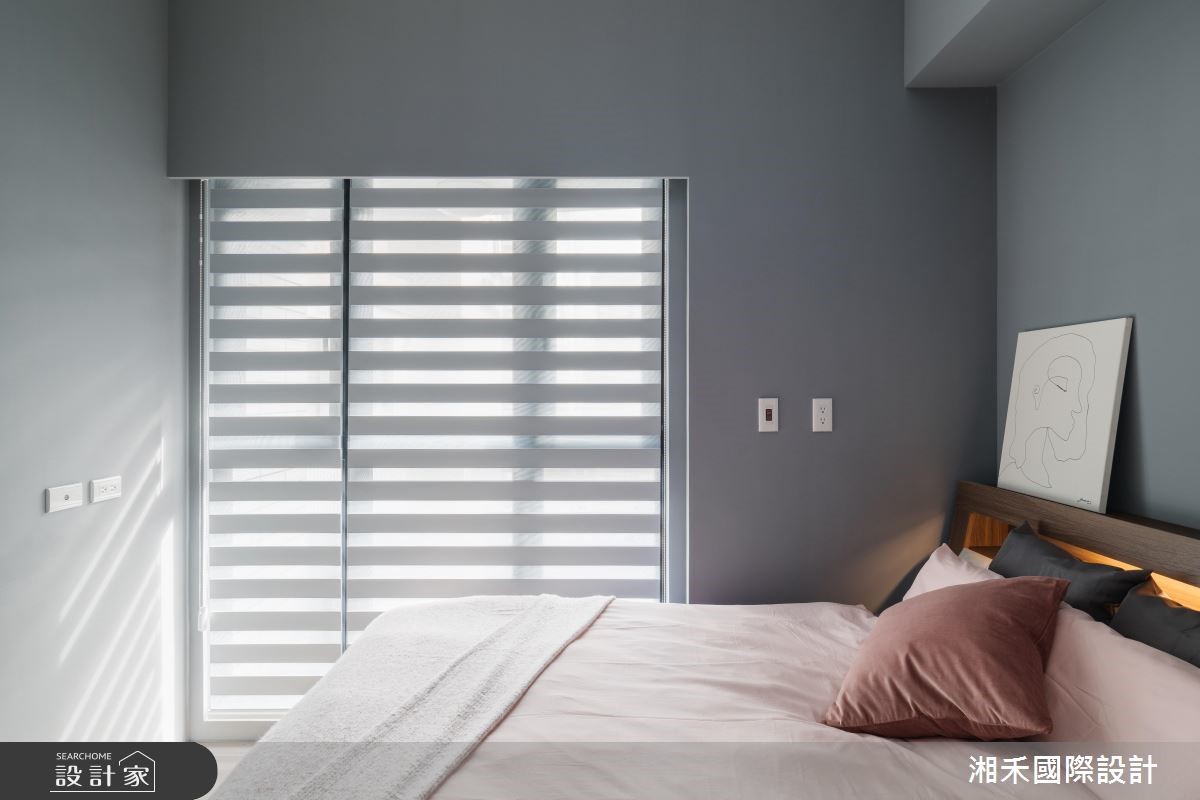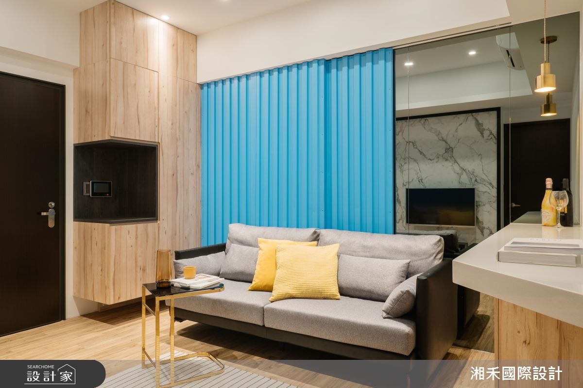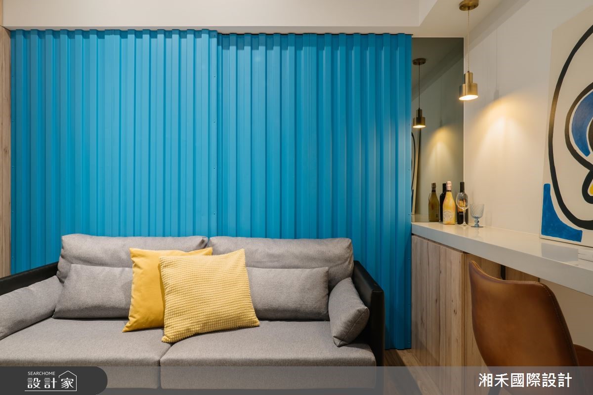 身處大都市裡,空間居大不易,此案為18坪的風格小宅,2房的格局規劃非常適合新婚夫妻入住,設計師在簡約的空間裡,透過亮眼跳色與家具家飾妝點室內,混搭出個性化的風格私宅,且將機能靠牆擺設,讓出更多領域做為日常動線。 入室後的大門左側藉由系統櫃打造收納機能,櫃體利用頂天設計,得以擴充更多收納空間,櫃體底部則以懸空方式安排,營造出輕盈無壓之感。收納櫃體緊接著是沙發區,背牆以藍色拉門與茶鏡鋪陳,依屋主需要選擇將拉門全拉上或是適時露出茶鏡,讓空間更添溫潤之感,鏡面反射的視覺延伸效果,也讓室內更顯寬敞、放大之感;緊接著是吧檯區,檯面下方局部搭佐木作收納櫃體,強化實用收納,牆面則展示一幅簡約線條的風格畫作,角落懸掛一盞黃銅燈飾,與金屬質感的茶几相呼呼應,交織出一抹摩登時尚味道。 小編的最愛 臥室裡藉由灰色壁面打底,粉紅色衣櫃的浪漫安排,一旁利用畸零空間搭佐開放式收納衣物,枝葉意象的壁紙襯底,搭配金屬衣架的結構,讓衣物懸掛在熱情奔放的時尚意象裡。