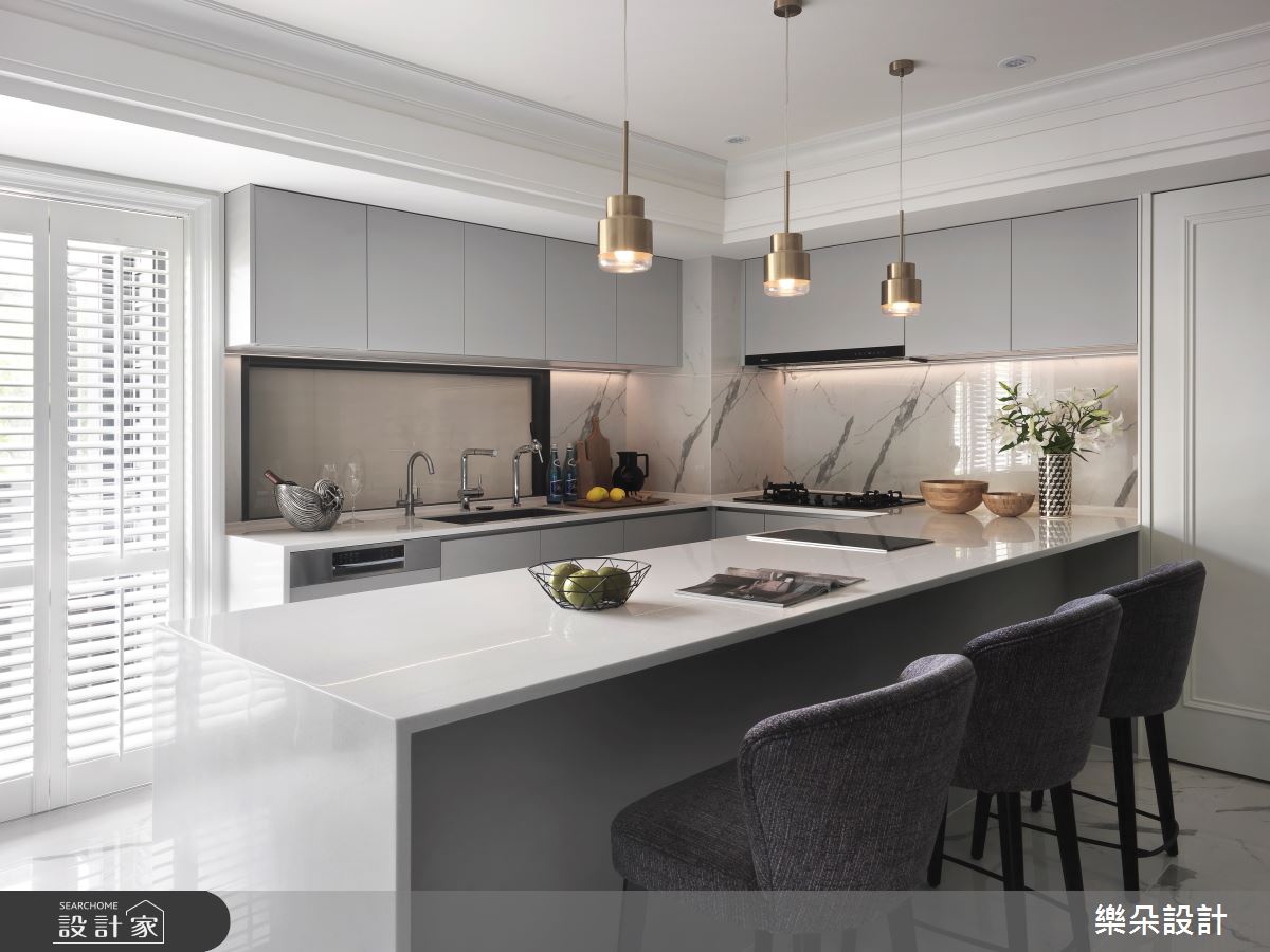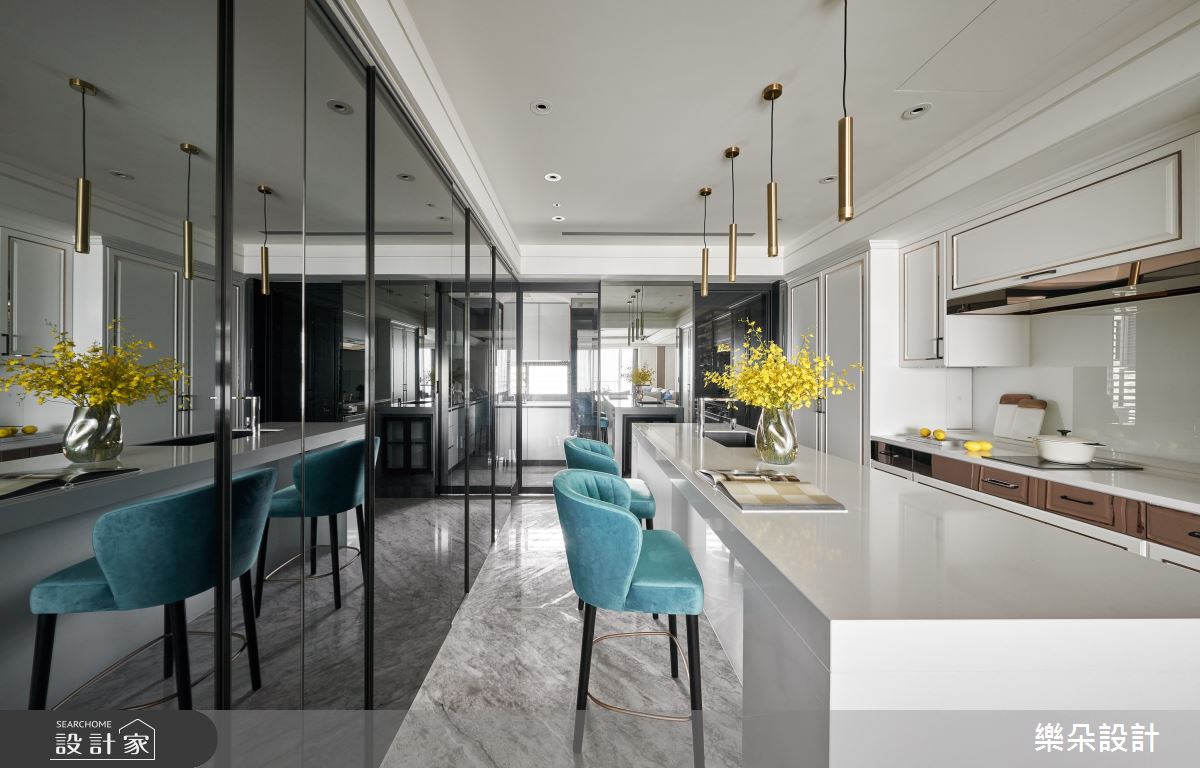 來自樂朵室內設計的80坪新古典住宅案,屋主一家人共有5位大人、1位小孩、2位長輩,是一間複層老屋(16~30年)的四房格局,設計師藉由建材以油漆、壁紙、超耐磨木地板、不鏽鋼、鐵件、灰鏡、鍍鈦金屬、木作貼皮、烤漆、系統板材、大理石、磁磚、木百葉、賽麗石、石材、線板、噴漆的搭配應用,實現一家人的理想生活。
