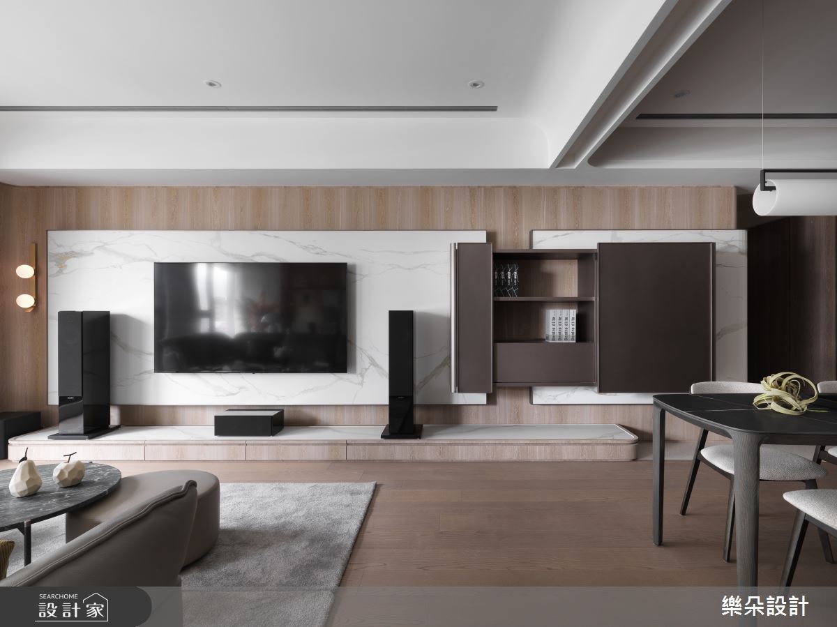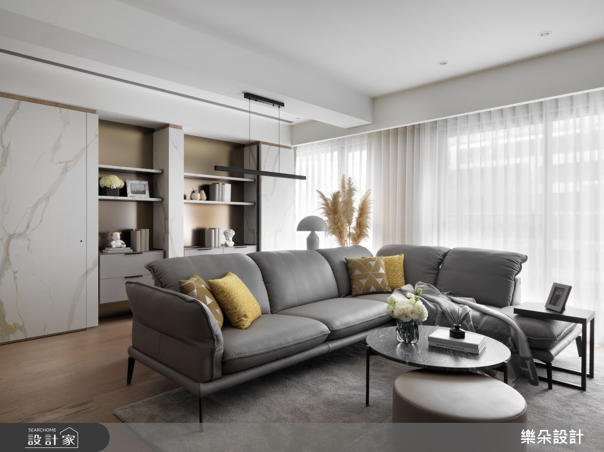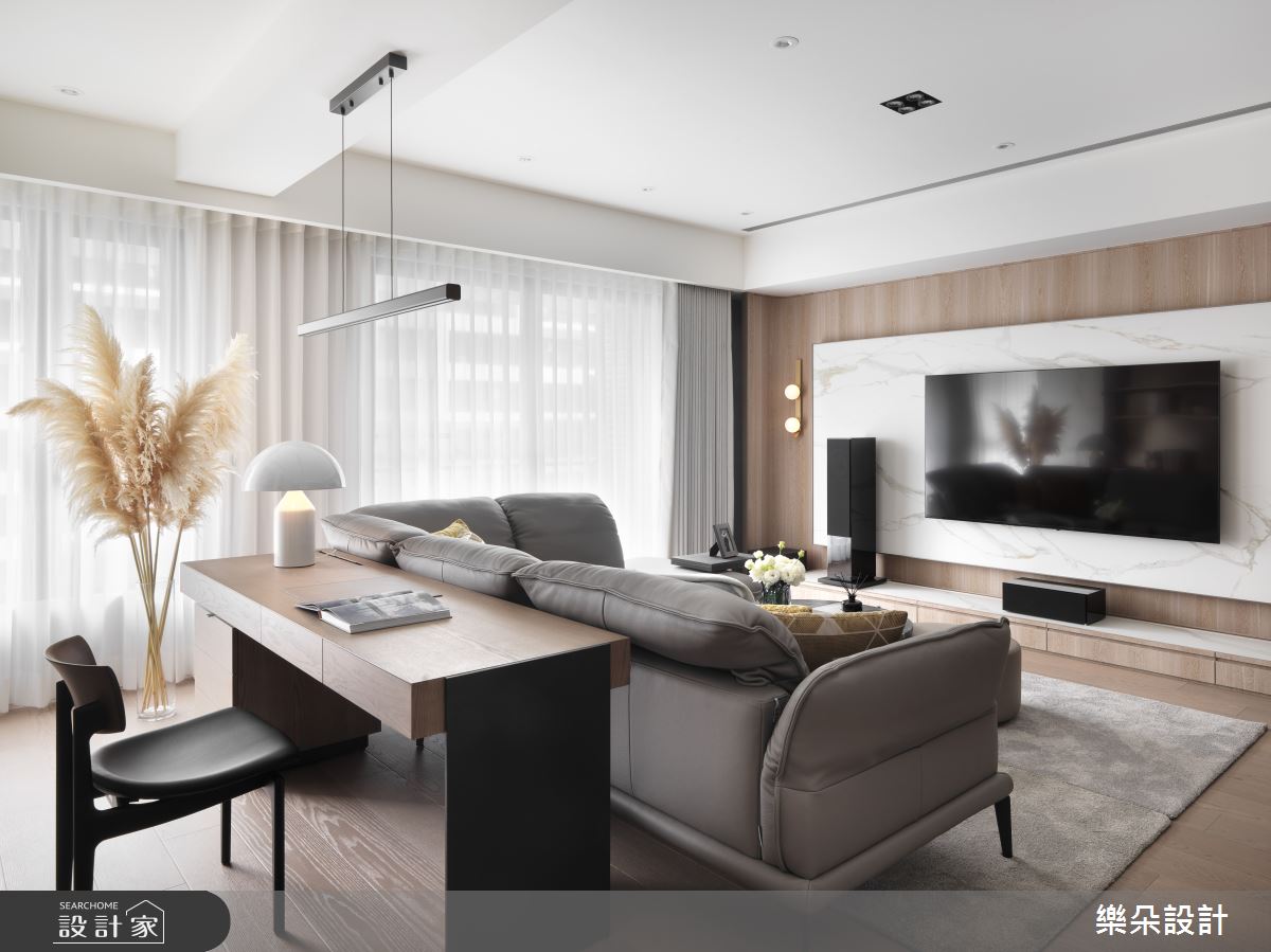 本案為樂朵室內設計的90坪現代風新成屋(5年以下)設計作品,格局為單層三房的居住空間。全室建材的搭配,應用壁紙、超耐磨木地板、鐵件、灰鏡、鍍鈦金屬、木作貼皮、大理石、賽麗石、噴漆,展現溫馨的居家氛圍。