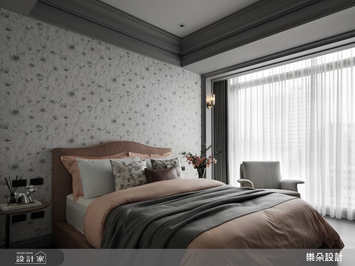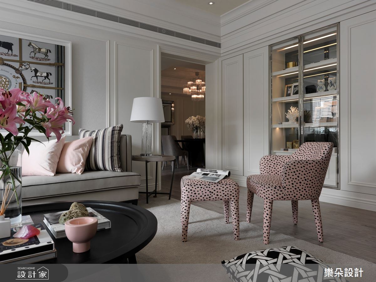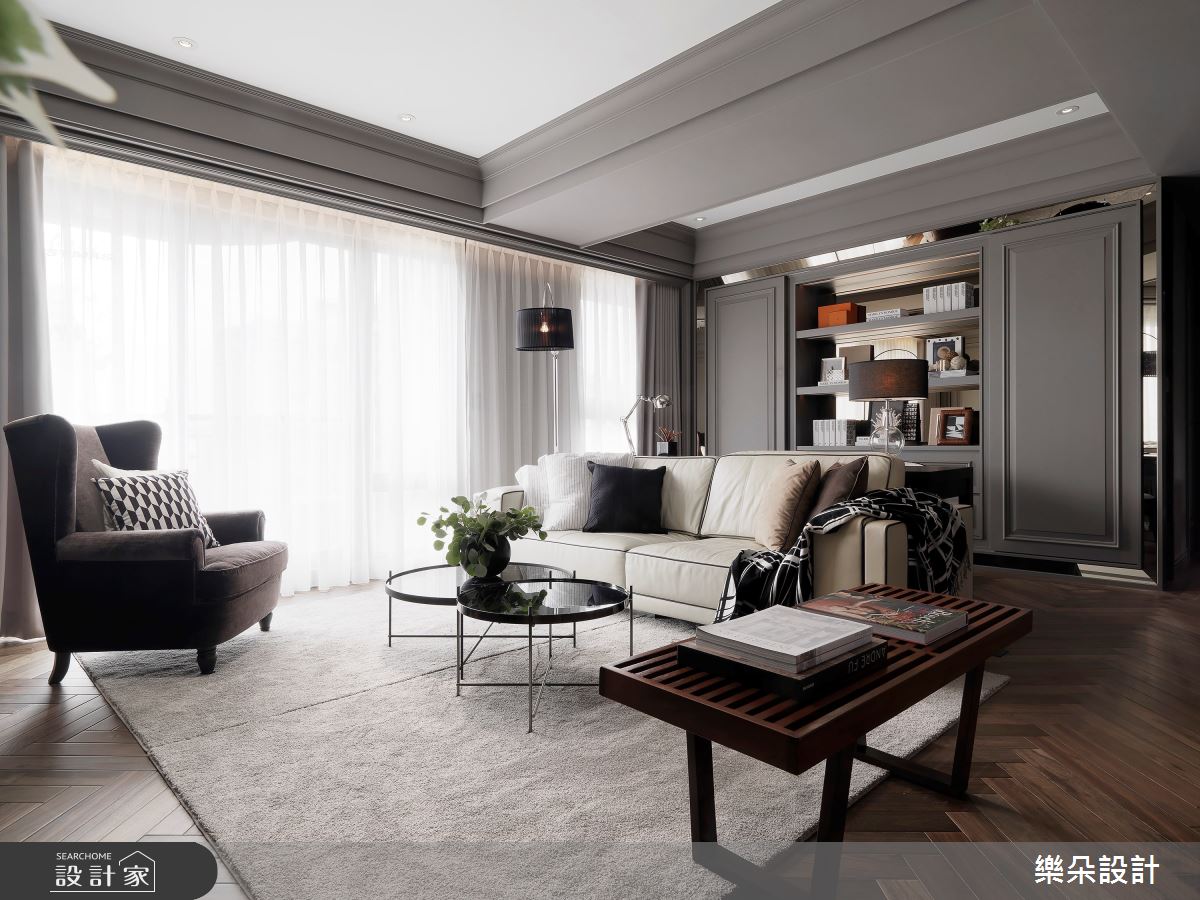 本案為樂朵室內設計的95坪新古典新成屋(5年以下)設計作品,格局為單層三房的居住空間。全室建材的搭配,應用壁紙、超耐磨木地板、鐵件、鍍鈦金屬、系統板材、大理石、磁磚、賽麗石、線板、噴漆,展現溫馨的居家氛圍。