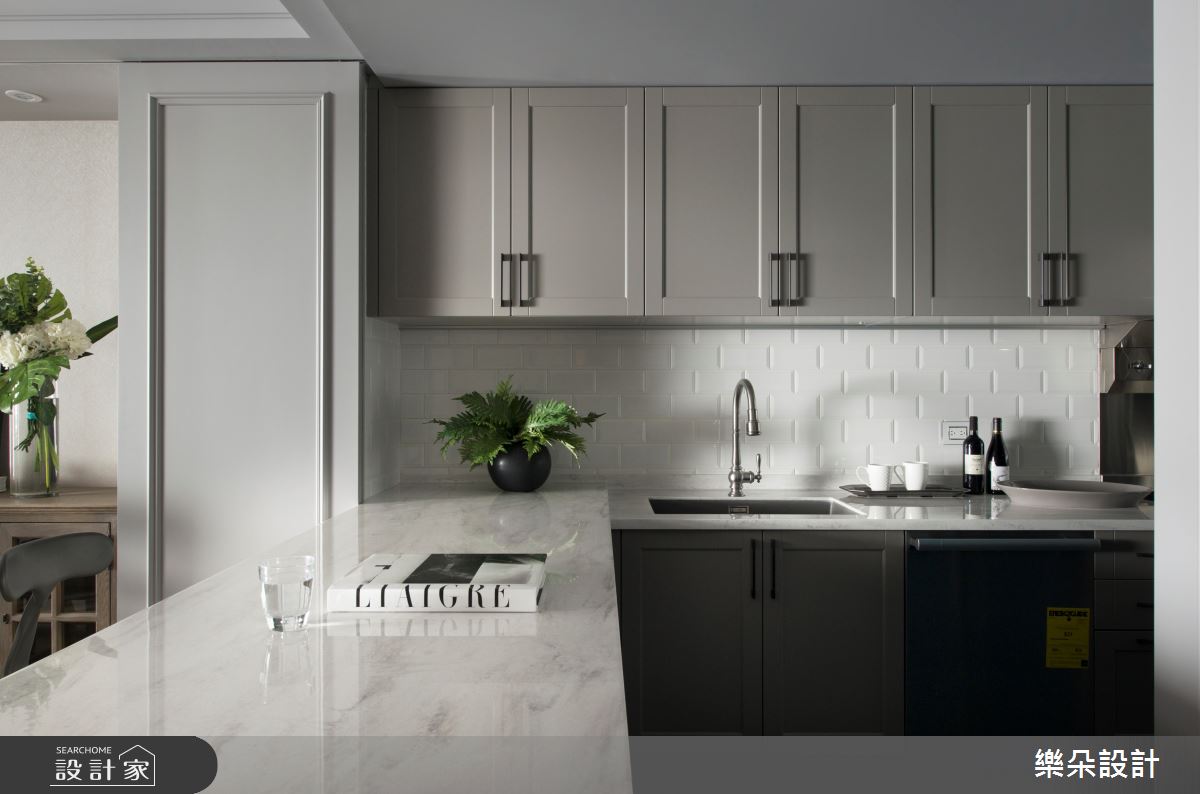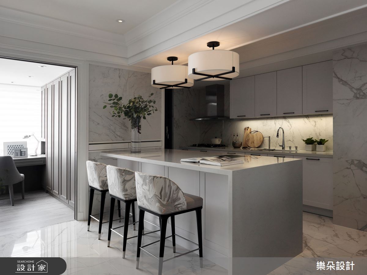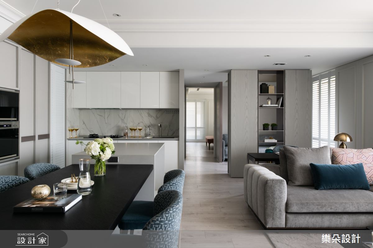 來自樂朵室內設計的72坪新古典住宅案,是一間單層中古屋(5~15年)的三房格局,設計師藉由建材以壁紙、超耐磨木地板、系統板材、磁磚、木百葉、大理石、噴漆的搭配應用,實現一家人的理想生活。