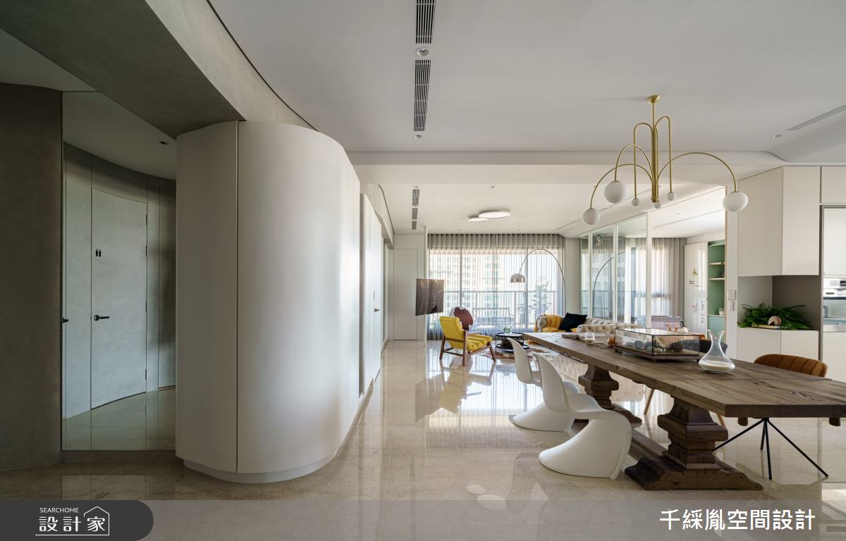 本案為千綵胤空間設計的70坪混搭風新成屋(5年以下)設計作品,格局為單層三房的居住空間。居住成員包含2位大人、3位小孩。全室建材的搭配,應用乳膠漆、壁紙、磁性漆/磁性黑板漆、超耐磨木地板、鐵件、灰鏡、鍍鈦金屬、木作貼皮、烤漆、鋼刷木皮、系統板材、大理石、磁磚、石材、線板,展現溫馨的居家氛圍。