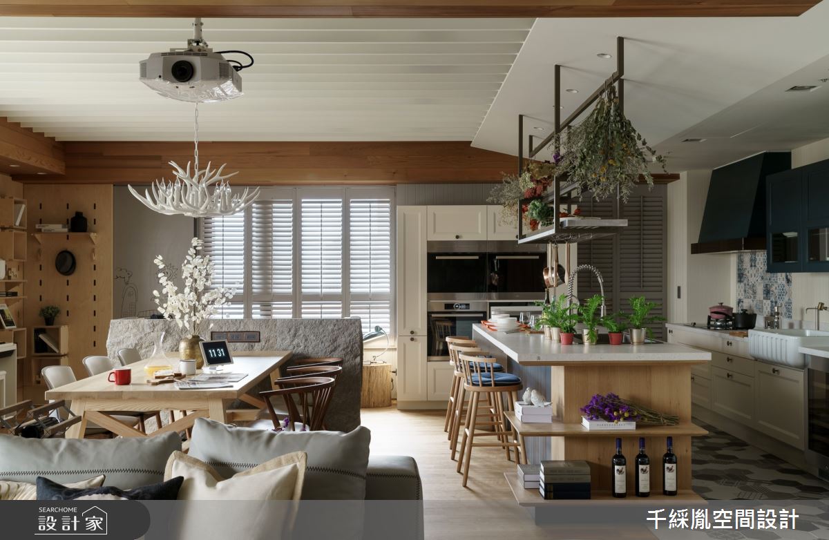來自千綵胤空間設計的65坪混搭風住宅案,屋主一家人共有2位大人、1位小孩,是一間單層中古屋(5~15年)的四房格局,設計師藉由建材以乳膠漆、花磚、大圖輸出、海島型木地板、灰鏡、鋼刷木皮、系統板材、大理石、磁磚、線板的搭配應用,實現一家人的理想生活。