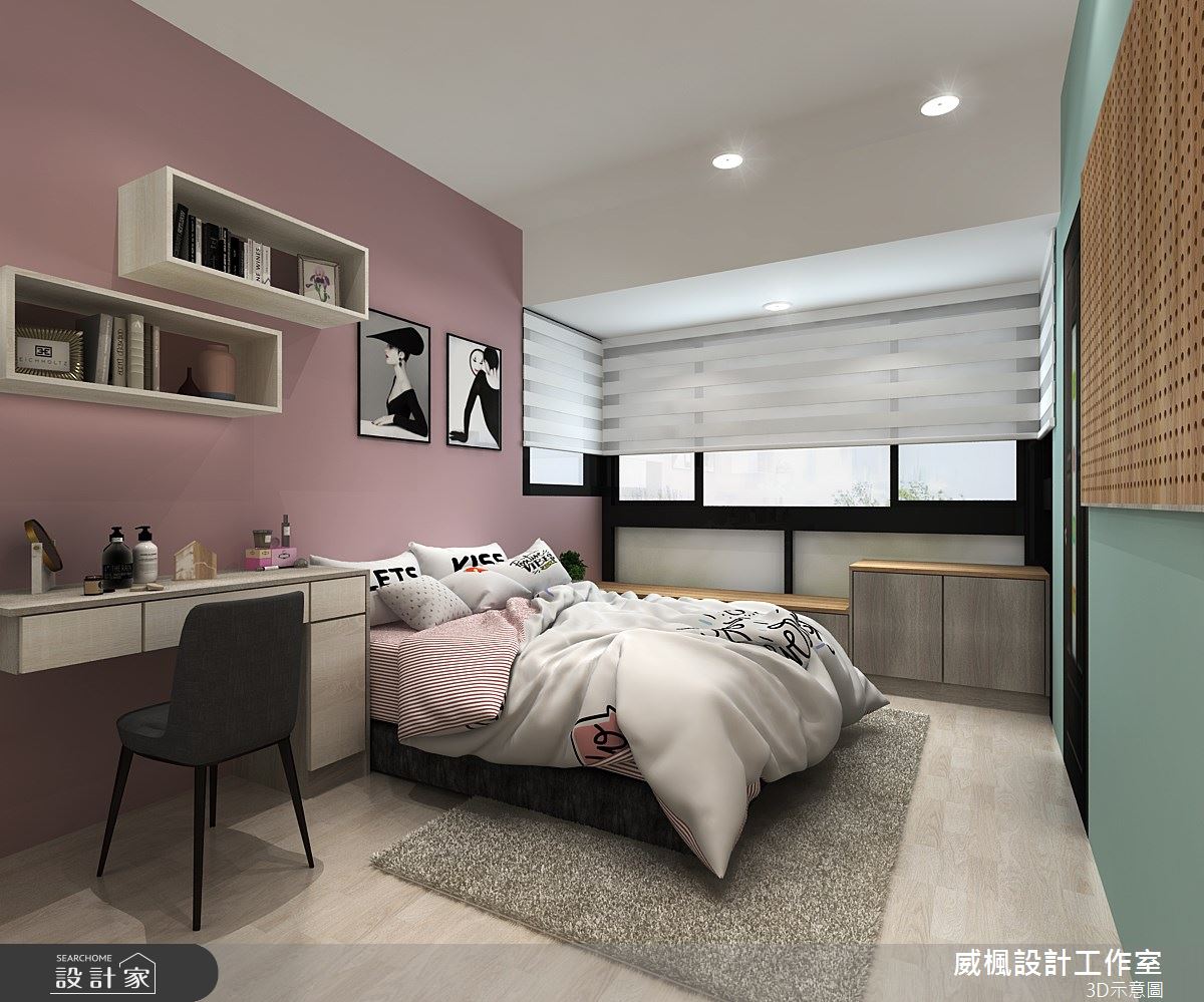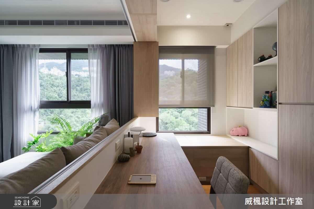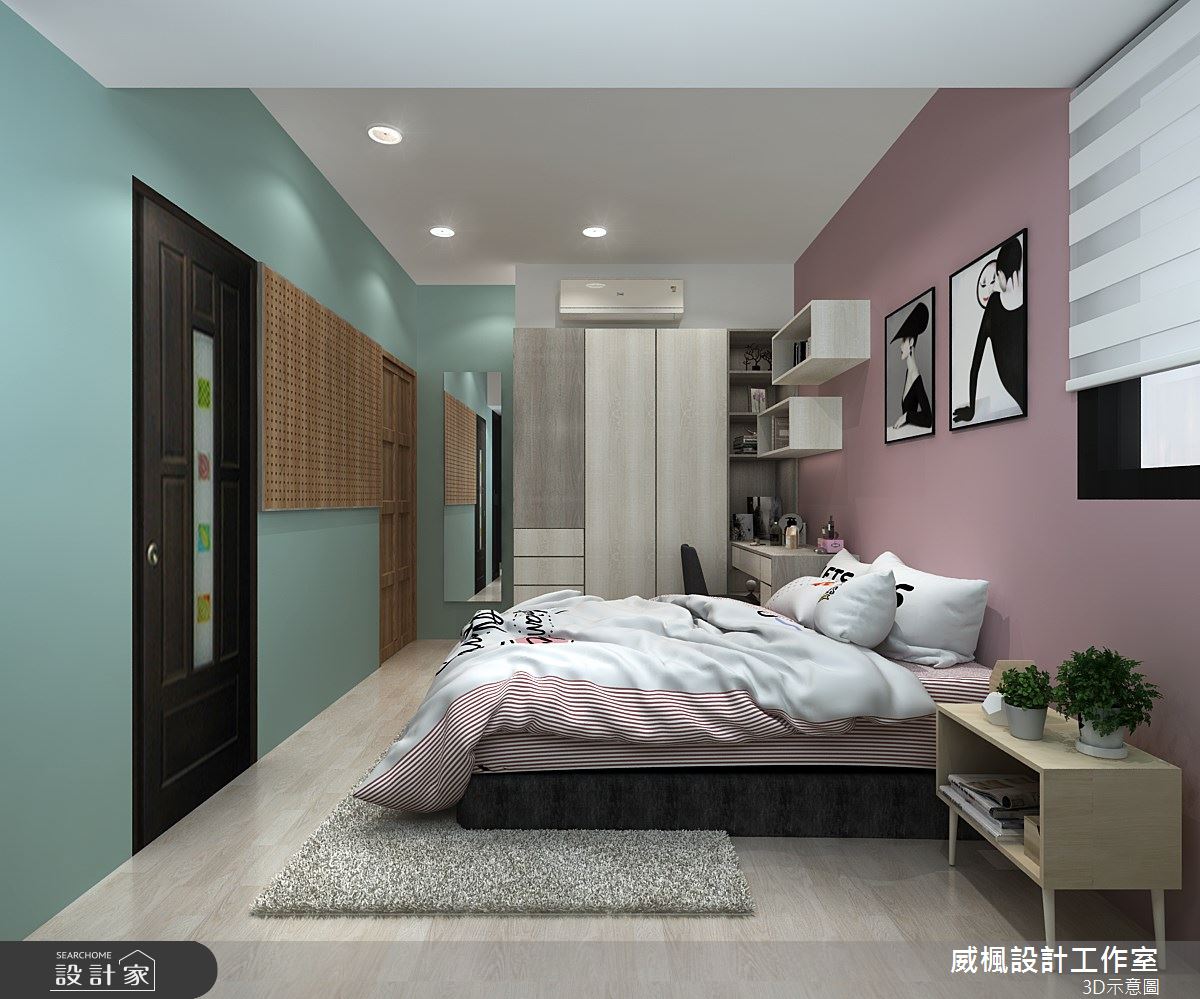 20坪居家空間,在客空間裡加強收納櫃設計,沙發牆局部佐以展示層架,擺上屋主書籍後,成了絕佳的風格裝飾,電視牆則讓視聽機能與櫃體功能相重疊、兼具置物用途,打造多功能的牆面表情;臥房內,於床頭揮灑屋主最愛的粉紫色,加以掛畫、吊櫃展現多層次夢幻感,並為了平衡色彩,於床尾背牆添注粉嫩綠色,勾勒略帶俏皮的繽紛感;書房採以木質調為主題,藉由溫潤木地板舖陳全室地坪,帶出溫暖的場域基調,在地坪底下暗藏收納空間,保留空間的多功能用途。