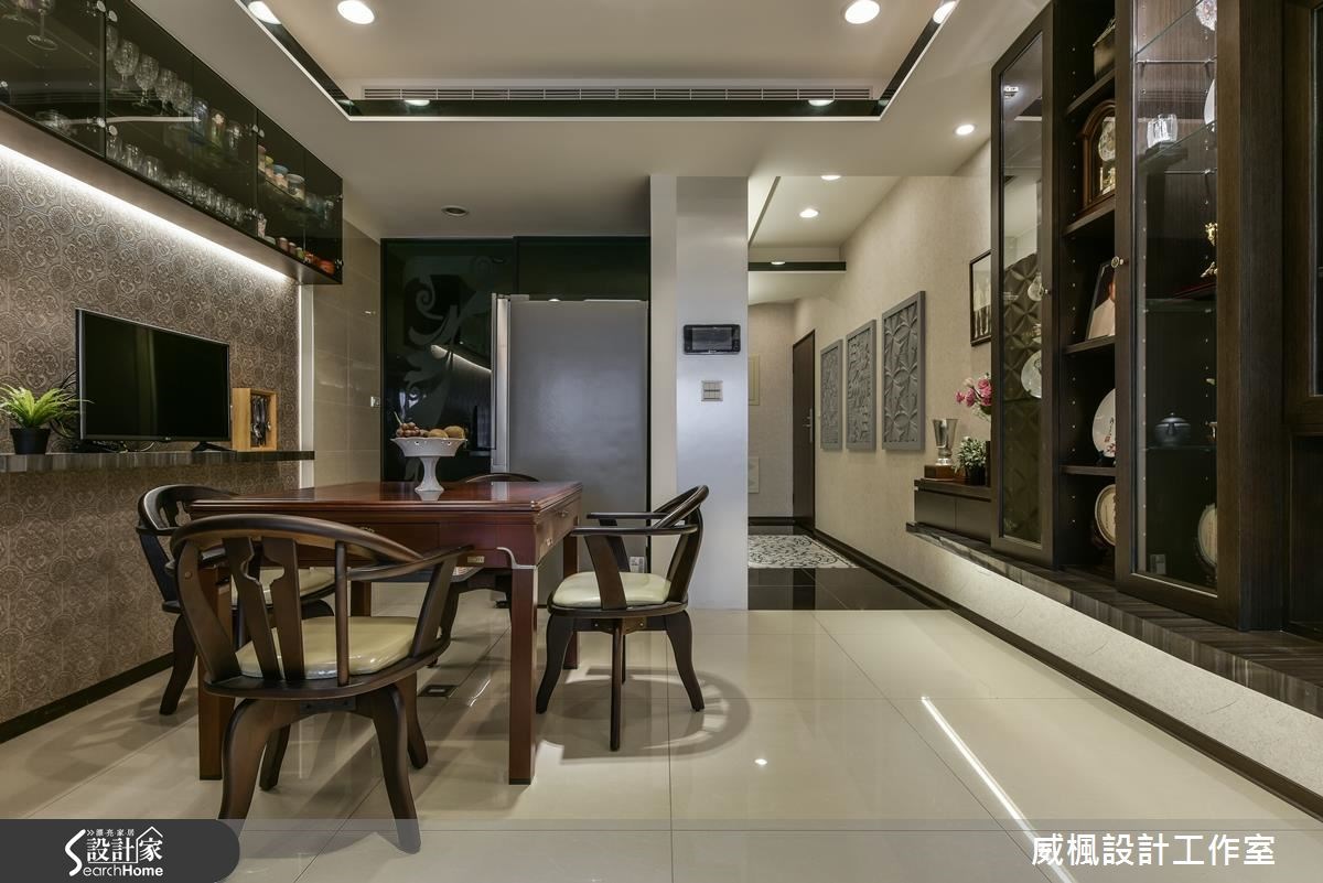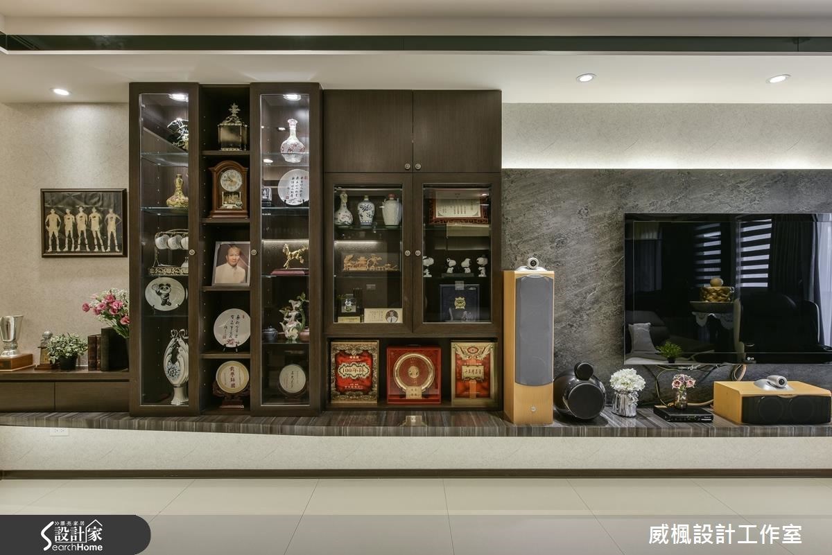 以寬敞、友善的機能空間作為規劃,並結合充裕的收納來展示其收藏與輝煌的得獎紀錄,打造高齡80歲屋主與一家人共享天倫之樂的退休宅。 將大理石拼花般的視覺轉為玄關地坪,唯美優雅的線條與立體金屬質感的鞋櫃門片相互輝映,在光源的映照下,展現動人的奢華美感。開放的長形公領域裡,客、餐廳相容一室,電視牆旁特別規劃一整座展示櫃,將籃球國手的屋主歷年獎牌與收藏陳列其中,滿滿的人生回憶豐盈日常生活,成為居家環境的風格飾品,同時也展現生命溫度,讓空間備感溫馨;電視牆以石材紋理的美耐板打造,岩石般的肌理造型引入寫實自然之美,對面的沙發背牆則以鏡面飾底,描繪獨特的龍紋圖騰,引入優美的東方美學;原木餐桌椅圍塑出餐桌領域,後方利用玻璃拉門取代原先的實體牆,穿透的質感隔間技法,讓空間更顯開放、舒心。 小編的最愛 大地色系鋪陳空間基底,除了豐富的收納機能,更全面考量退休宅居的實用需求,納入無障礙動線的設計,創造貼心、安全的生活環境。