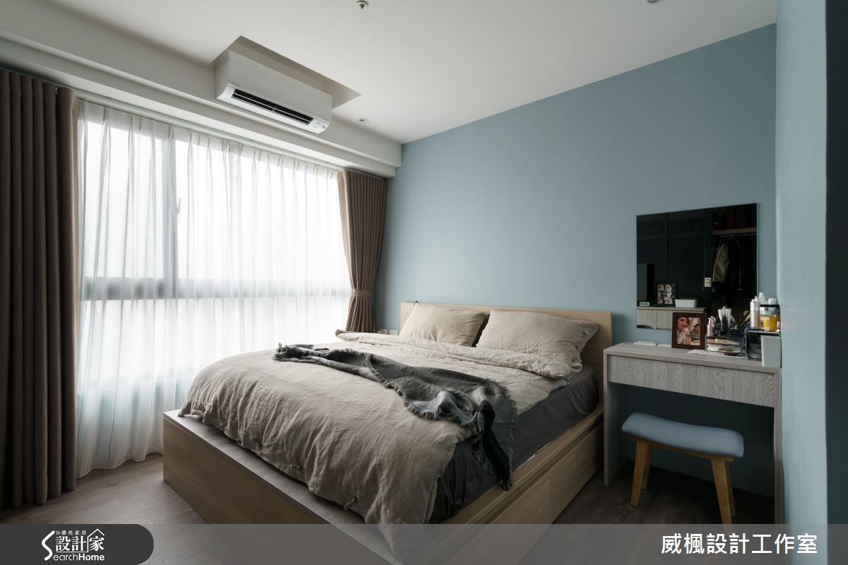 終於要擁有第一個家,對於新婚夫妻來說意義非凡,更是感到雀躍與興奮!此案的屋主夫妻讓現代風格作為第一個家屋風貌,室內藉由藍與大地色系的雙色變化,創造出沉穩、安定且具層次的質感空間。 大門旁擺設一座鞋櫃,滿足實用的生活機能,同時也區隔出後方的餐廳領域,避免開門見灶的疑慮;公領域的壁面以深、淺藍色調鋪陳,隱喻客、餐廳領域的主次關係,電視主體牆反以大地色系飾底,呈現樸實無華的自然質韻,左側收納櫃與右側沿窗增設的臥榻區皆延伸此色調,清爽、舒心的氣息隨之蔓延;沙發背牆以白色橫紋描繪,加上跳色抱枕的裝飾,在簡約視感裡創造一抹律動;後方的餐廳區以深藍色調的壁面裝飾,結合黑色系的現代感吊燈,挹注時尚摩登風情,木紋質感的餐桌椅則挹注自然溫潤,牆面設計一處可分享日常生活照的位子,讓家的回憶與溫度流敞空間裡,成為絕佳的設計元素。 小編的最愛 將原有廚房的隔間牆拆除,且將210公分的廚具長度延伸為500公分,串連起屋主夫妻最喜愛的吧檯領域,空間隨之拉闊、寬敞自在。
