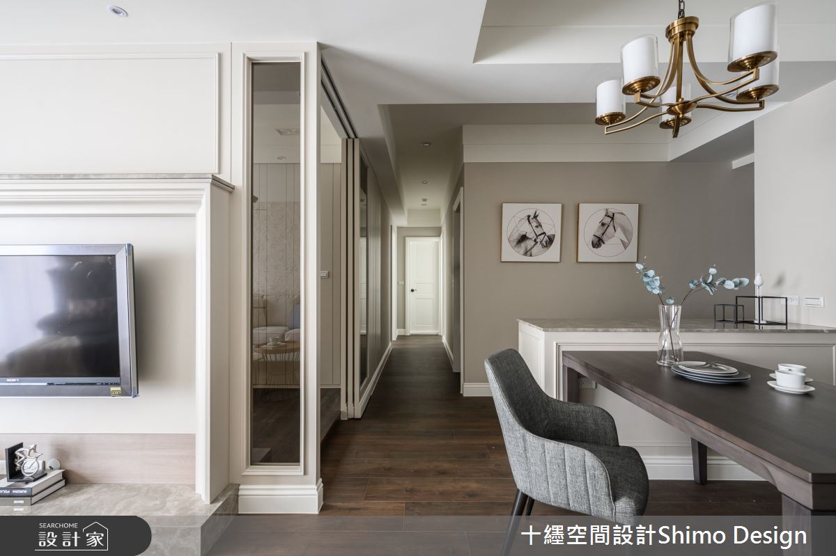 來自十纆室內裝修設計有限公司的38坪混搭風住宅案,屋主一家人共有2位大人、1位小孩,是一間單層新成屋(5年以下)的四房格局,設計師藉由建材以乳膠漆、壁紙、超耐磨木地板、鐵件、灰鏡、木作貼皮、系統板材、大理石、木百葉、賽麗石、石材、繃布的搭配應用,實現一家人的理想生活。