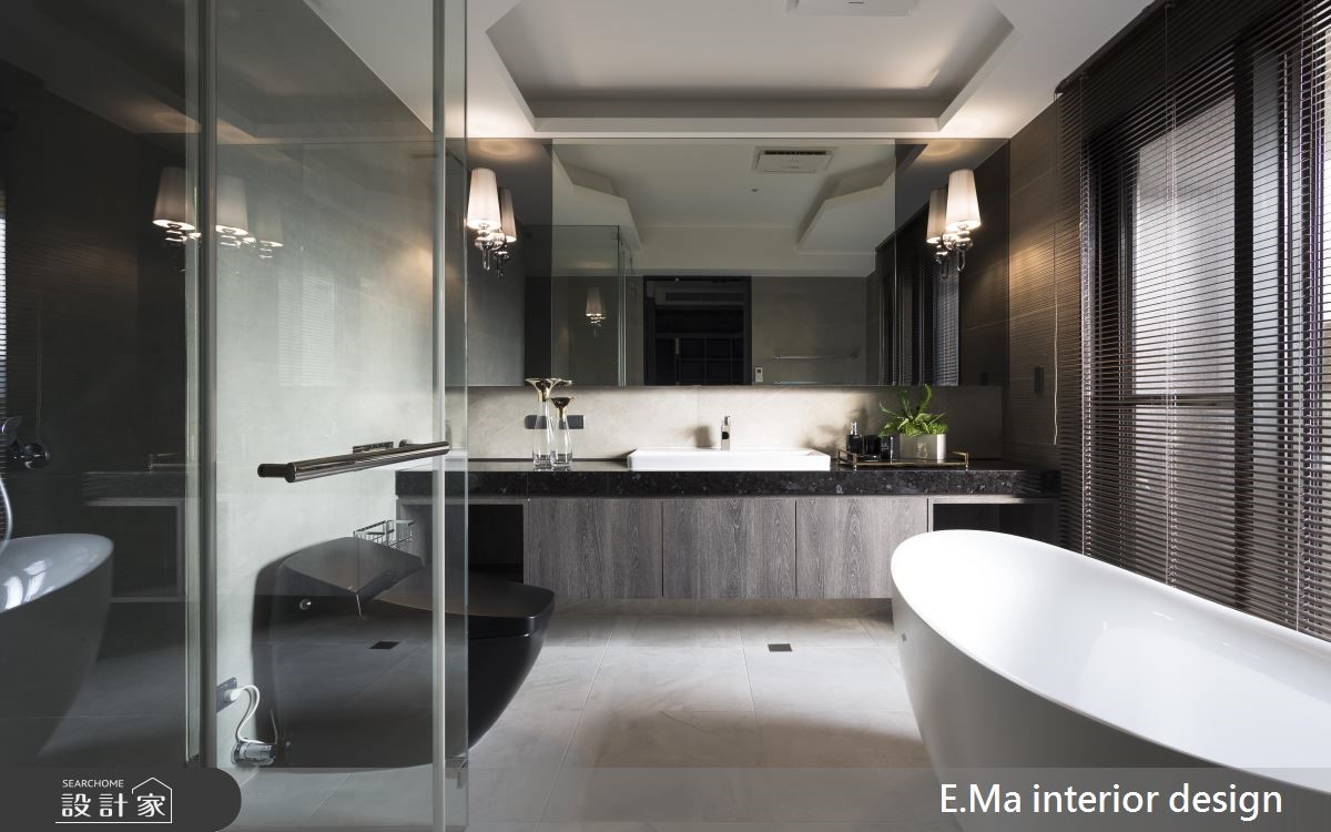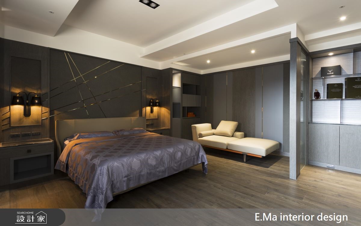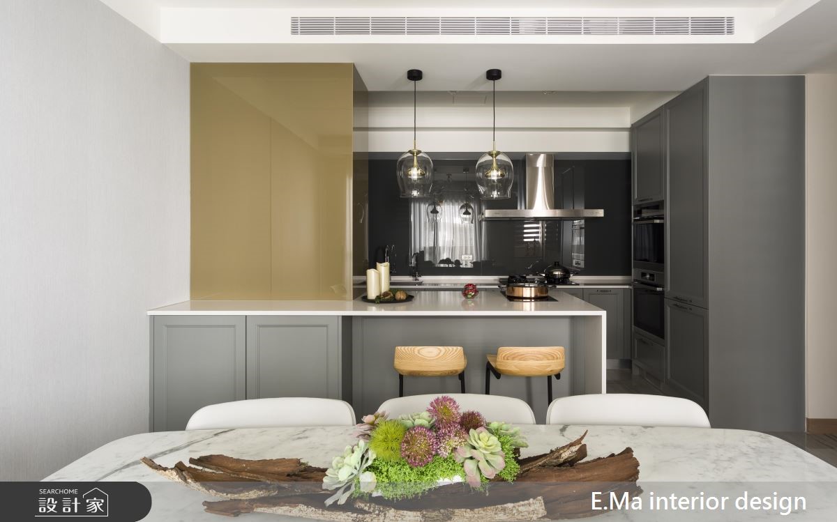 百坪大宅空間裡,讓時尚美學揮灑一室,透過現代的俐落工法,勾勒出簡潔器度,大面石材、金屬與鮮明的紋理,閃耀著華麗風情,擁抱且歡迎回家的家人們。 狹長的玄關空間,大理石鋪設地坪與局部壁面,伴隨嵌燈的映照下,烘托鮮明紋理與色澤,成為絕佳的迎賓風格;鞋櫃以深木紋色為安排,則替冷色調的質感注入安定、溫暖的氣息。石材牆面的另一側為客廳的電視牆,在大面採光的優勢下,映照出氣勢非凡之姿,搭配灰色調的L型沙發與茶几,傳遞尊爵的貴族氣質;沙發背牆嵌入以層板打造的酒櫃設計,將屋主收藏的酩酊佳釀陳列齊中,伴隨嵌燈映照下,宛如精品櫃的高雅質感,替居家空間塑造藝術陳列之美,目光久久不忍離去。客、餐廳以一道雙開門做為界定,讓客廳領域更為寬敞、高度活用,餐廚領域合併,以中島劃分烹調與用餐區,充分的座位區規劃,讓到訪的親友能盡情的享受假日派對。 小編的最愛 臥室裡依不同個性的使用者打造,透過大地色、粉、藍、灰色調的壁面襯底,營造出沉穩、粉嫩或是清新的休憩環境,牆面以層板、六角展示收納或是畫作,創造活潑、生動的休憩氛圍。
