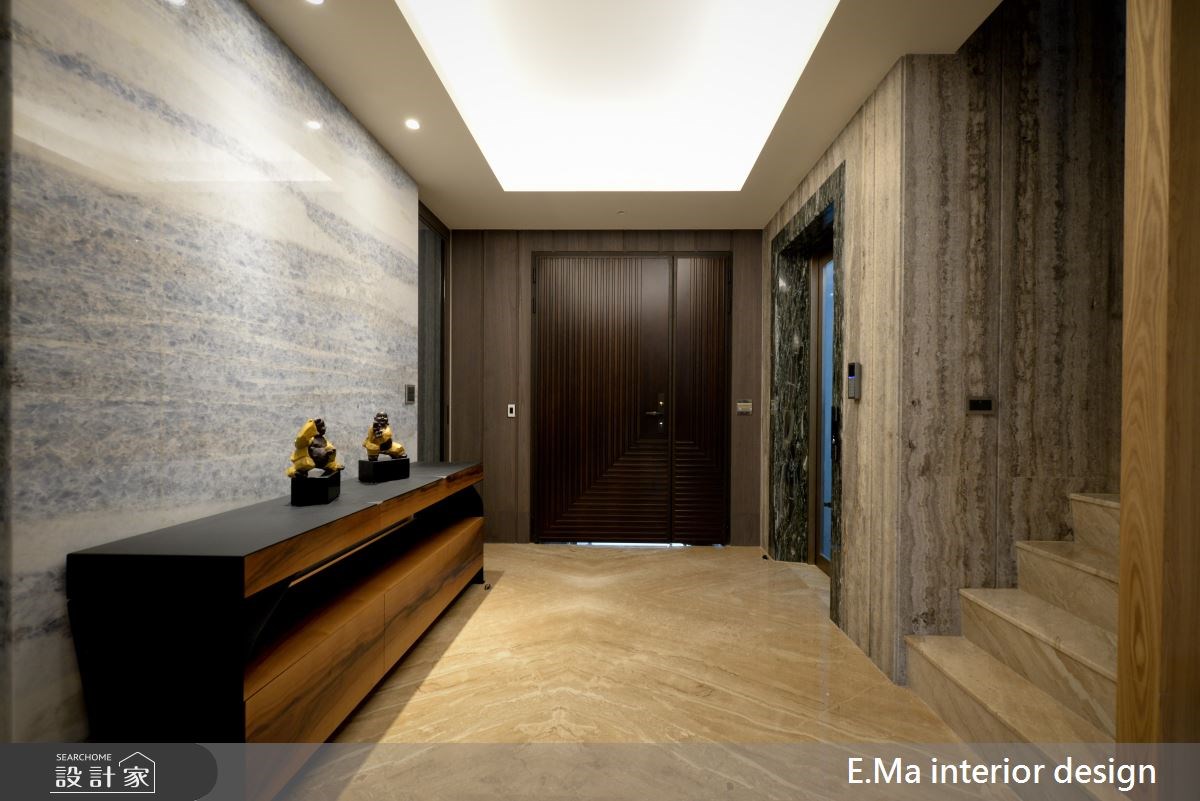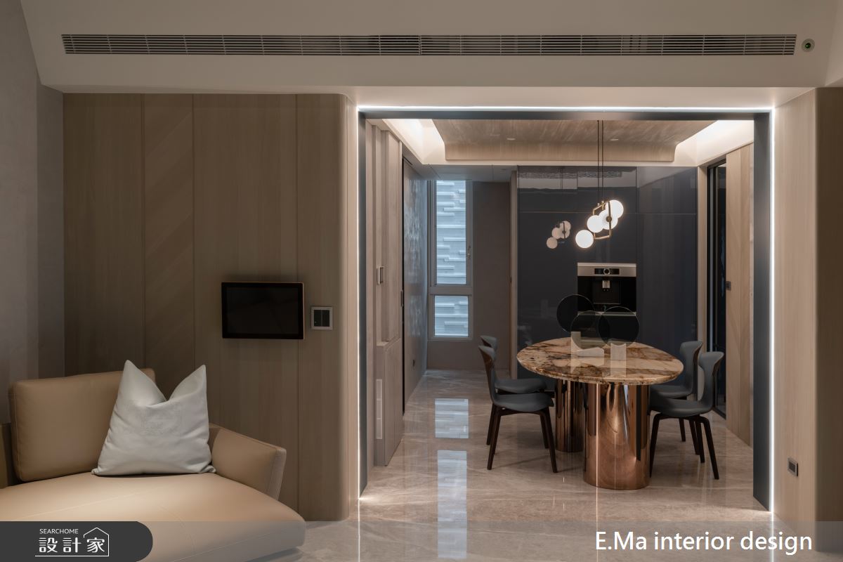 這幢 6 層樓的透天別墅,雖然曾有完整的裝潢,卻不是屋主夫妻想要的風格,他們經由朋友推薦,以及參觀設計師的工地現場,最後決定將原有裝潢全部砍掉重練,並邀請艾馬裝修設計重新規劃,設計師透過細心、專業的設計思維,為屋主打造出夢想中的奢華風新婚宅! 在裝潢的溝通過程,設計師細心的發現屋主喜愛美式、奢華等較為大器風格,因此特別融入屋主喜愛的蘭花壁飾、帶有水波紋的石質等建材元素,打造出最為別緻精巧的視覺亮點。公共空間採開放式設計,挑高的客廳擁有相當大器的電視牆設計,設計師在溫潤的石質、木質元素中綴入鈦金屬線條,更添時尚俐落感;另一端則規劃為用餐區,圓桌上以天花造型和華麗的吊燈,並利用玻璃櫃呈現屋主的餐具收藏,營造出精緻、高貴的餐飲氛圍。私領域具有如同星級飯店般的高級質感,搭配更衣室收納的規劃,更加提升了生活的舒適度。 小編的最愛 走進高挑又寬敞的客廳區域,設計師將電視牆和沙發背牆線條無限向上延伸,提高了視覺的高度,帶來更加高闊、大器的視覺效果。