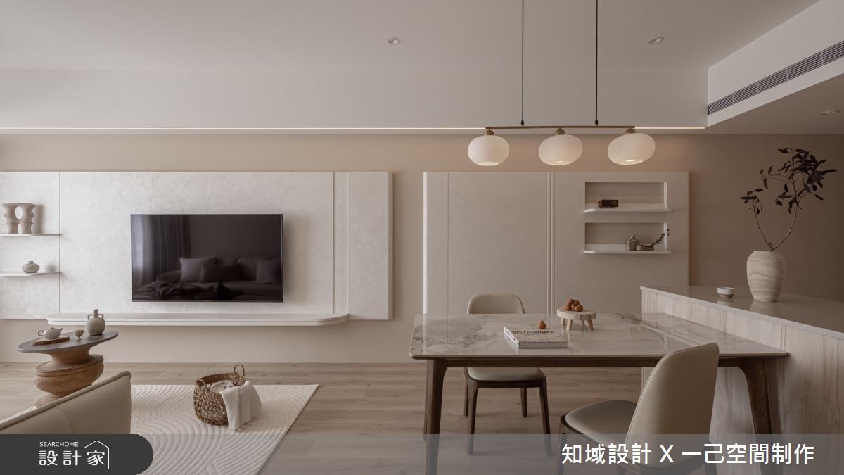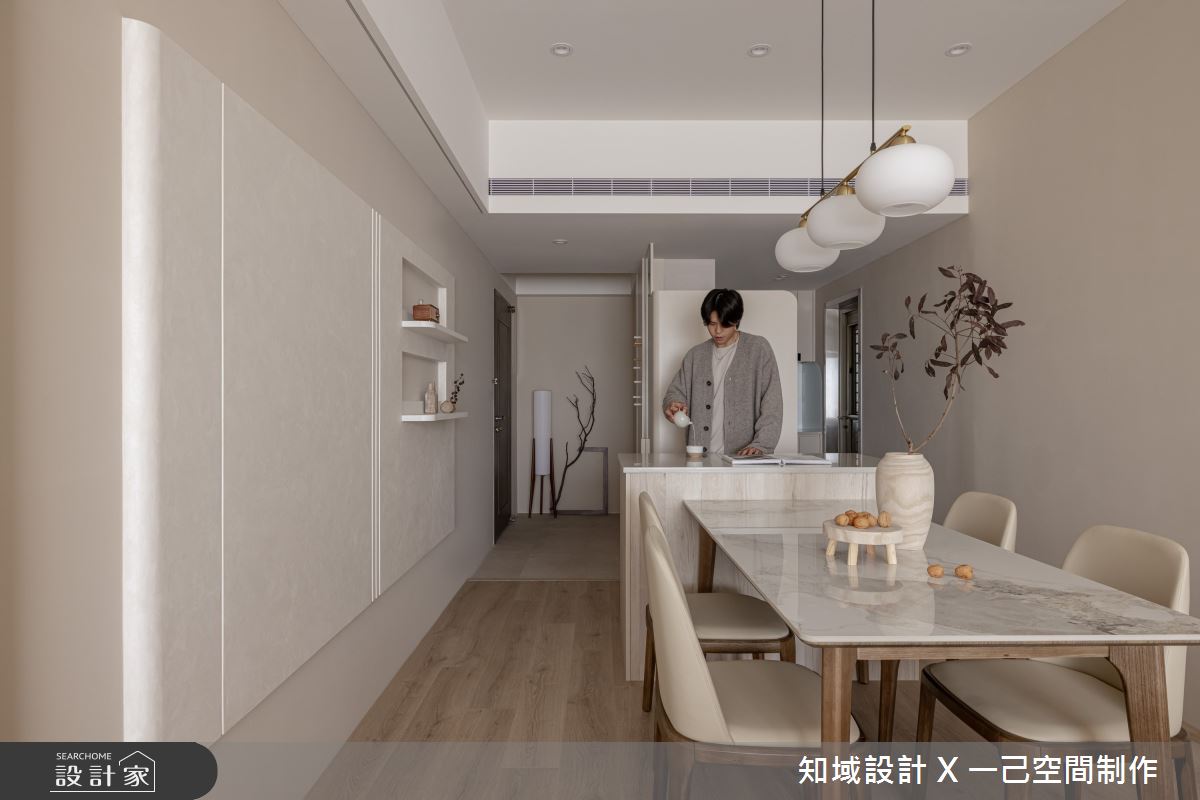 由知域設計 X 一己空間制作精心規劃的16坪兩房住宅空間,家庭成員一共有4位大人。因應屋主需求,設計師運用侘寂風作為主軸,搭配油漆、木作、特殊漆、燈條、系統櫃、泥作、磁磚,打造全家人的夢想家居。
