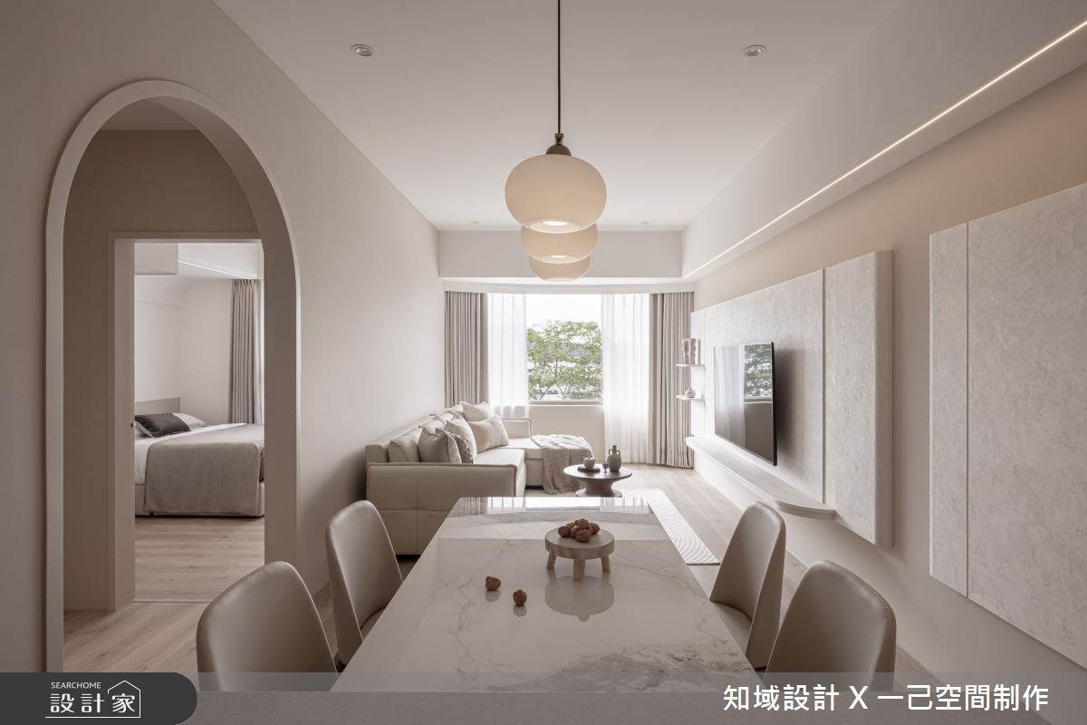 知域設計 X 一己空間制作以海島型木地板、磁磚、班傑明油漆、實木層板、實木貼皮的搭配應用,呈現混搭風居家氛圍,將此間20坪、兩房、單層、新成屋(5年以下)打造成舒適愜意的家庭空間,完成2位大人全家人的夢想之居。