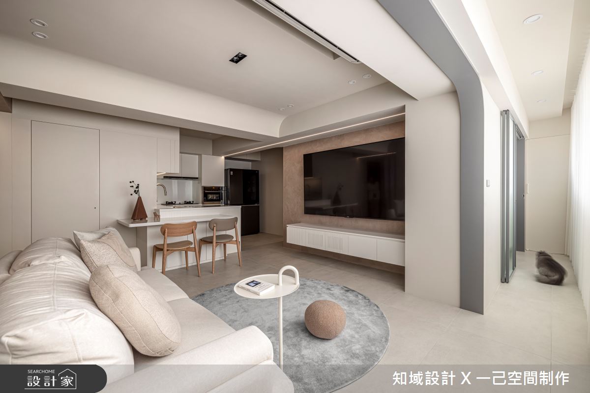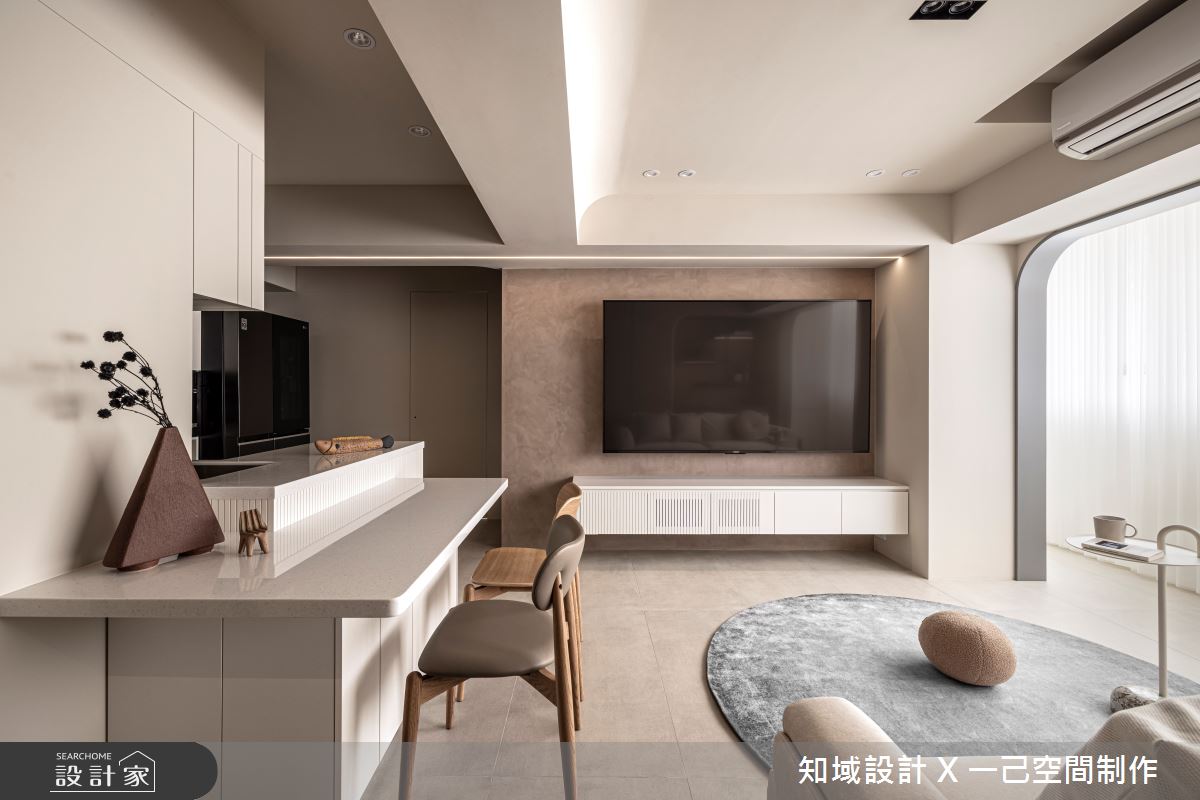 知域設計 X 一己空間制作以木皮染色、大板磚、磁磚、系統櫃、造型木作、特殊塗料的搭配應用,呈現現代風居家氛圍,將此間25坪、兩房、單層、新成屋(5年以下)打造成舒適愜意的家庭空間,完成2位大人全家人的夢想之居。