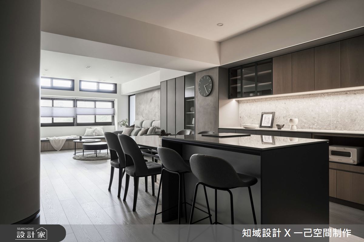 知域設計 X 一己空間制作以木皮染色、大板磚、磁磚、系統櫃、造型木作、特殊塗料的搭配應用,呈現現代風居家氛圍,將此間25坪、兩房、單層、新成屋(5年以下)打造成舒適愜意的家庭空間,完成2位大人全家人的夢想之居。