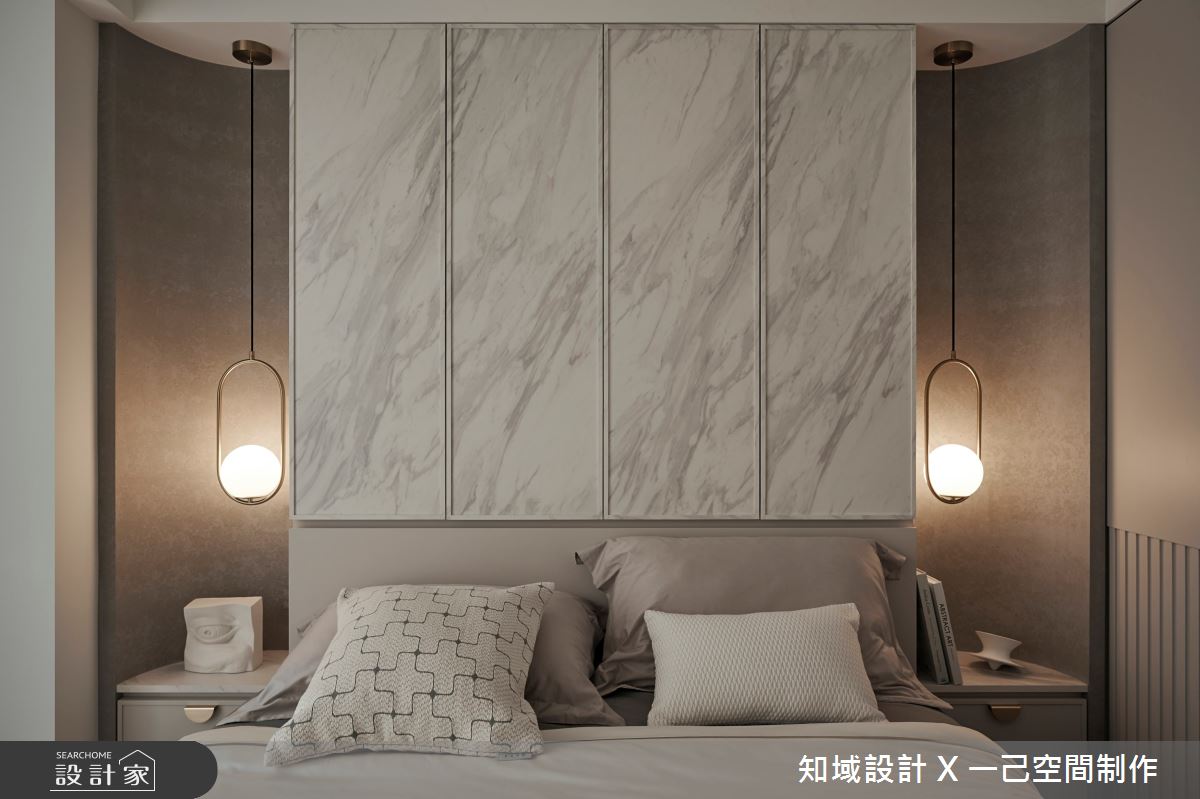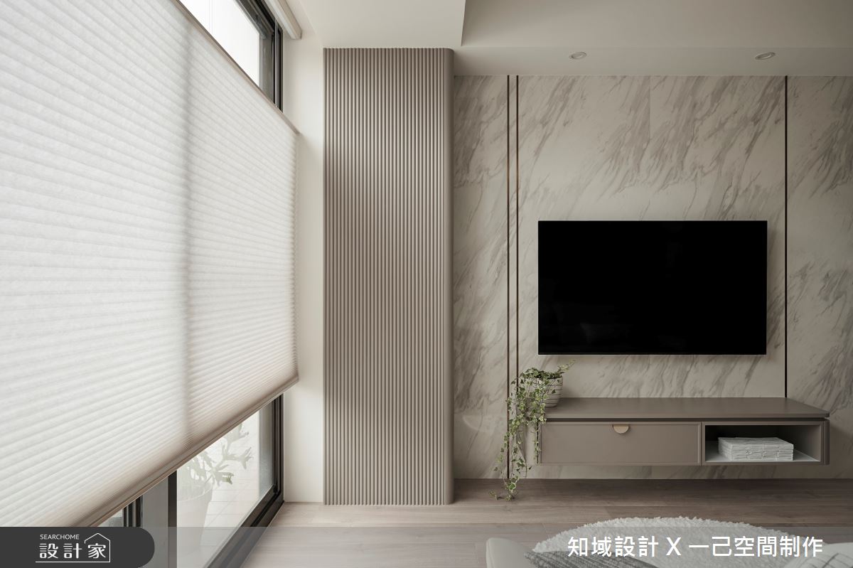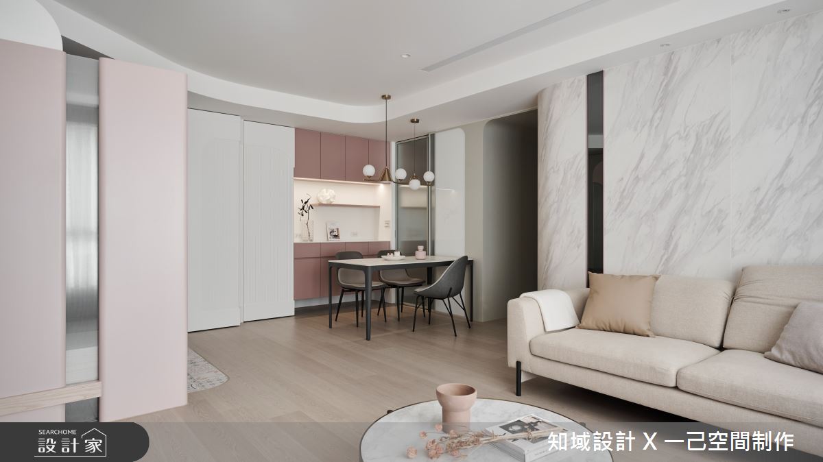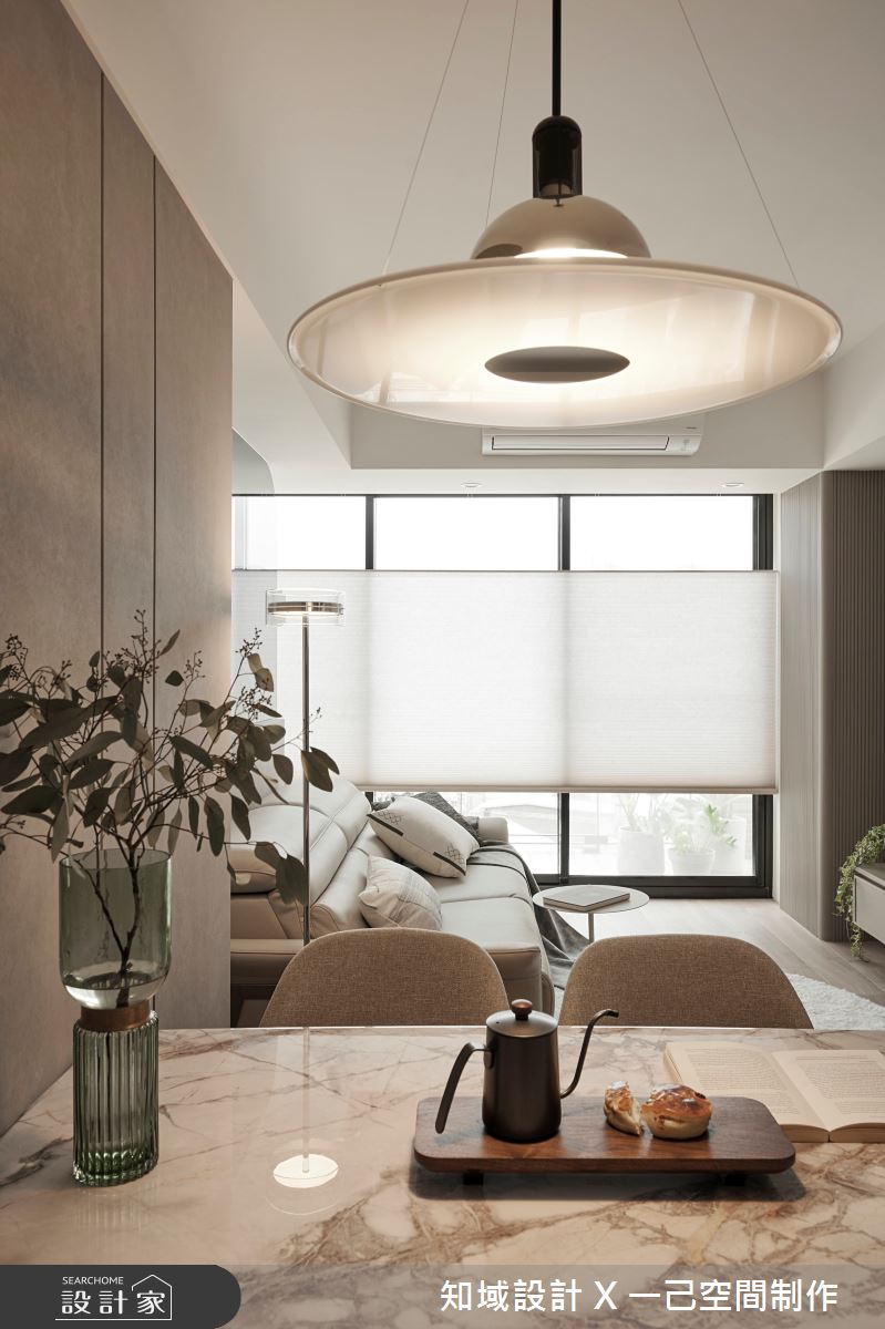 知域設計 X 一己空間制作以大理石、噴漆、實木皮、實木地板、系統櫃、壁布、木作櫃體的搭配應用,呈現混搭風居家氛圍,將此間50坪、兩房、單層、毛胚屋打造成舒適愜意的家庭空間,完成2位大人全家人的夢想之居。