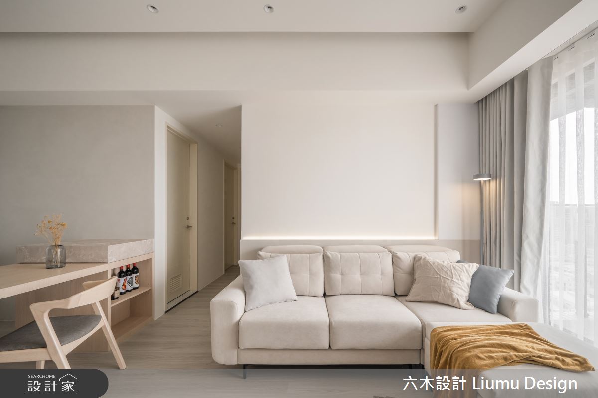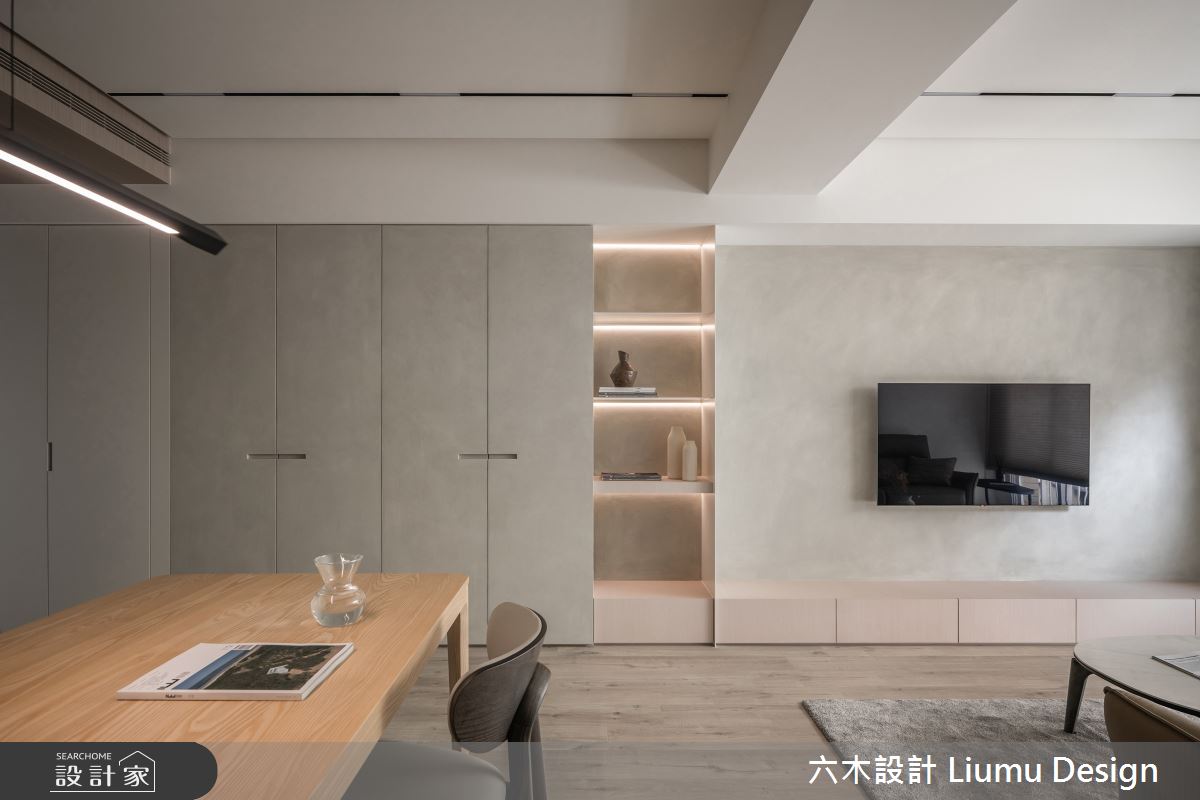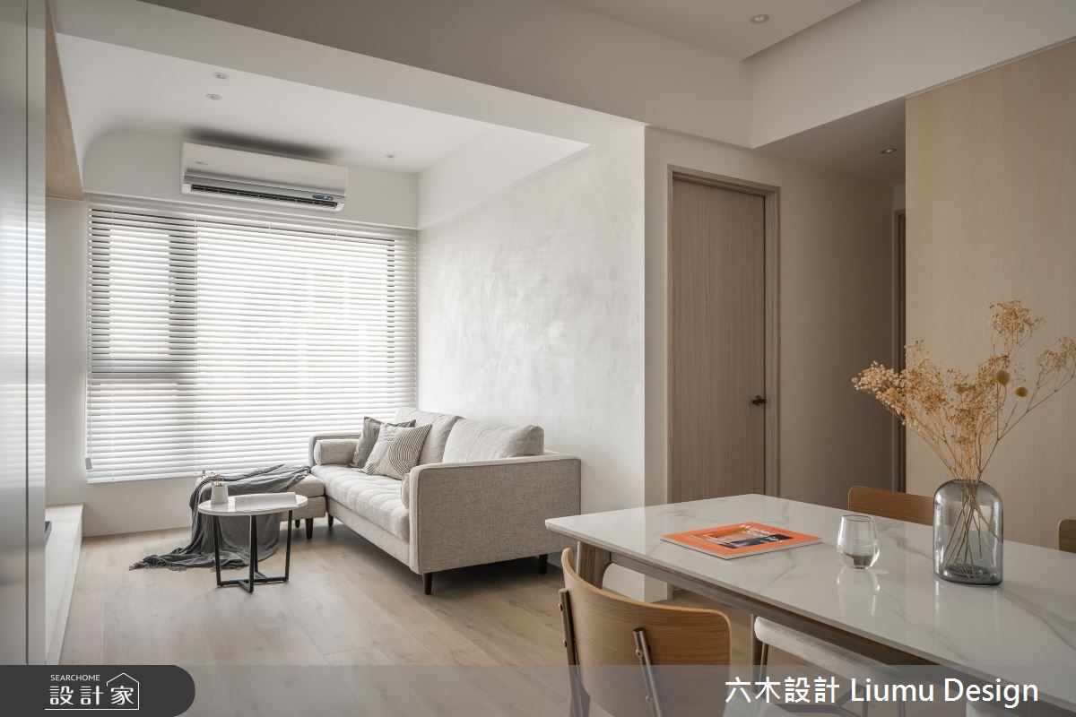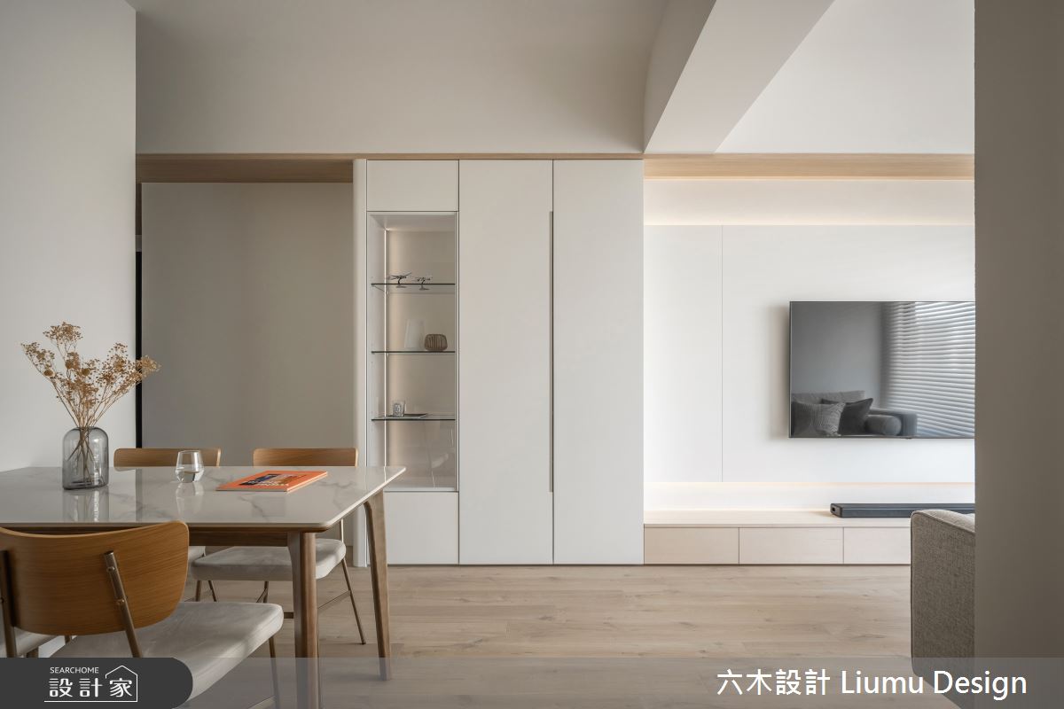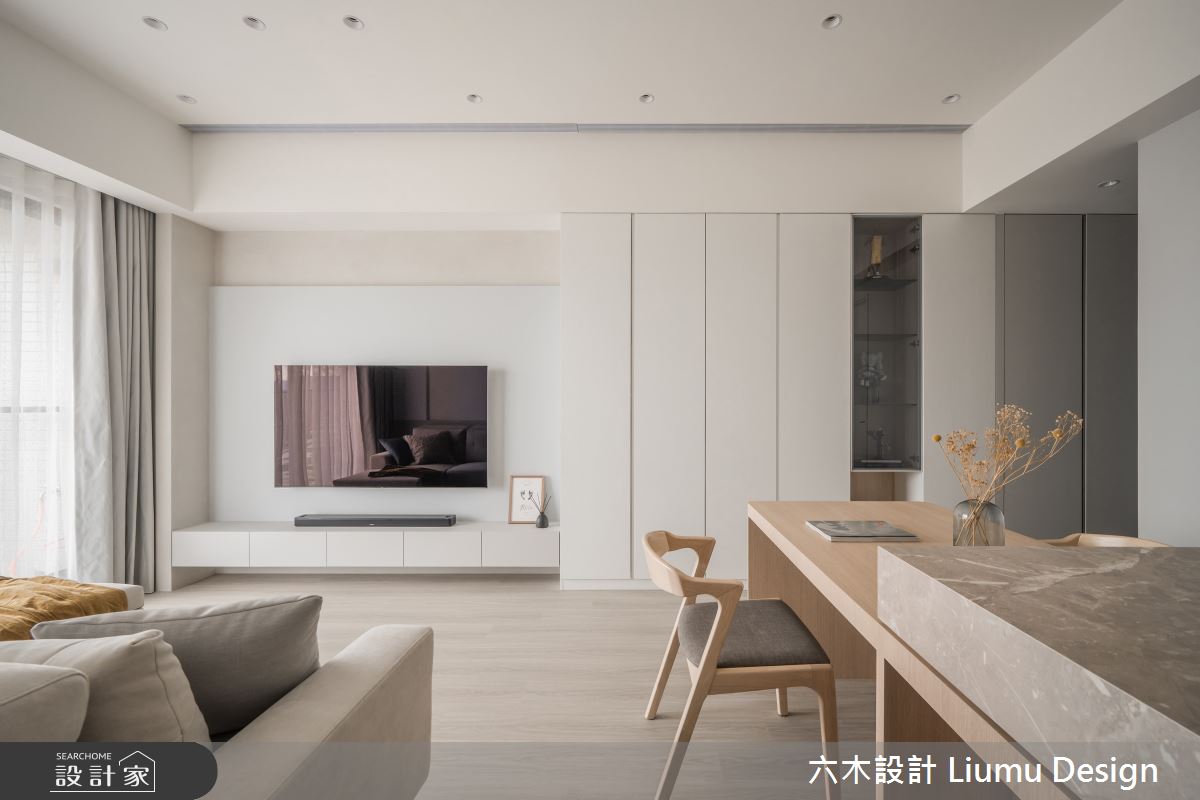 六木設計 Liumu Design以乳膠漆、超耐磨木地板、不鏽鋼、鐵件、灰鏡、木作貼皮、烤漆、鋼刷木皮、磁磚、木百葉、軌道燈、石材、線板、噴漆、藝術塗料、薄板的搭配應用,呈現北歐風居家氛圍,將此間35坪、三房、單層、新成屋(5年以下)打造成舒適愜意的家庭空間,完成2位大人全家人的夢想之居。