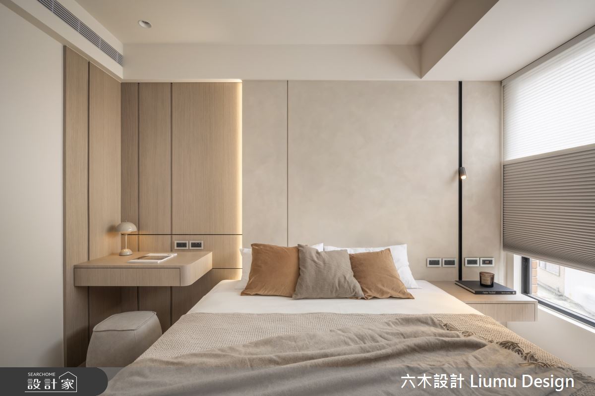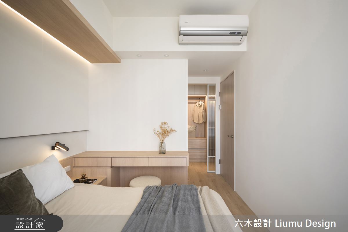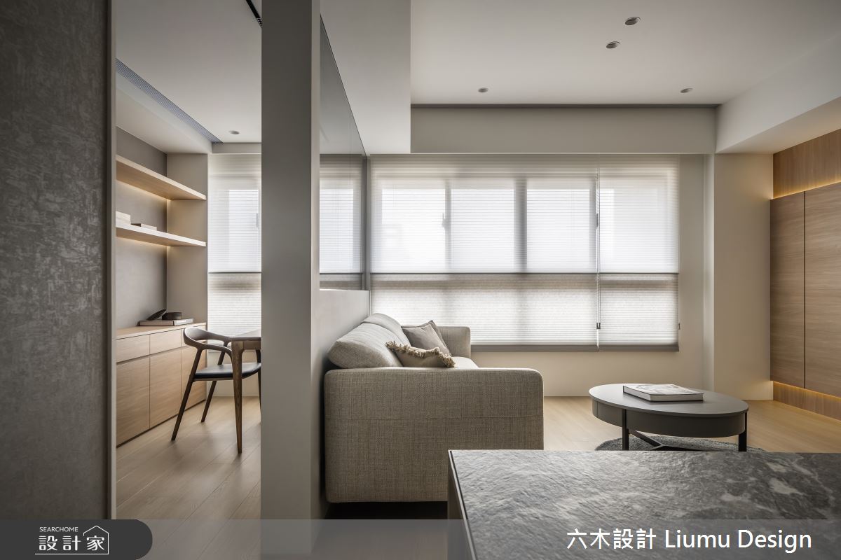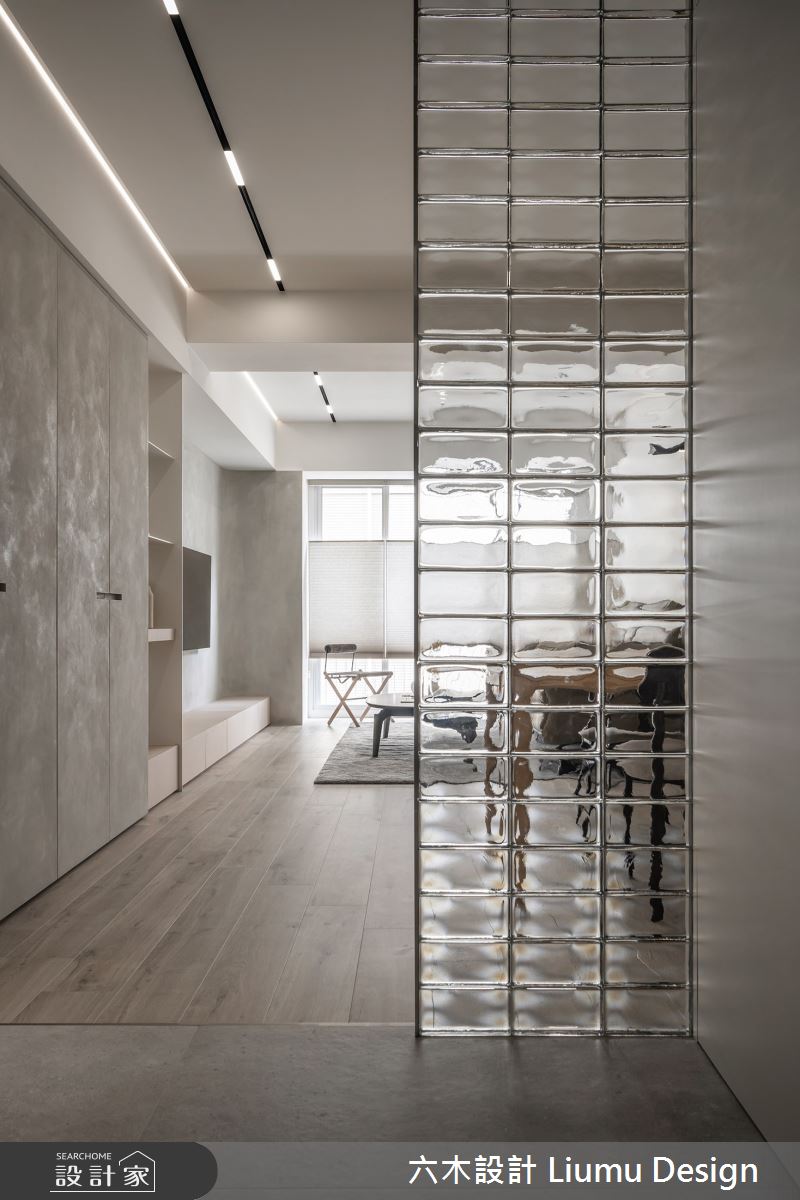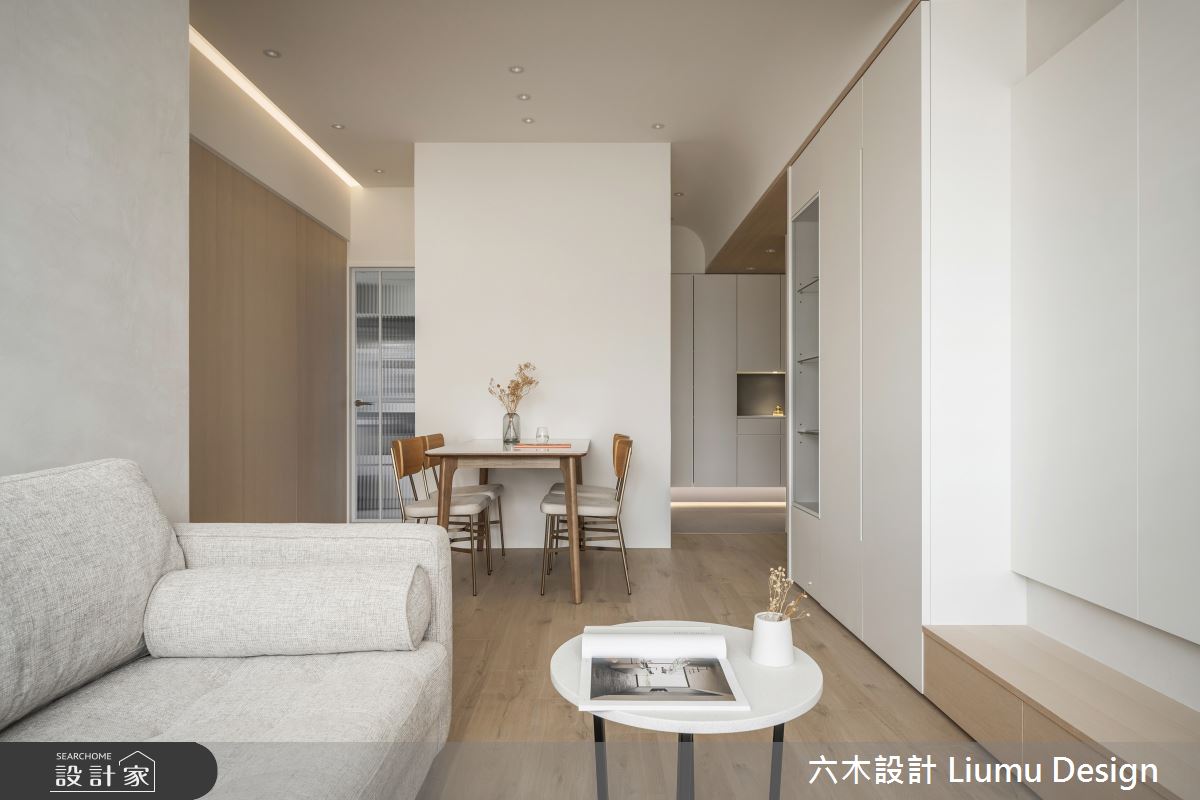 由六木設計 Liumu Design精心規劃的19坪兩房住宅空間,家庭成員一共有2位大人、1位小孩。因應屋主需求,設計師運用現代風作為主軸,搭配乳膠漆、超耐磨木地板、茶玻、木作貼皮、系統板材、磁磚、軌道燈、噴漆、茶鏡、磁吸軌道燈、風琴簾、石英石、強化玻璃,打造全家人的夢想家居。