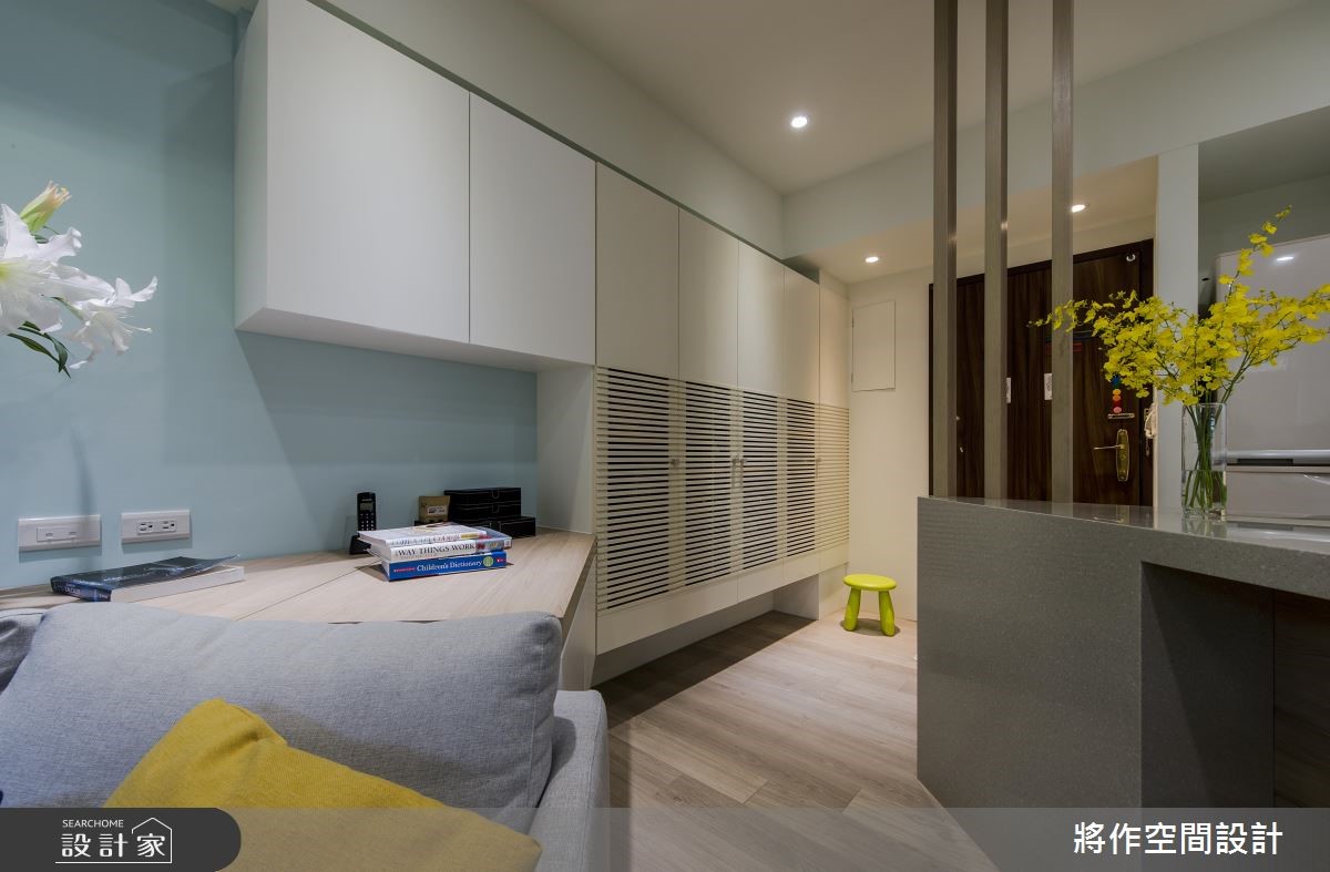 屋主夫婦 10 年前購買的 22 坪居宅,10年後多了新成員,為提供小孩合適的成長環境,設計師微調格局,隔間牆拆除後,以穿透融合的簡約風主軸定義,同時在有限的空間打造 3 房機能,圓滿一家三口的生活。 玄關屏除隔間牆面,改以木作格柵屏風,讓公領域穿透放大,緊接著由底部懸空的 45 度角鞋櫃引導視線延伸。公領域屏除傳統格局規劃,首先迎接的餐廚區與鞋櫃傾斜角度平行,面公領域的坐向安排,讓女屋主備餐時也能與家人互動;而餐桌沿著流理台靠牆設定,劃出順暢回字動線;客廳區利用半圓弧度的沙發位置,串聯窗邊臥榻角落,圍塑客廳完整領域,且緊鄰窗邊擁有充沛採光,配合藍色調沙發及牆面色彩,提供舒適愜意的親子時光;原為半開式設計的書房改以全開放的靠牆書房取代,釋放空間給公領域,視野備感遼闊,而簡練設計中賦予上、下櫃收納規劃,保留藏書需求。 小編的最愛 小孩房湖水藍壁漆、寢具及傢俱互相搭配,表現活潑紓壓的生活場域,大量開放式系統收納設計,提供成長中小孩大量書本收納需求;另外,設計師發揮巧思,利用收納櫃、衣櫃擺放位置,將不方正的格局缺點化為優勢,圍塑靠窗角落的獨立感化身小更衣地帶,讓臥房擁有 2 種格局機能。