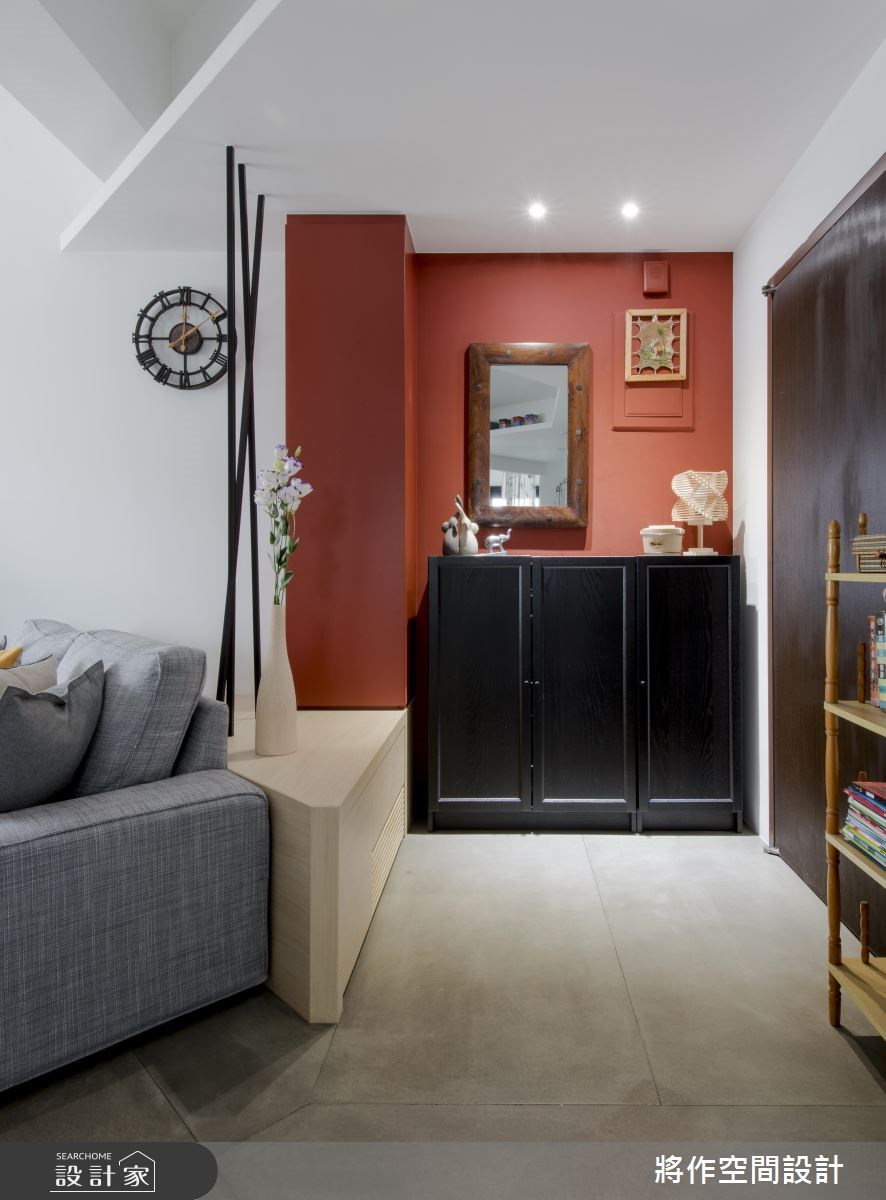 回到家就想好好放鬆,不想有太多侷限,屬於夫妻兩人的 20 坪 Loft風居宅,本身就有不錯的採光,設計師透過斜向的空間設計方式,不但每個空間更加寬敞、明亮,環形的動線也讓走動變得彈性而自由,搭配一面復古紅磚牆,以及屋主收藏的家具擺設,更帶來隨興、輕鬆的生活感。 玄關處的紅色牆面,搭配黑色的櫃體,形塑出鮮明而大膽的色彩對比,再向公領域望去,設計師以不更動廚房、衛浴的前提,將客廳、餐廳、廚房斜向依序展開,公領域和臥室得以獲得更寬闊的空間感,也減省了變更格局的預算。由於屋主的職業為文字工作者,擁有豐富的藏書,室內可見數座大書櫃與落地窗交錯分立,設計師在閱讀區中融入了「和室」概念,藉由架高的木地板,提供了可舒適坐、臥的生活型態,並把動線和書櫃延伸至臥室內,讓閱讀與生活有了更多的連結。主臥室為雙動線設計,背牆運用薰衣草紫,挹注了浪漫柔和的感受,動線底端則可通往更衣室和衛浴,挹注套房式的完整機能性。 小編的最愛 看不出實際僅有 20 坪,設計師透過開放式的空間設計,讓動線、視野更加開闊而自由,復古的紅磚牆捎帶了些許工業風獨特個性,加上公仔、古董鐘等收藏擺設,洋溢著簡單、自在的生活趣緻。