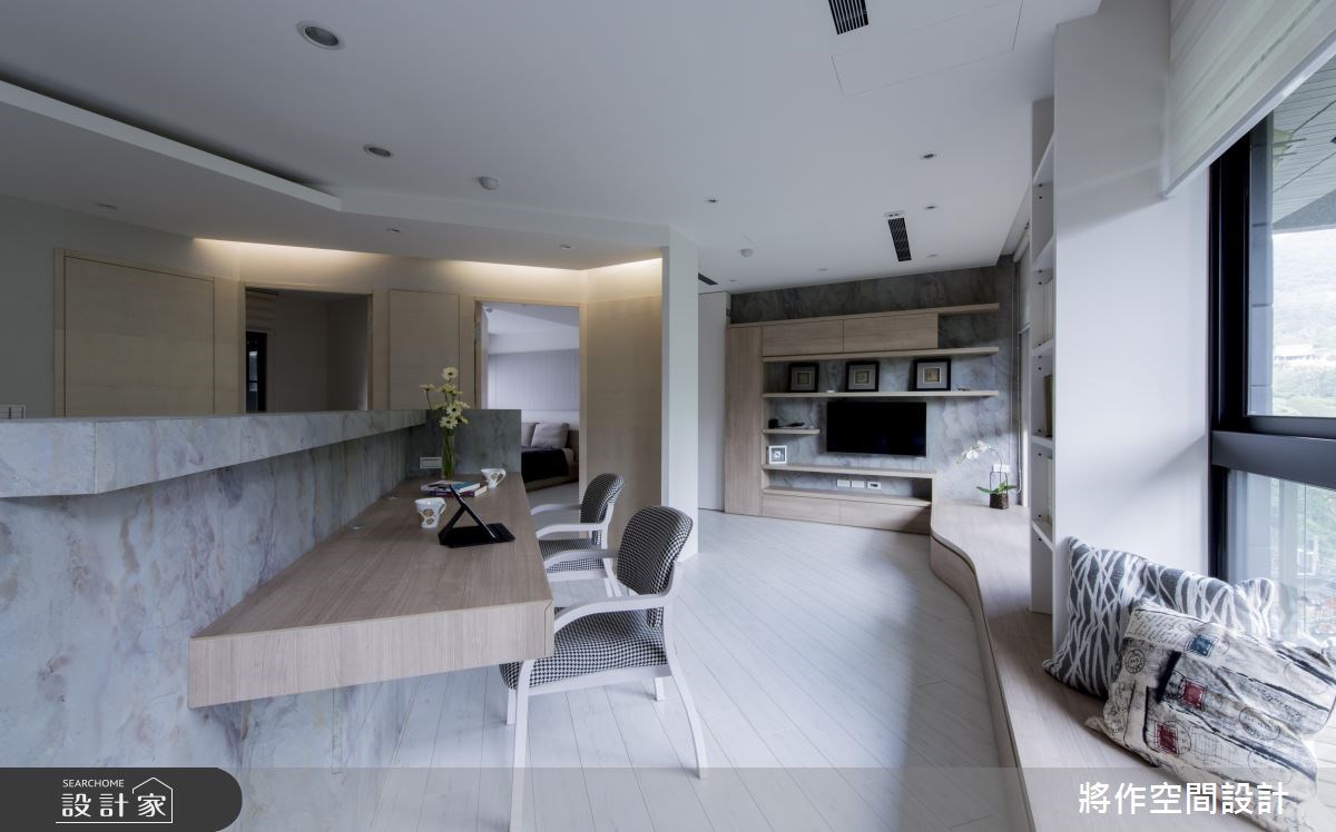 小夫妻購入的 12 坪新居由於坪數有限,加上建商提供的廚具置於格局中心,讓整體空間難以規劃。將作設計利用弧形設計突破限制,達到空間放大、暢通動線的目的,成功讓坪效翻倍。 以全開放設計串連公領域空間,並將收納機能整併於左側玄關,利用弧形收納櫃面與架高地坪巧妙產身視覺延伸,並劃分各個領域,接著把電視牆置於長邊訂出適當軸距,解決不知如何擺放的問題。為了使單面採光的效益發揮至最大,將臥房與複合式書房安排在臨窗處,並在書房採用透光拉門,兼具隱私與亮度。由於人口單純,以吧台桌取代餐桌,同時成為客廳與廚房的鏈結,也兼具主臥的視覺屏蔽。在不更動格局的情況下,保留原始廚具位置,並將冰箱安插於電視牆後方的銳角中,成為開放設計的場域劃分。針對收納需求,為了讓坪效能發揮至最大,將櫃體沿壁面收攏,主臥更善用床頭柱體的畸零地,型塑了衣櫃收納。 小編的最愛 為了配合弧形設計,設計師更訂製了弧形沙發與弧形吧台桌,讓整體視覺能夠達成完整的和諧,更顯示了設計師對於細節的用心。