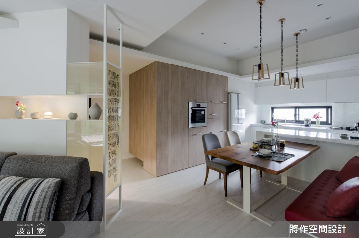 由將作空間設計精心規劃的22坪兩房住宅空間。因應屋主需求,設計師運用現代簡約風作為主軸,搭配超耐磨木地板、大理石、鋁合金、富美家美耐板、玻璃,打造全家人的夢想家居。