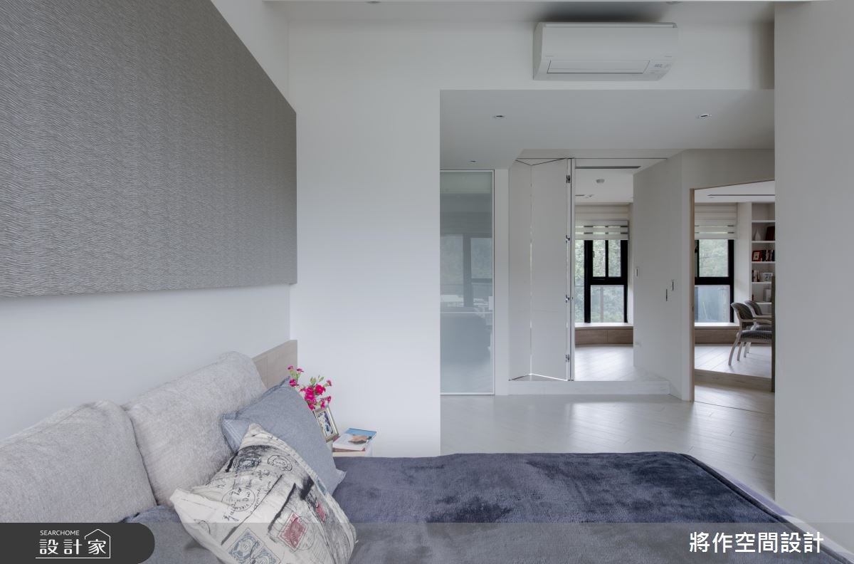 設計師打破空間規劃的框架,藉由循環的動線設計,將 23.5 坪退休宅的各個格局串聯在一起,減少坪數的浪費,幫熟齡夫妻營造出白淨又高機能的舒適居家。 室內透過傾斜的角度,安排作為空間核心的客廳,左側通往臥房區域,右側為玄關及餐廚空間,後方則是玻璃拉門分隔的書房,把居家塑造成循環的動線,融入廊道於室內,放大空間利用。而整體色調以純白為主,讓視覺更加開闊,並使用兩張藍色的單椅,達到跳色的效果,增添空間的時尚氣息。 因為屋主擁有大量的藏書,所以設計師沿著公領域的採光面,設置開放式書櫃及臥榻,連結起書房、客廳和臥房,當拉門全都打開時,屋主夫妻就可以自在穿梭其間。餐廳在牆面嵌入白色收納櫃,側邊利用展示架表現屋主品味,且搭配弧形的木作桌面,兼顧電器使用的機能性。 小編的最愛 屋主夫妻可以運用書房、臥房的拉門開闔,隨時轉換空間尺度,同時讓彼此能夠相互照應,提高生活安全。