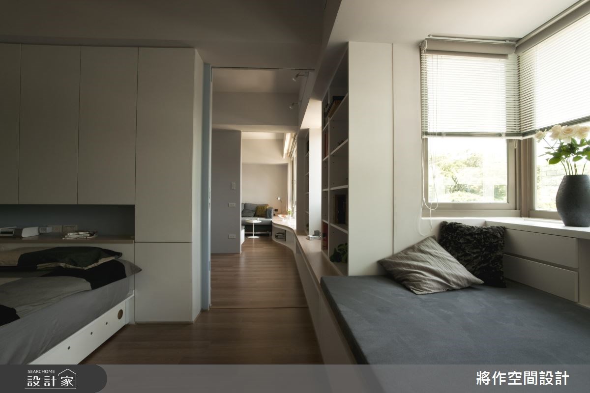 33 坪中古屋,設計師運用簡約的北歐風語彙,並改善居家動線,重塑自然簡約的生活場景,同時改建封閉性廚房,將後陽台的戶外風景與採光援引入室,打造出充滿療癒感的清新視野,快跟著小編一起來看看吧! 居宅整體摒棄過多色彩,回歸簡單的色彩基調,並運用靠窗的長廊串起動線,巧妙銜接公領域及寢臥地帶,不只促進採光與場域互動,更集結窗景、書牆、臥榻、收納等各項主題,形成一道機能性十足的過道;而住宅中的結構柱、大樑則不做過多修飾,讓其各自分佈,促成領域之間的自然界定,餐廚、客廳、起居間亦呈現開放式規劃,保有陽光與空氣的通暢流動;廚房外的陽台更給予重新配置,透過木地板的鋪設,搭配室內植栽與遼闊綠景,以及書桌椅的陳列,讓此區成為屋主專屬的休憩閱讀天地! 小編的最愛 寢臥突破了空間阻斷,讓洗手檯與衣櫃一體成型,再藉由彈性拉門打造半開放式衛浴,使衛浴與臥室產生連結,不僅有效利用坪效,也創造了設計趣味!