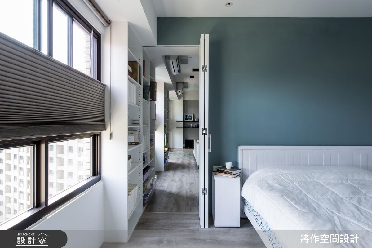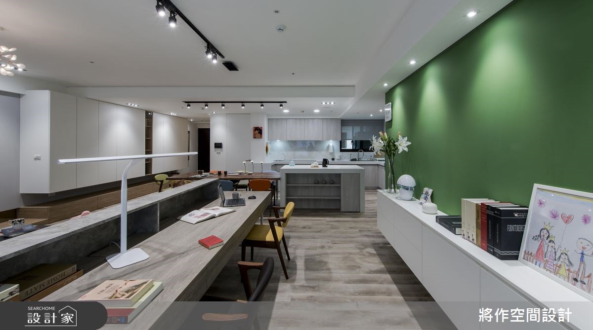 35.5 坪居家,設計師以現代風作為基調,透過在動線與格局的拓展延伸,打造出空間放大感,同時強調收納機能的擘畫,做出輕盈美型的櫃體表情,加以重點色彩妝點,打造出年輕、時尚且機能十足的生活場域,快跟著小編一起來看看吧! 公領域,將客廳、餐廚、書房以開放式手法互相串連,減少隔間牆的施作,使場域運用更加靈活,讓視覺尺度備感寬敞,並加入跳色手法,藉由家具的輕盈色彩點綴,增添居家中的朝氣活力,尤其書房的一整面綠色背景,更在光線烘托之下,營造出有如大自然的綠野風情,形成亮眼的立面風情;書房、客廳之間,採用輕巧的矮牆隔間做界定,讓空間感得以共享,也拓增書桌前方的收納機能;餐廚,呈現開放格局,將吧檯及餐桌做出連結,加以主燈定義用餐範圍,形塑充滿互動感的寬闊情境,並在吧檯量體底下結合置物功能,善用每一吋坪效! 小編的最愛 臥房選用天藍色定調主題,釋放出自然魅力,並透過櫃體造型、收納機能的合宜配置,圍塑開放式的更衣區塊,導引臥眠、更衣與衛浴之間的流暢動線!