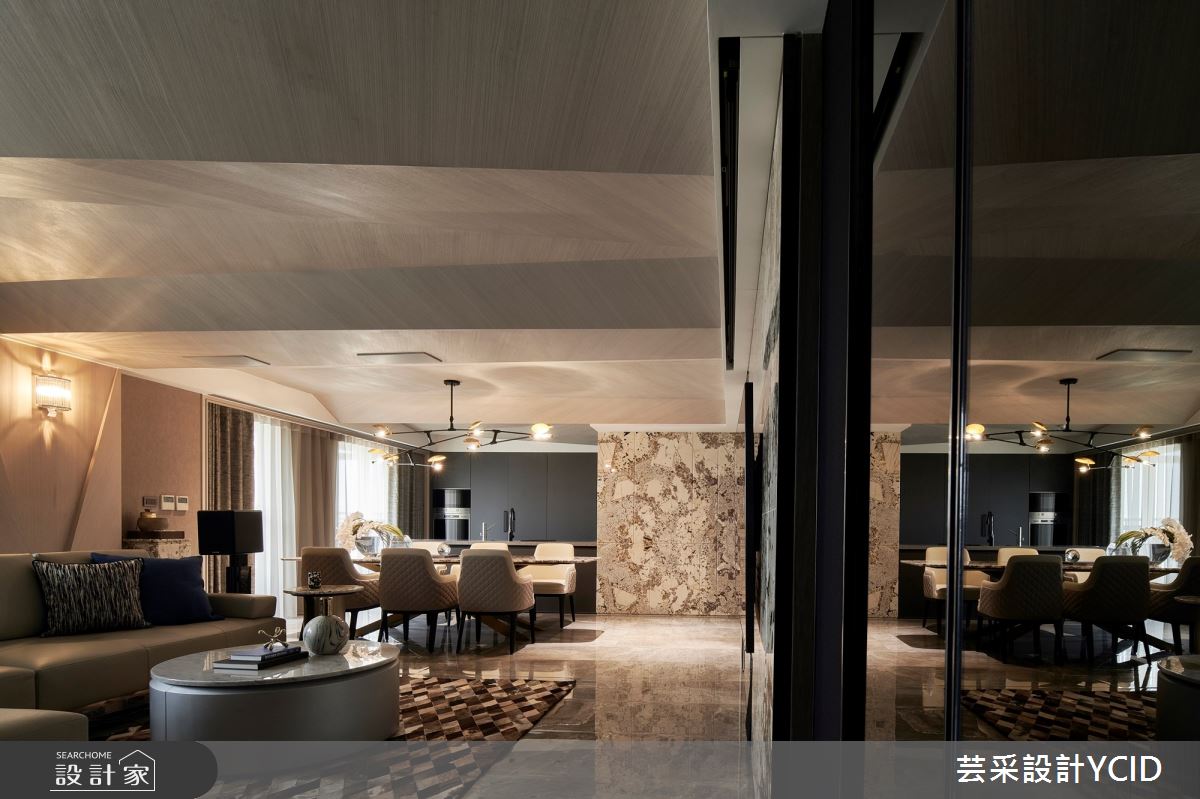 105 坪新古典風精品宅,利用大理石、壁紙等材質相互搭配,一一呈現空間質感。為符合女屋主時尚品味及考慮到屋主工作常需時常造訪不同國家,因此營造紓壓且優雅氛圍,讓屋主回到家能深度放鬆。 入門後第一眼看見的端景牆,成功隱形無法更動的管道間,利用端景牆成功將客、餐廳作區分,並運用藝術品裝飾,呈現精緻質感空間氛息。餐桌刻意選用圓桌,柔化空間,順暢動線,並利用角落展示壁櫃增加空間機能。客廳區,窗台預留檯面的貼心設計,為喜愛在窗台邊擺放蠟燭及檯燈的女主人實現夢想空間。廊道則是利用展示收納方式,完美呈現屋主收藏,且設計師希望空間線條簡約不繁複,因此簡化線板並以鍍鈦方式將優雅感覺呈現出來,營造美式清新兼具法式浪漫質感。廊道端景擺設一座沙發,具轉換公、私領域意味,並可作為閱覽休憩區。 小編的最愛 格局重整後,將零碎空間打造成女主人的更衣室,並利用大膽紅色系布幔,呈現女主人個人喜好及時尚品味。