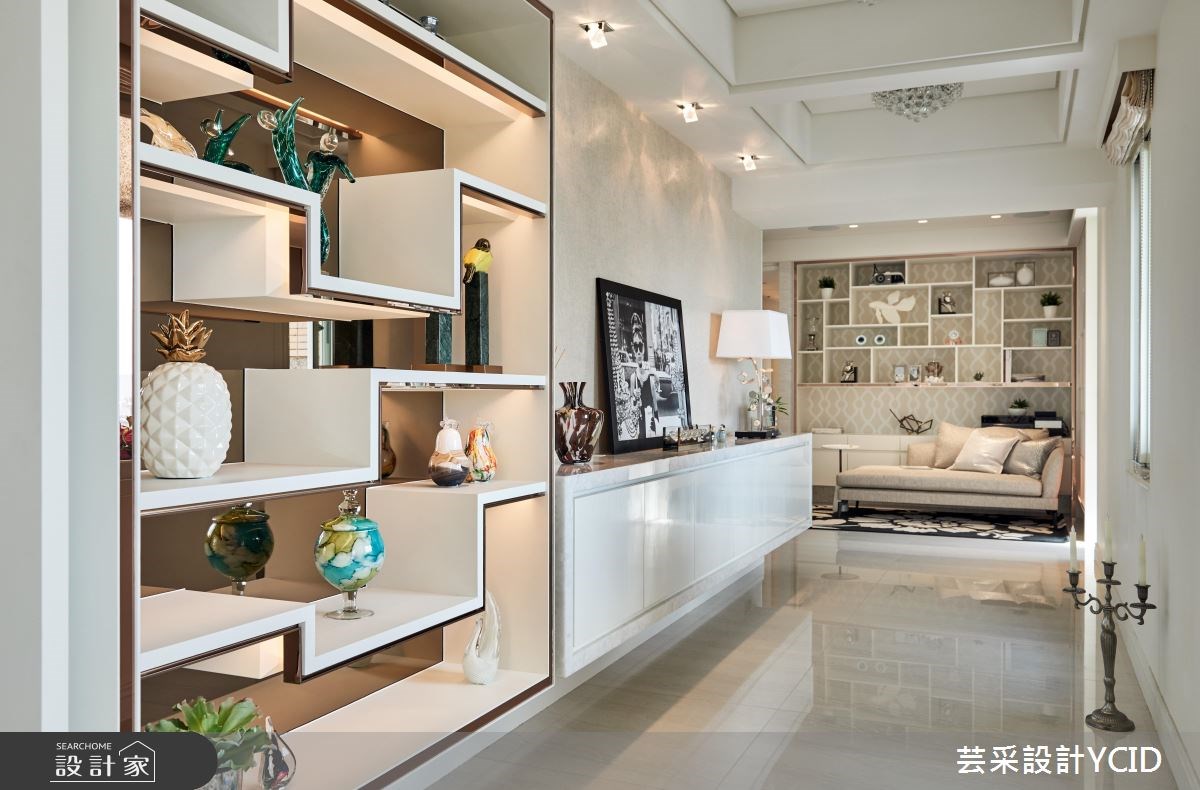 105 坪新古典風精品宅,利用大理石、壁紙等材質相互搭配,一一呈現空間質感。為符合女屋主時尚品味及考慮到屋主工作常需時常造訪不同國家,因此營造紓壓且優雅氛圍,讓屋主回到家能深度放鬆。 入門後第一眼看見的端景牆,成功隱形無法更動的管道間,利用端景牆成功將客、餐廳作區分,並運用藝術品裝飾,呈現精緻質感空間氛息。餐桌刻意選用圓桌,柔化空間,順暢動線,並利用角落展示壁櫃增加空間機能。客廳區,窗台預留檯面的貼心設計,為喜愛在窗台邊擺放蠟燭及檯燈的女主人實現夢想空間。廊道則是利用展示收納方式,完美呈現屋主收藏,且設計師希望空間線條簡約不繁複,因此簡化線板並以鍍鈦方式將優雅感覺呈現出來,營造美式清新兼具法式浪漫質感。廊道端景擺設一座沙發,具轉換公、私領域意味,並可作為閱覽休憩區。 小編的最愛 格局重整後,將零碎空間打造成女主人的更衣室,並利用大膽紅色系布幔,呈現女主人個人喜好及時尚品味。