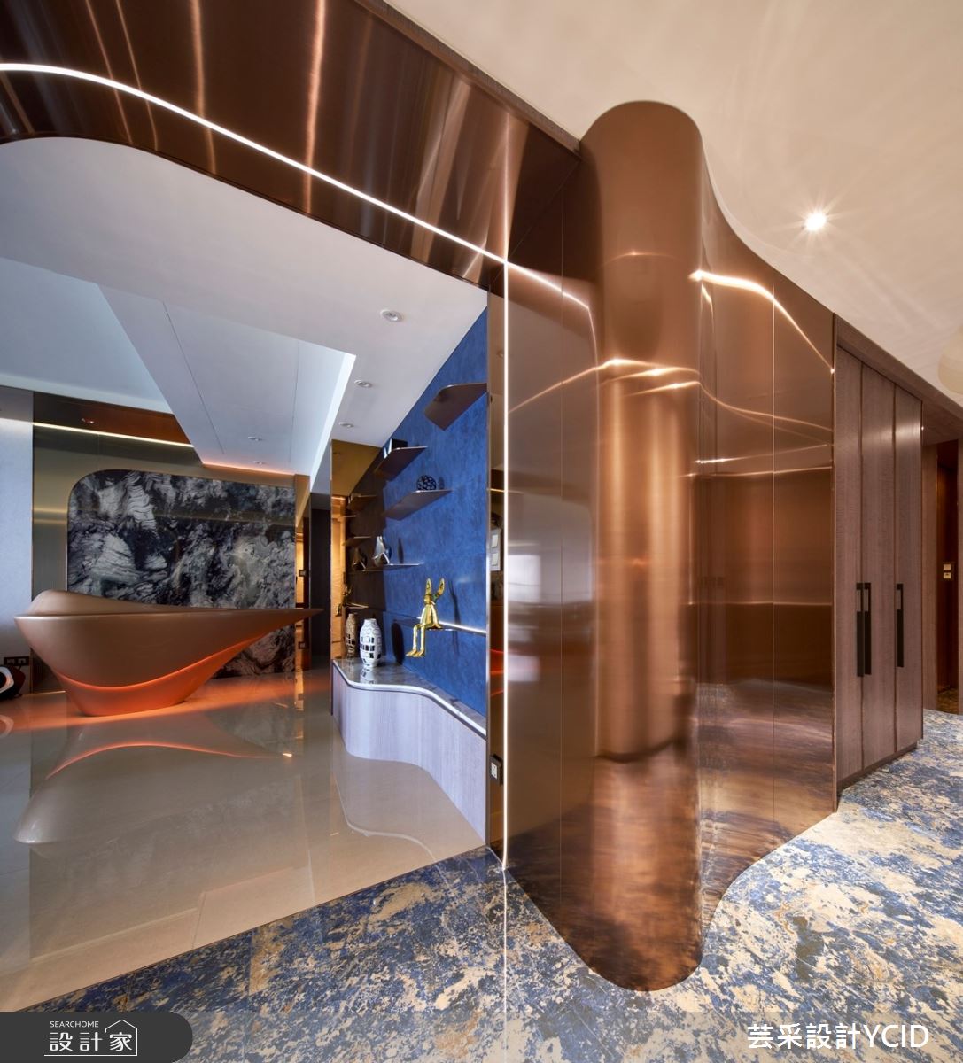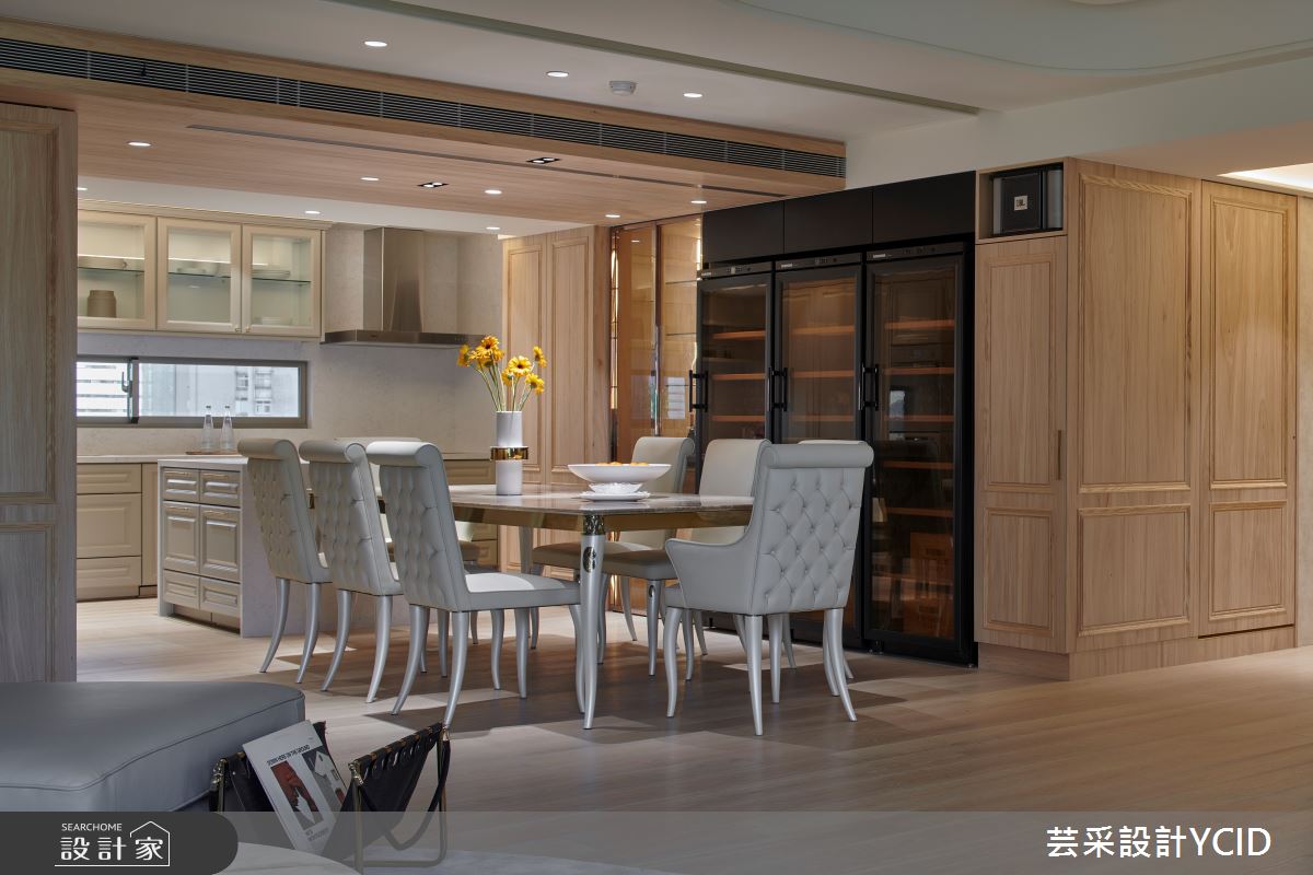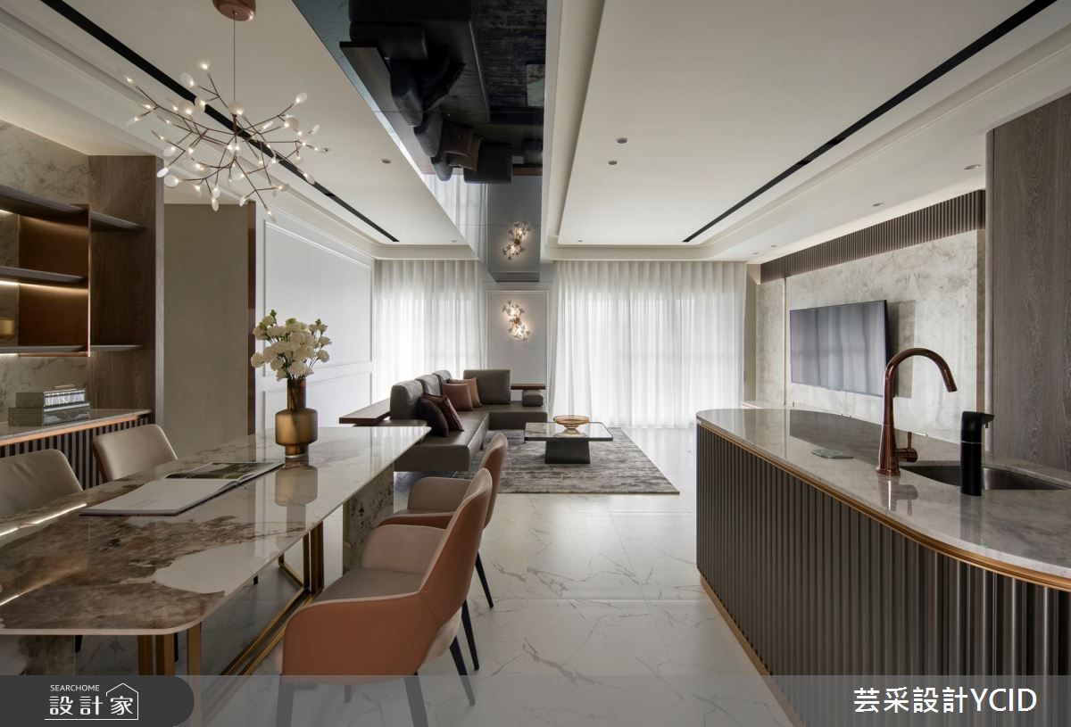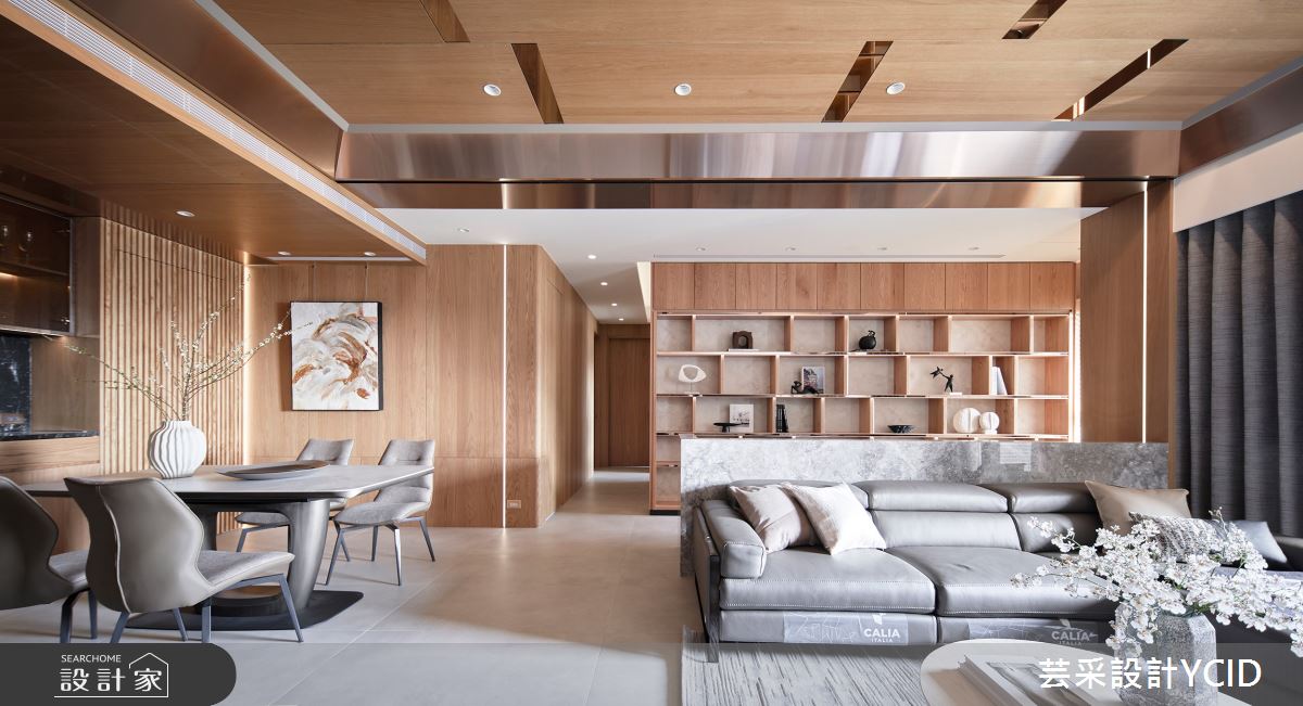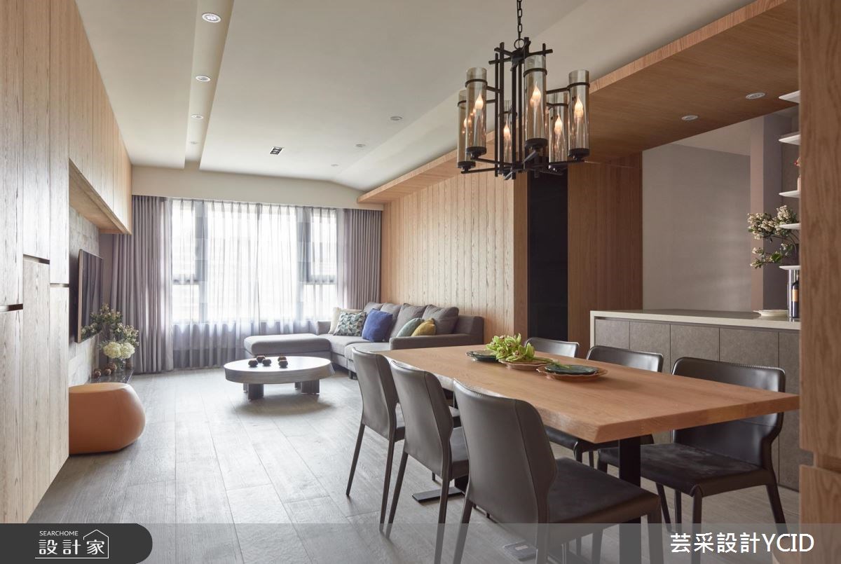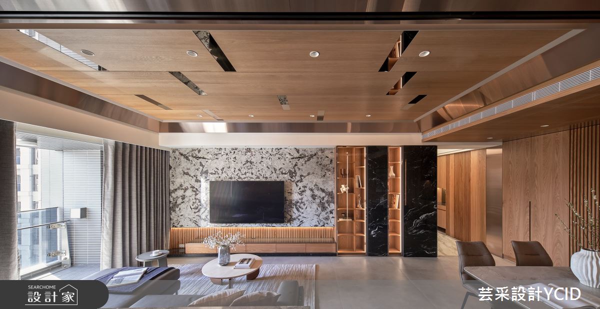 芸采設計以壁紙、水泥漆、超耐磨木地板、鐵件、灰鏡、茶玻、鍍鈦金屬、木作貼皮、系統板材、大理石、木百葉、皮革、噴漆、實木的搭配應用,呈現混搭風居家氛圍,將此間50坪、三房、單層、新成屋(5年以下)打造成舒適愜意的家庭空間,完成2位大人、2位小孩全家人的夢想之居。