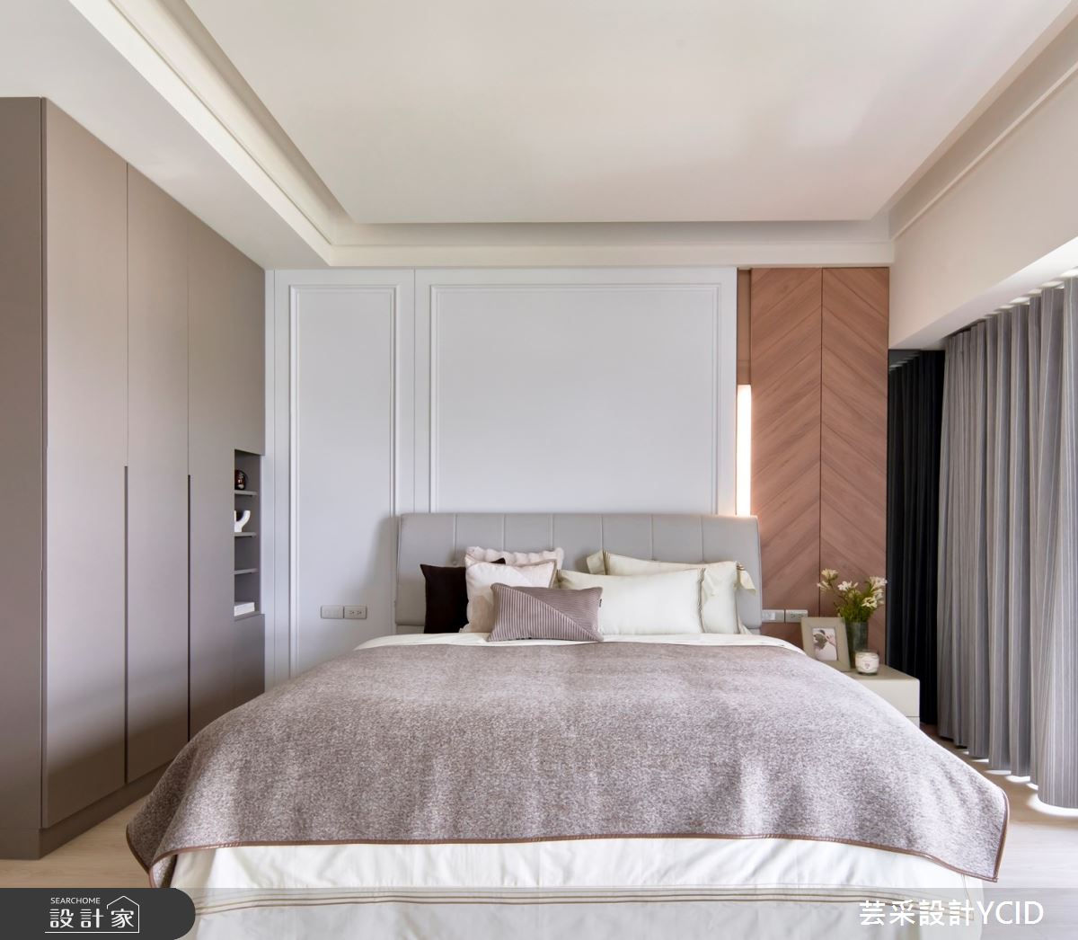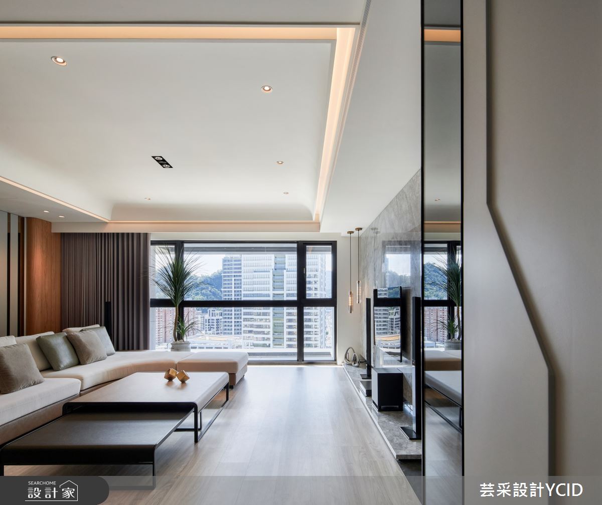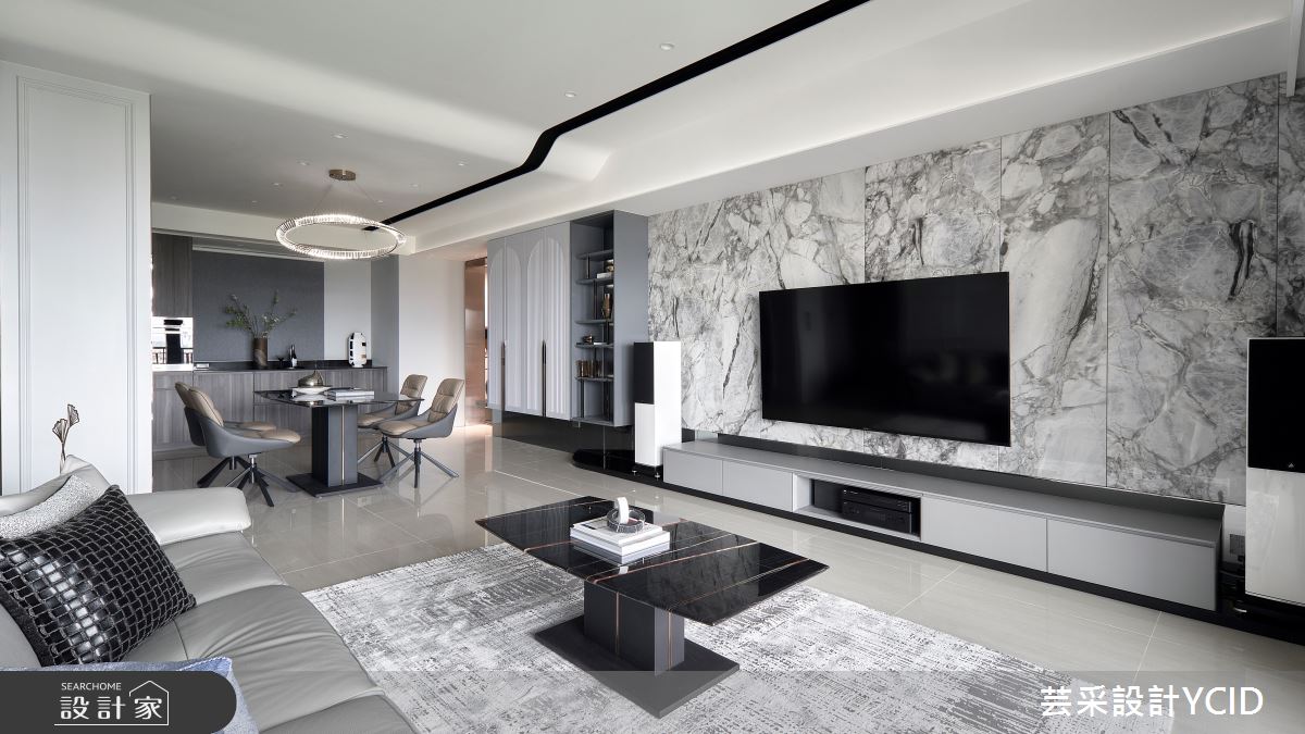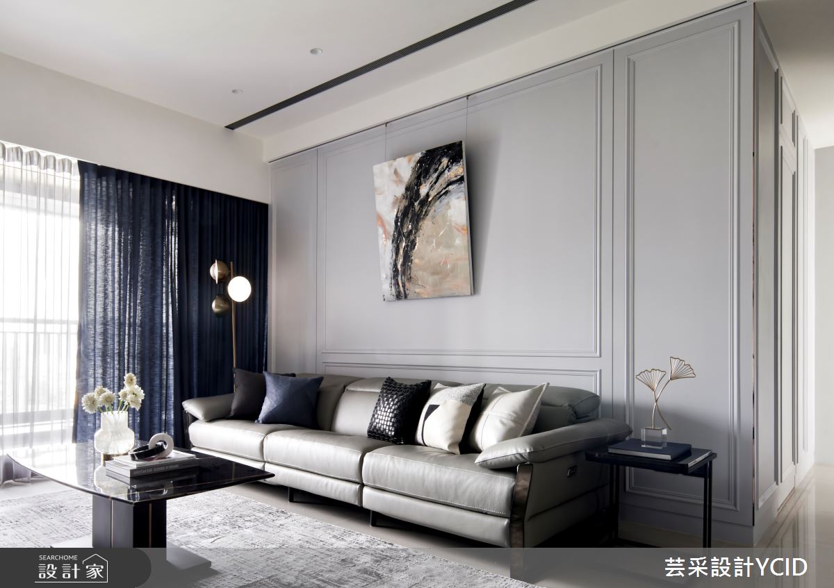 芸采創意空間設計以乳膠漆、壁紙、木紋磚、石英磚/拋光石英磚、鐵件、灰鏡、茶玻、鍍鈦金屬、木作貼皮、系統板材、大理石、磁磚、人造石、軌道燈、皮革、繃布、噴砂玻璃、特殊漆、造型洞洞板的搭配應用,呈現混搭風居家氛圍,將此間100坪、四房、單層、新成屋(5年以下)打造成舒適愜意的家庭空間,完成2位大人、1位小孩、1位長輩全家人的夢想之居。