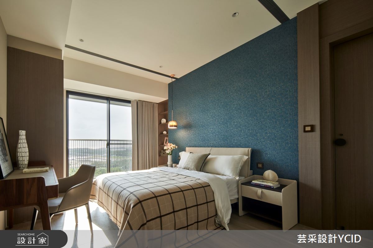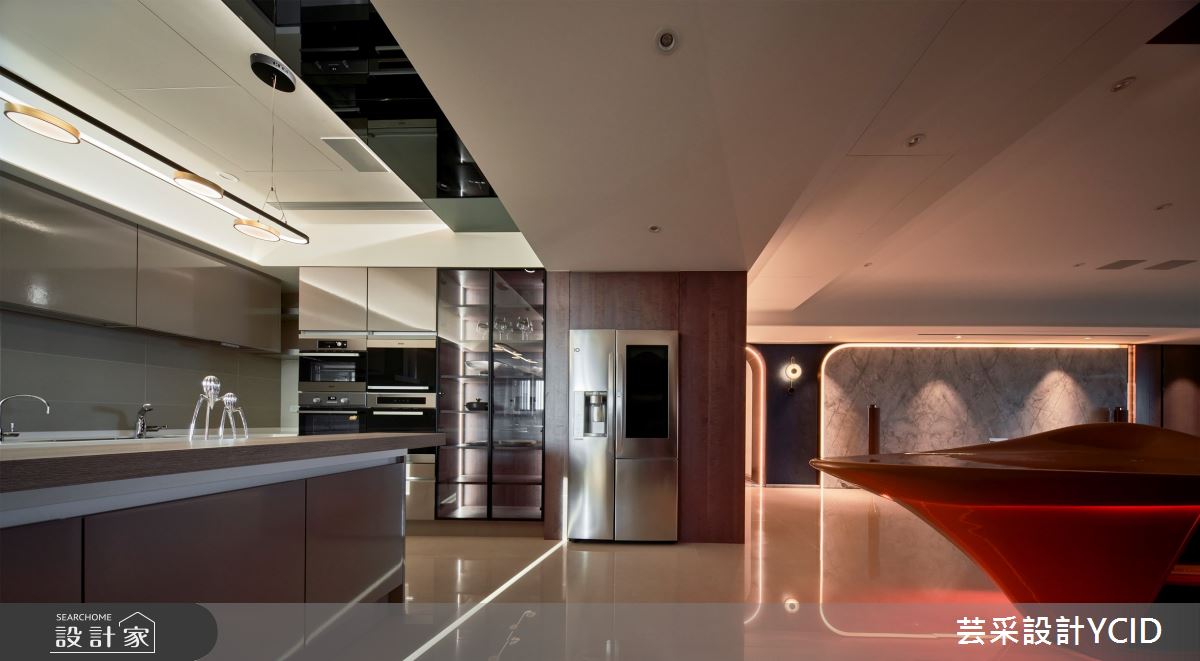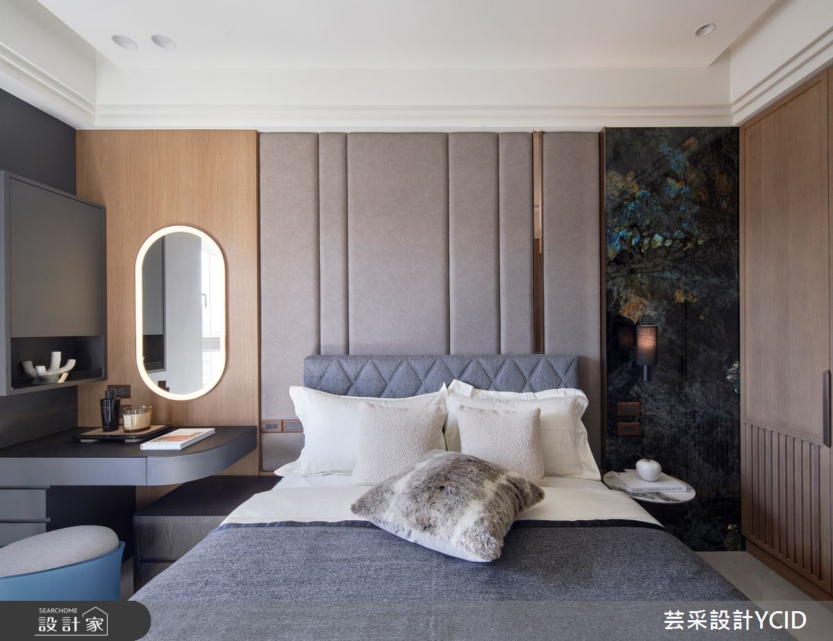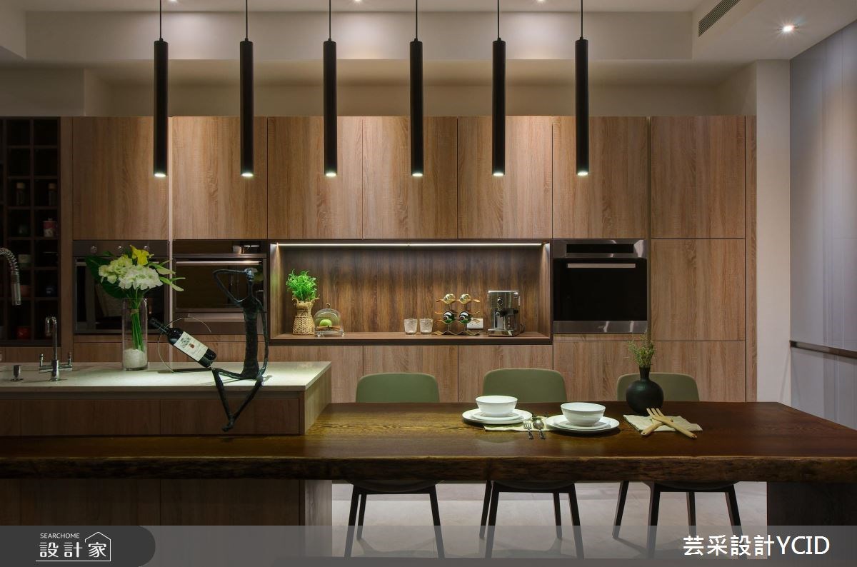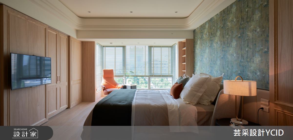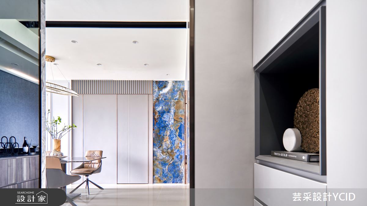 芸采創意空間設計以乳膠漆、壁紙、木紋磚、石英磚/拋光石英磚、鐵件、灰鏡、茶玻、鍍鈦金屬、木作貼皮、系統板材、大理石、磁磚、人造石、軌道燈、皮革、繃布、噴砂玻璃、特殊漆、造型洞洞板的搭配應用,呈現混搭風居家氛圍,將此間100坪、四房、單層、新成屋(5年以下)打造成舒適愜意的家庭空間,完成2位大人、1位小孩、1位長輩全家人的夢想之居。