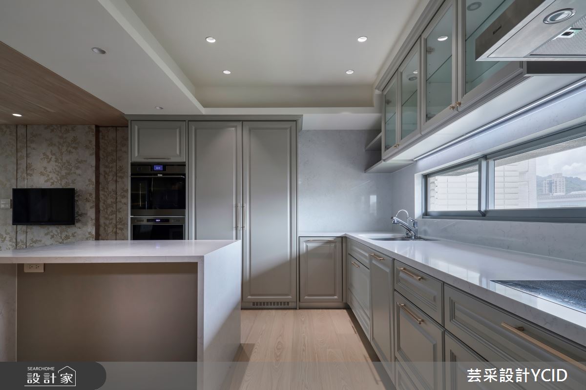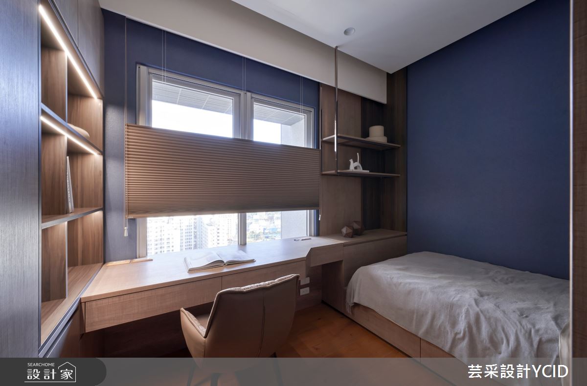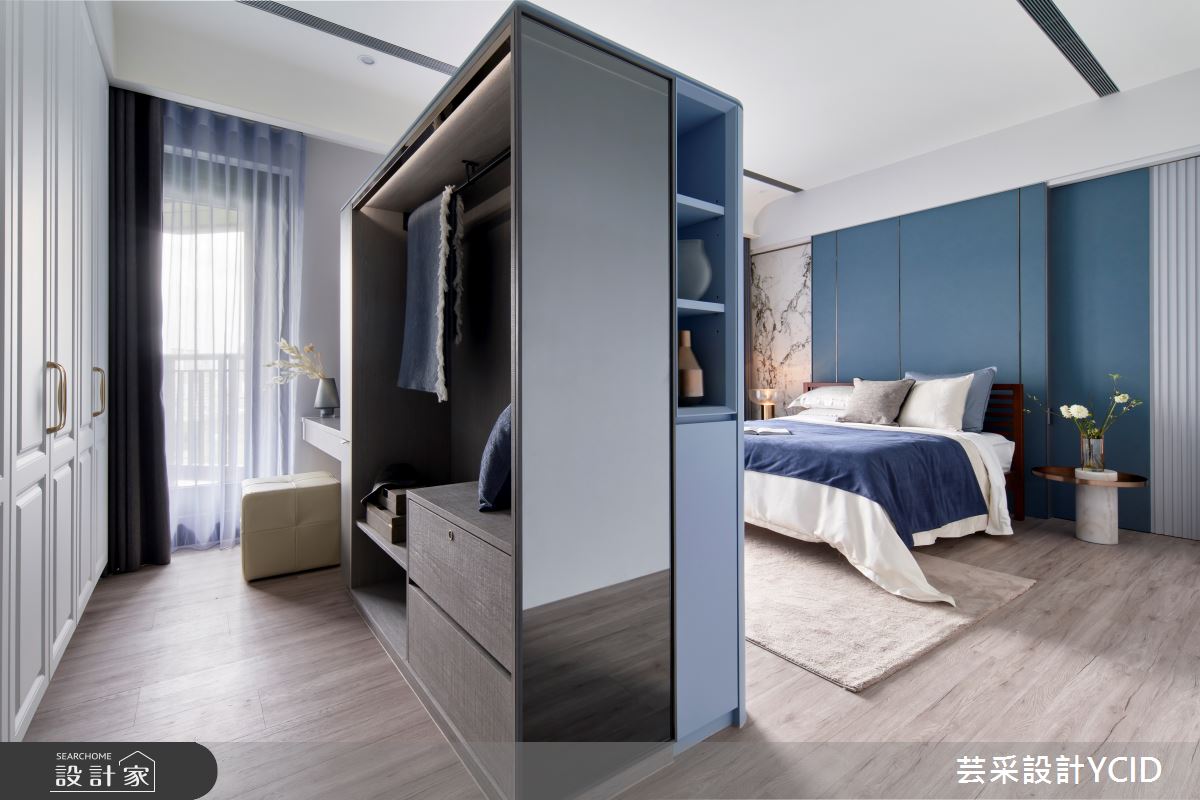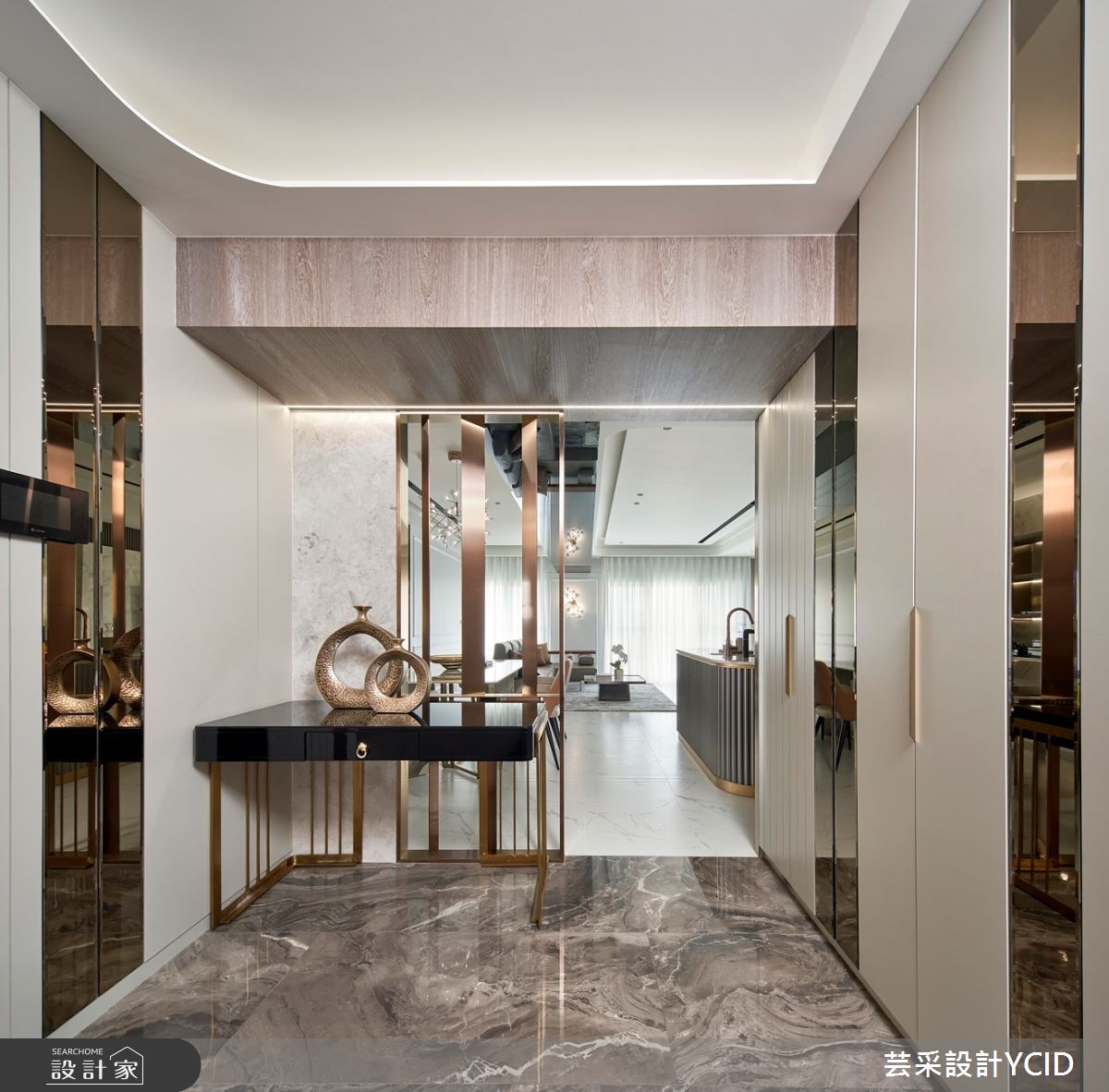 芸采創意空間設計以乳膠漆、壁紙、木紋磚、石英磚/拋光石英磚、鐵件、灰鏡、茶玻、鍍鈦金屬、木作貼皮、系統板材、大理石、磁磚、人造石、軌道燈、皮革、繃布、噴砂玻璃、特殊漆、造型洞洞板的搭配應用,呈現混搭風居家氛圍,將此間100坪、四房、單層、新成屋(5年以下)打造成舒適愜意的家庭空間,完成2位大人、1位小孩、1位長輩全家人的夢想之居。